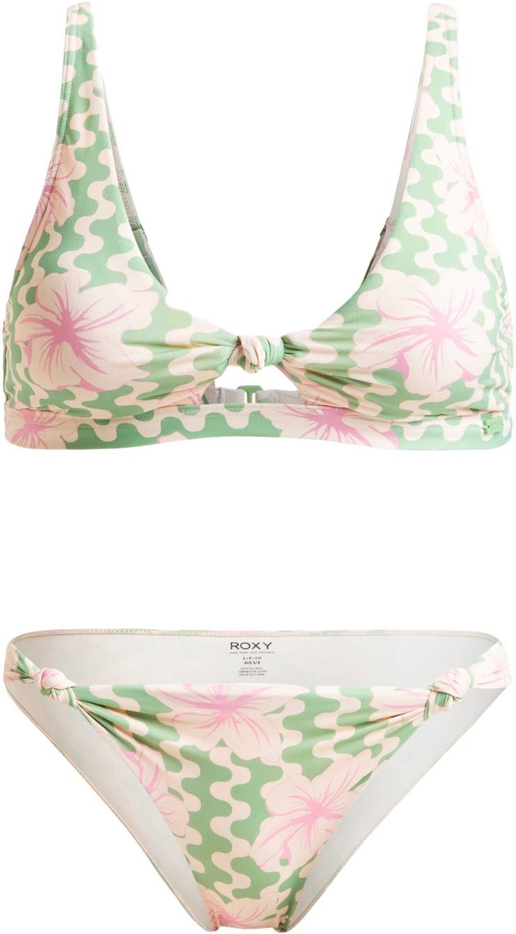Roxy Hibiscus Daze Elongated Tri St Basil Party Waves Yw : maillot de bain deux pièces femme en nylon recyclé, triangle ajustable et bas noués pour un maintien personnalisé au bord de l’eau.