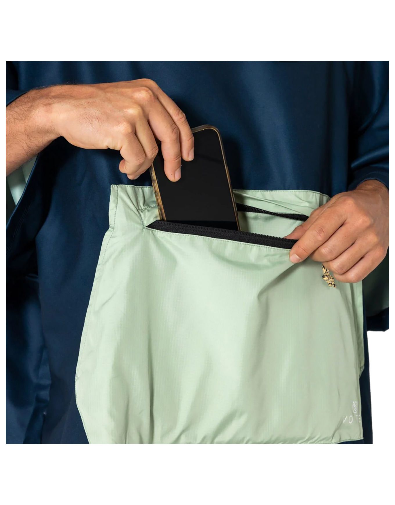 Le Microfleece Poncho Ocean Navy/Cameo Green de Voited est un poncho outdoor en microfibre recyclée, chaud, léger et déperlant DWR, avec capuche, poche kangourou et pochette de rangement intégrée pour voyages, camping ou soirées fraîches.
