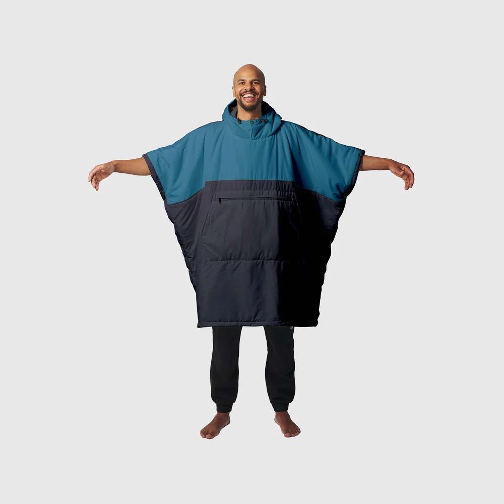 Le poncho-couverture Voited Trooper Blue Steel/Graphite en polyester recyclé REPREVE® se transforme en couverture ou sac de couchage léger, résiste à l’eau par traitement DWR et conserve la chaleur jusqu’à 13°C grâce à l’isolation Dupont Sorano.