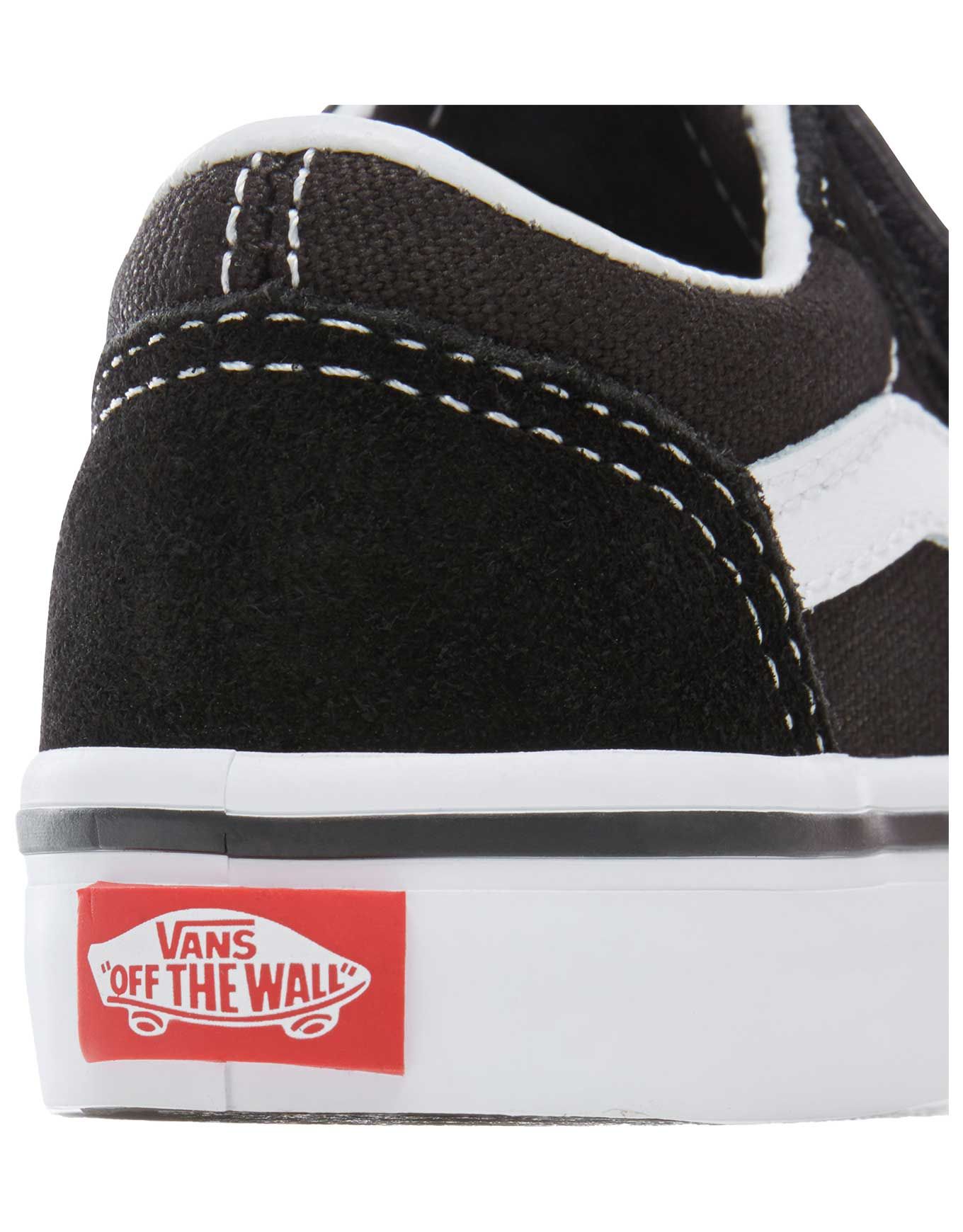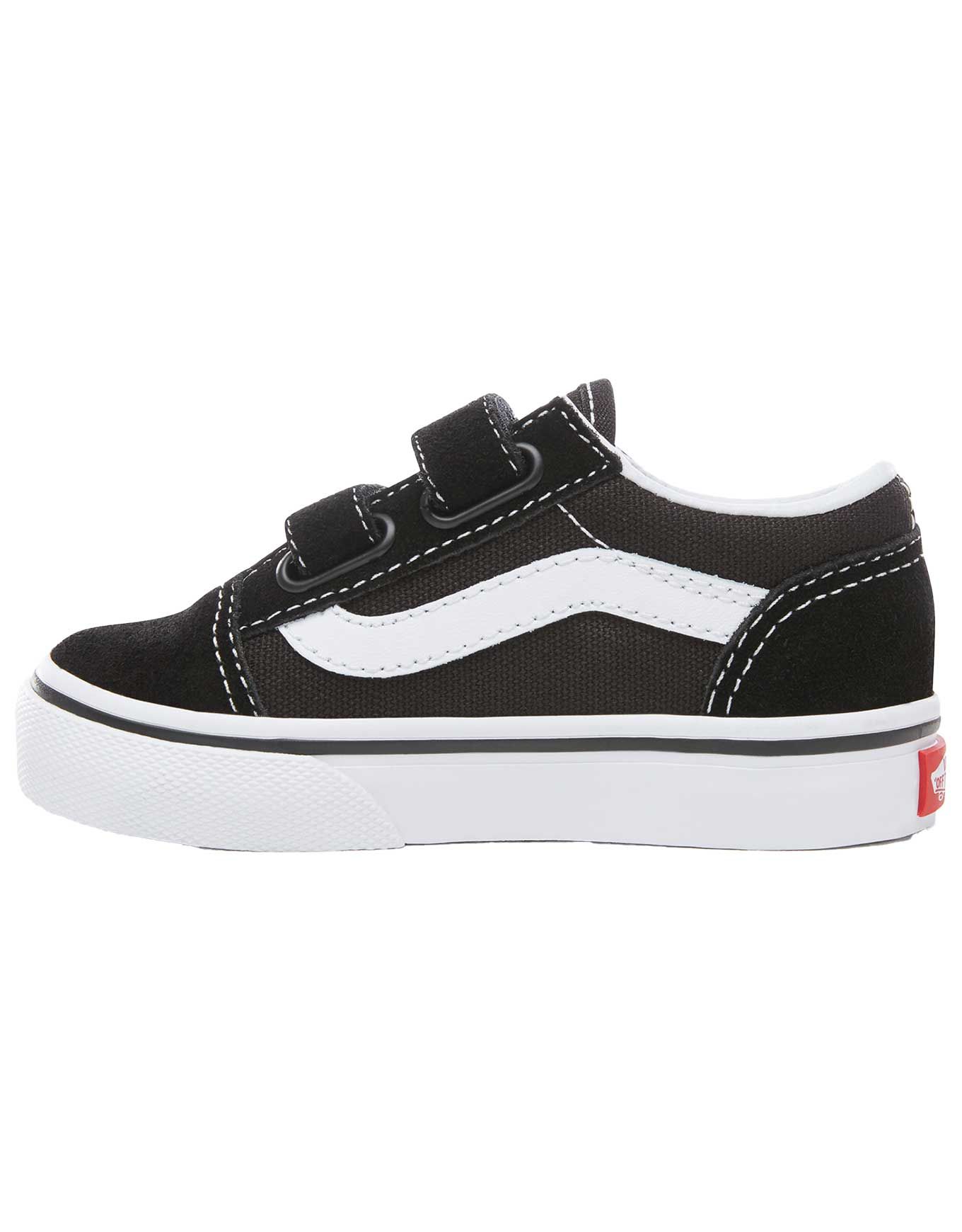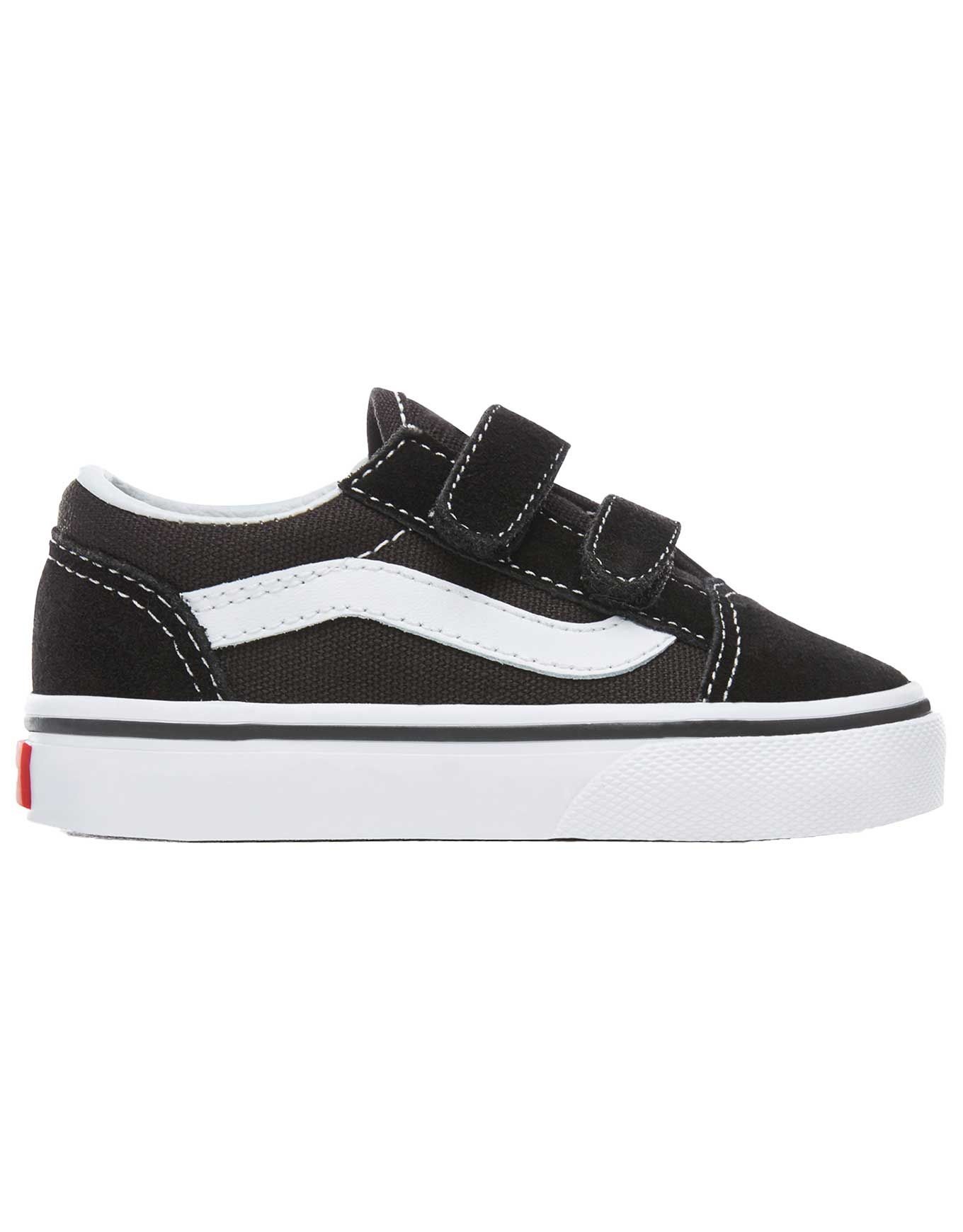 Chaussures Vans Old Skool V Black pour enfant en toile et daim, scratchs rapides, col rembourré, semelle caoutchouc gaufrée : maintien, flexibilité et adhérence assurés.