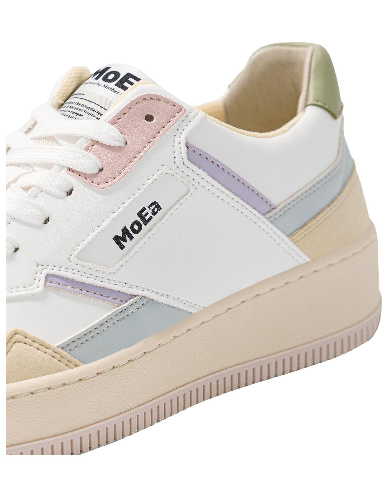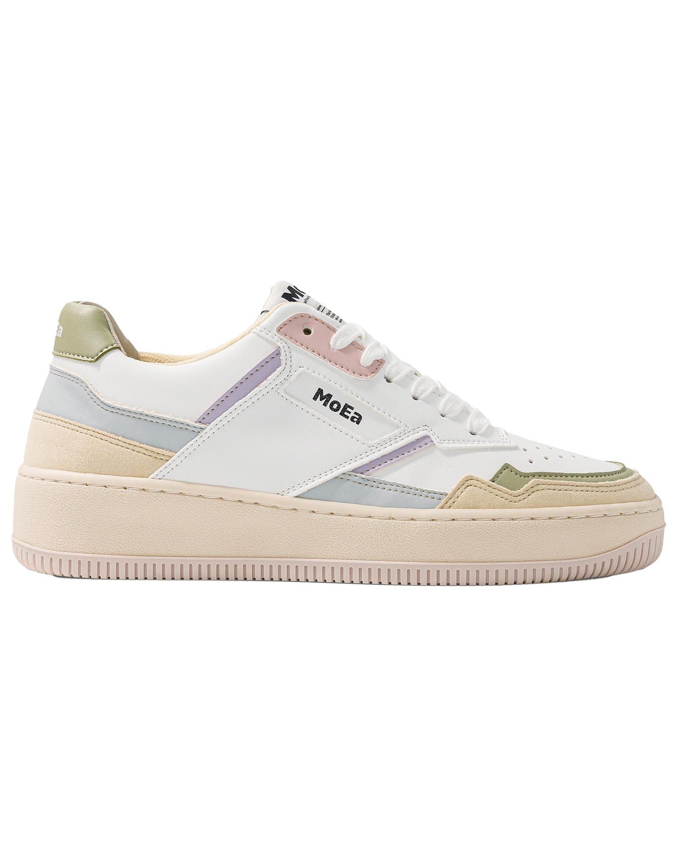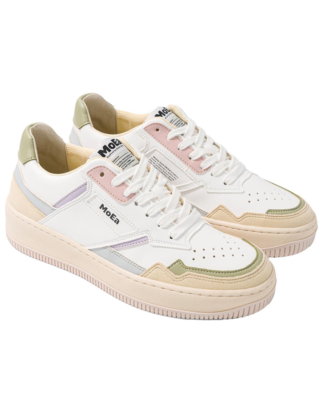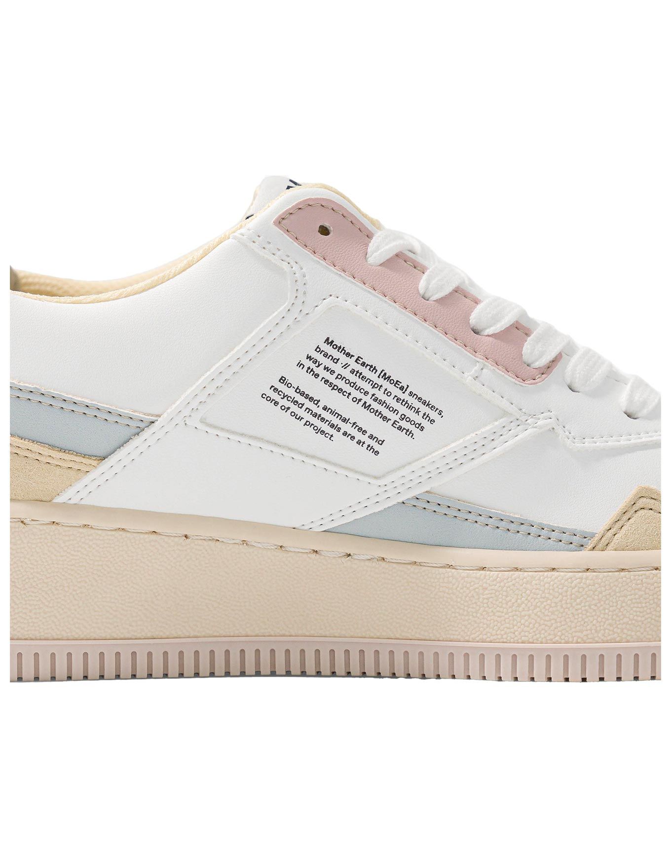 MoEa Gen1 All In Pastel, baskets femme vegan en biomatières innovantes, émettent 79 % de CO₂ de moins que le cuir. Coupe épurée blanche avec touches pastels, confort recyclé, style élégant et durable.