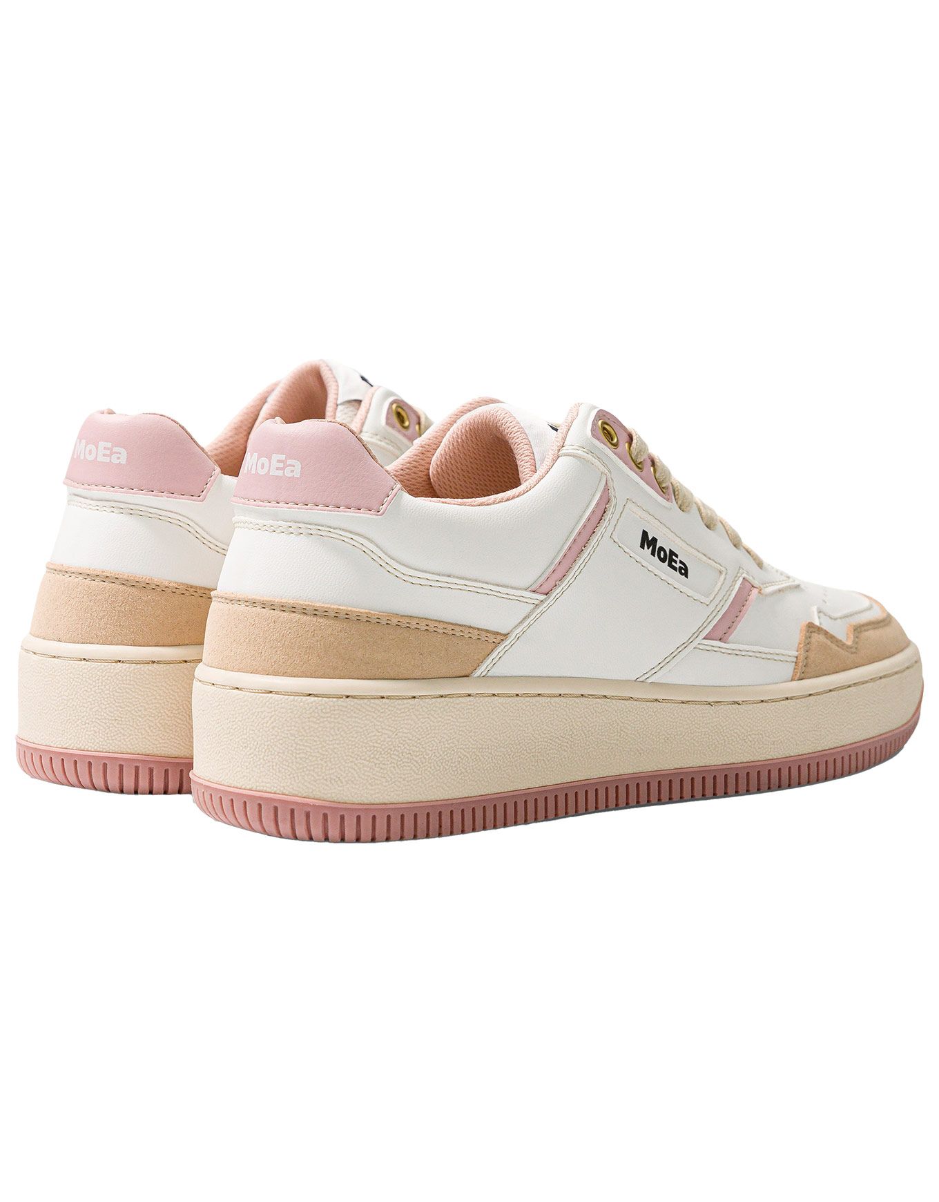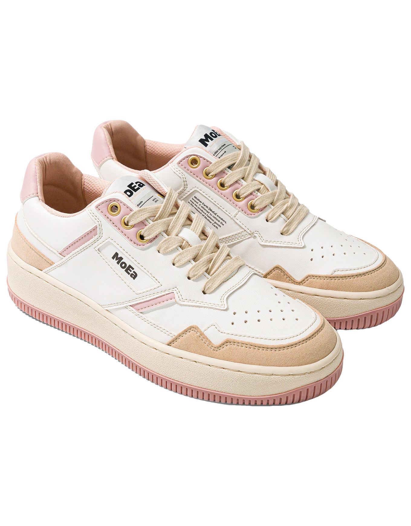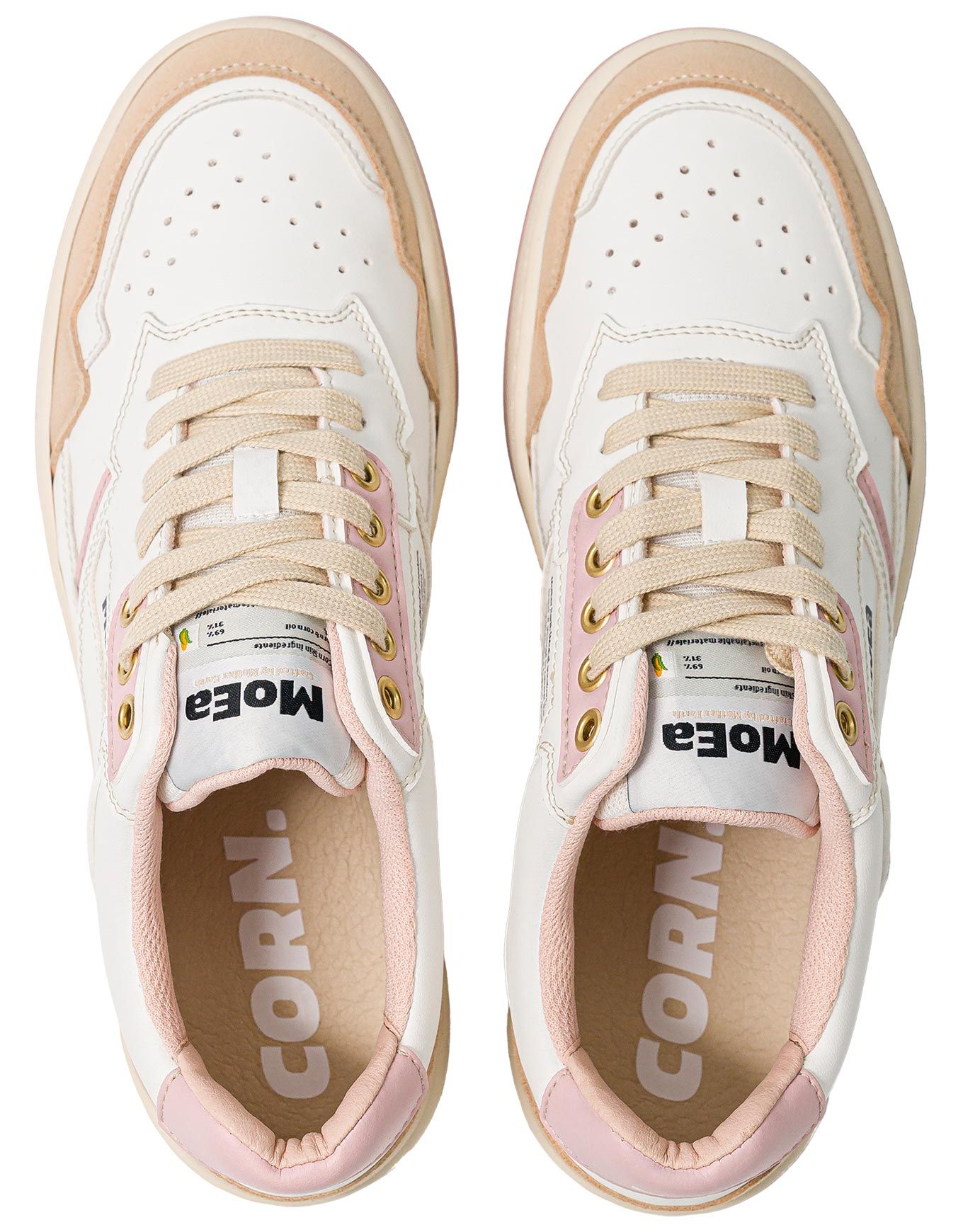 MoEa Gen1 Corn White & Pink Suede, baskets femme vegan en CornSkin (maïs et bio-polyuréthane), émettent 79 % de CO₂ de moins que le cuir, allient élégance blanche et détails daim rose, confort et fabrication responsable.