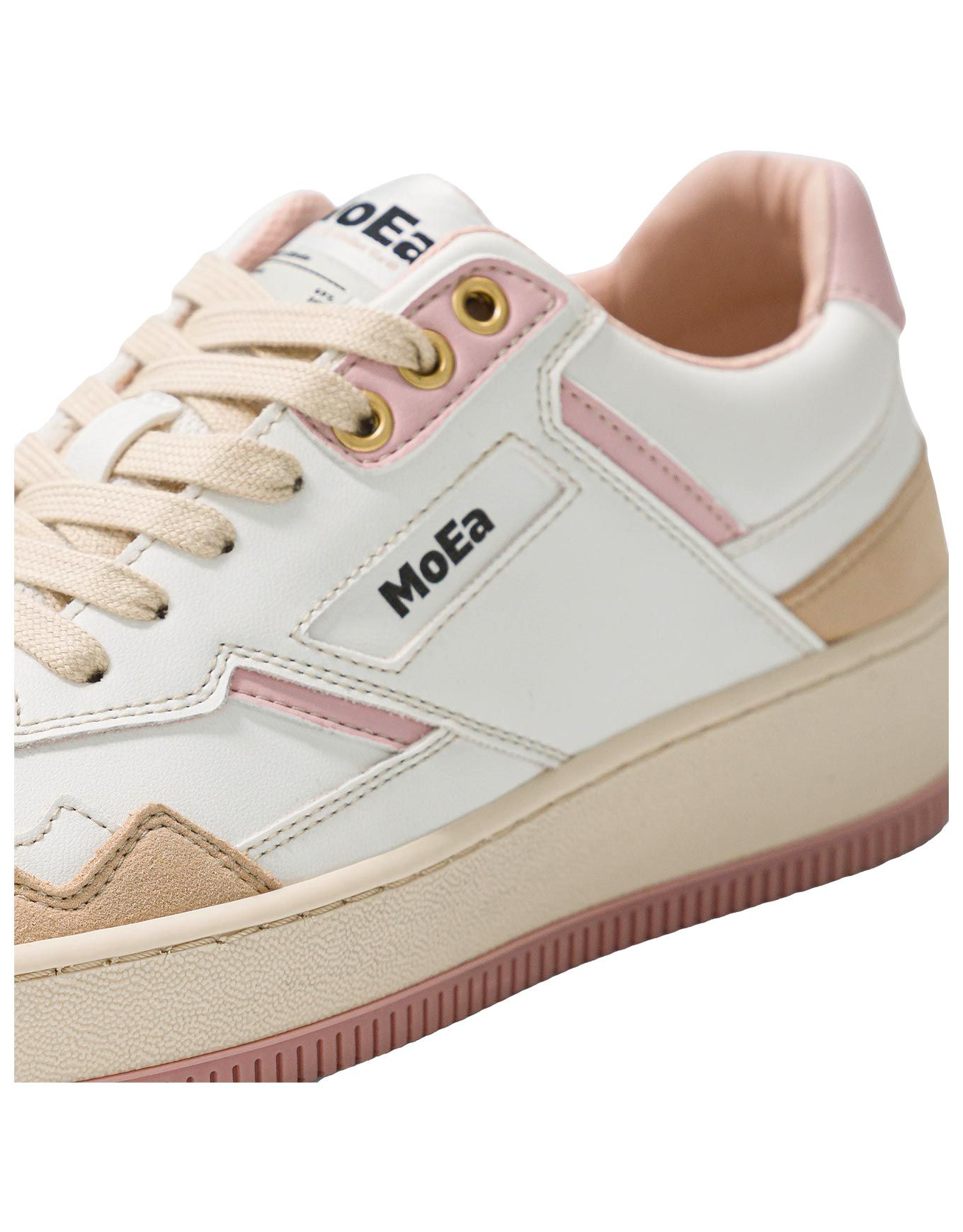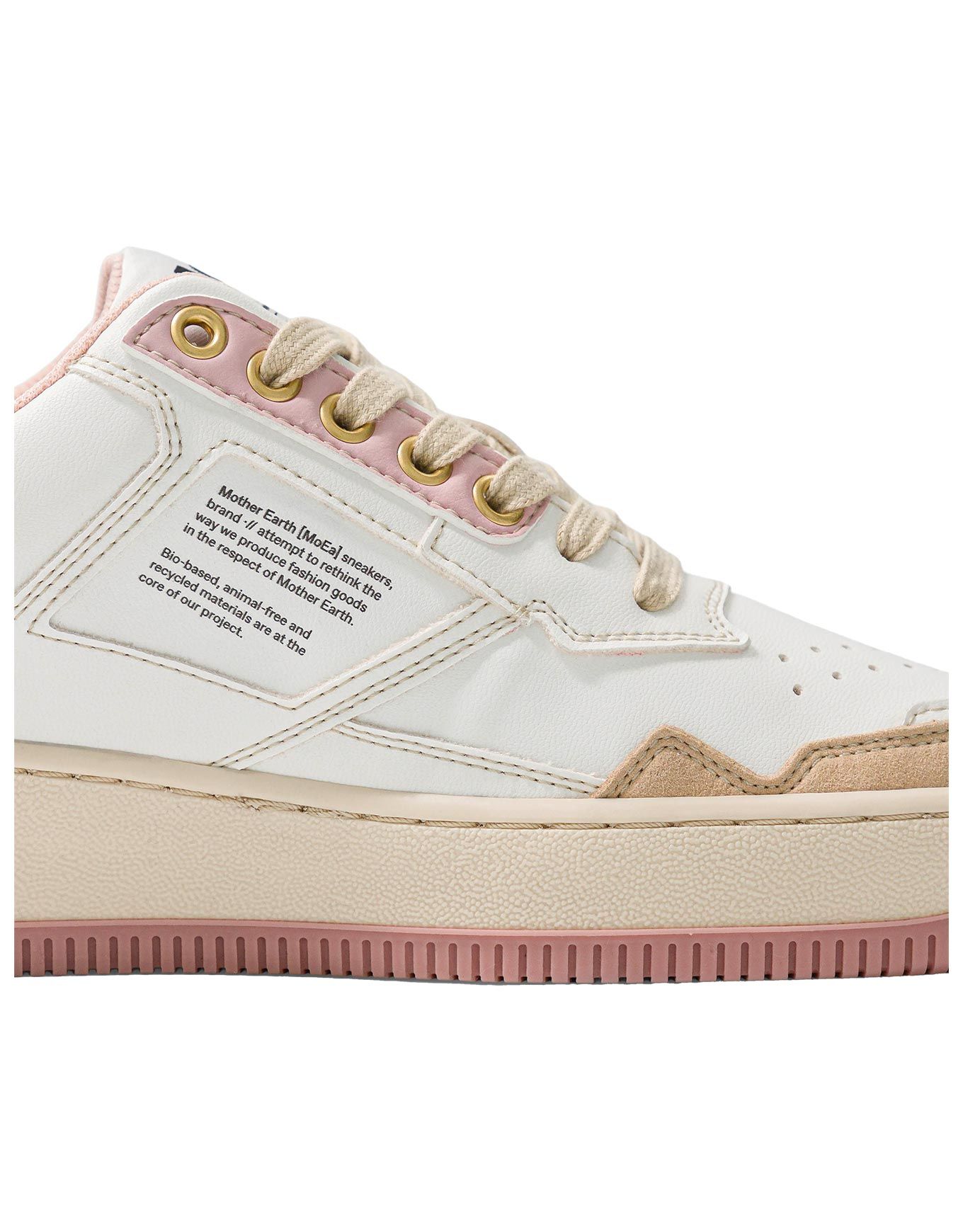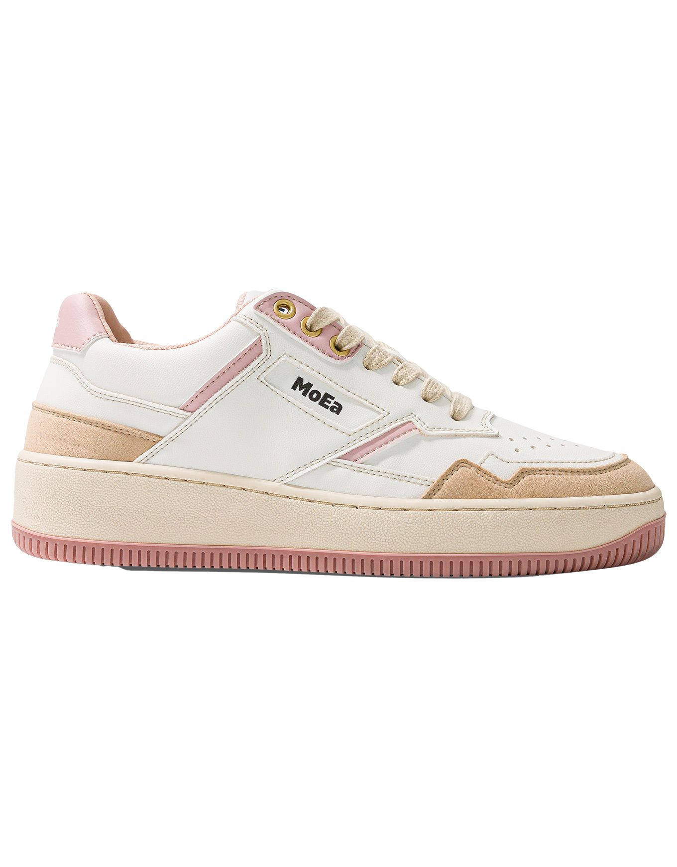 MoEa Gen1 Corn White & Pink Suede, baskets femme vegan en CornSkin (maïs et bio-polyuréthane), émettent 79 % de CO₂ de moins que le cuir, allient élégance blanche et détails daim rose, confort et fabrication responsable.