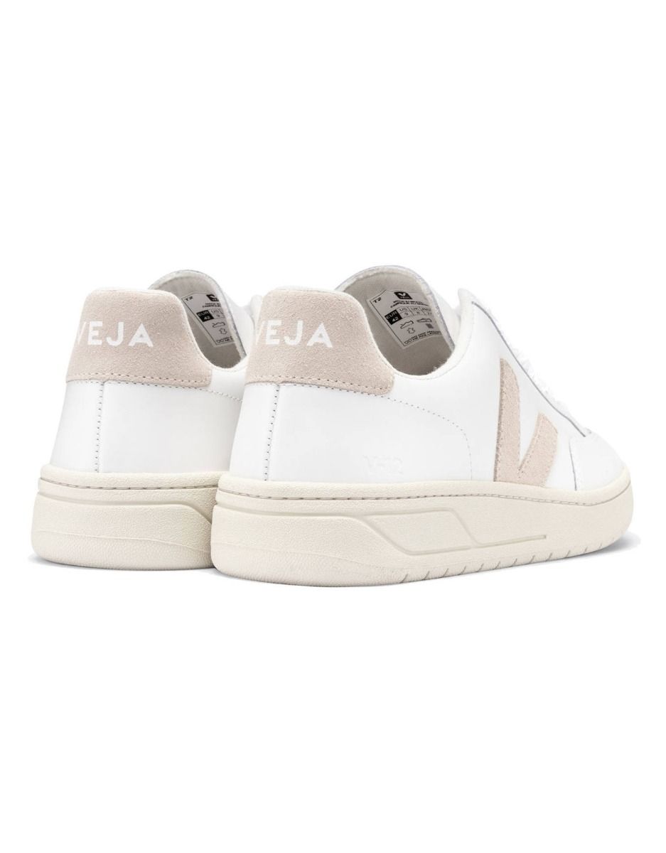 Sneakers femme Veja V-12 Extra-White Sable en cuir durable d’Uruguay, tanné au Brésil selon des normes strictes, montées sur semelle mêlant caoutchouc d’Amazonie et EVA recyclé biosourcé pour stabilité et confort.