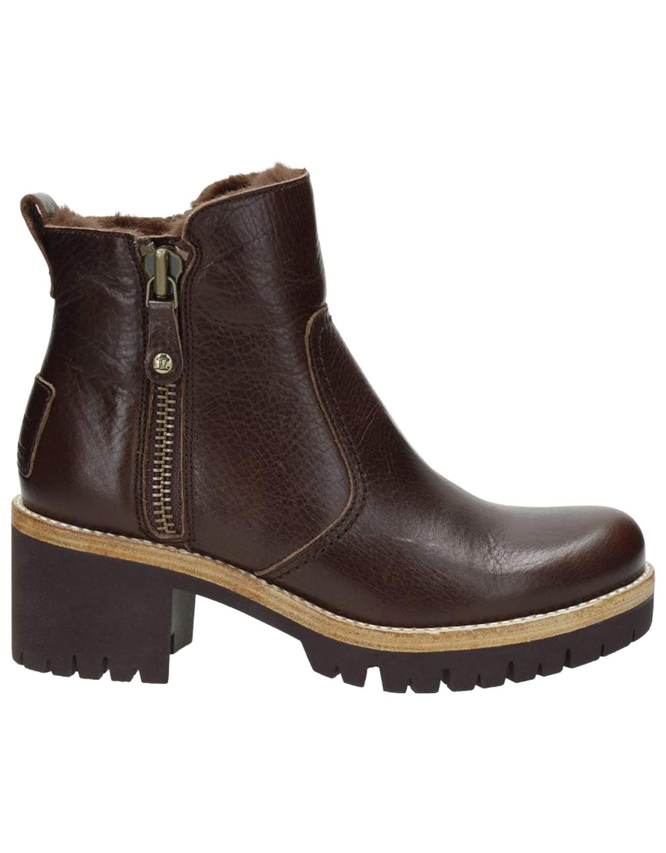 Les bottines à talon Panama Jack Pauline B15 Napa Marron conjuguent élégance urbaine et imperméabilité en cuir nubuck, avec doublure chaude, semelle anatomique amovible et talon 7,5 cm stable, fabriquées en Espagne.
