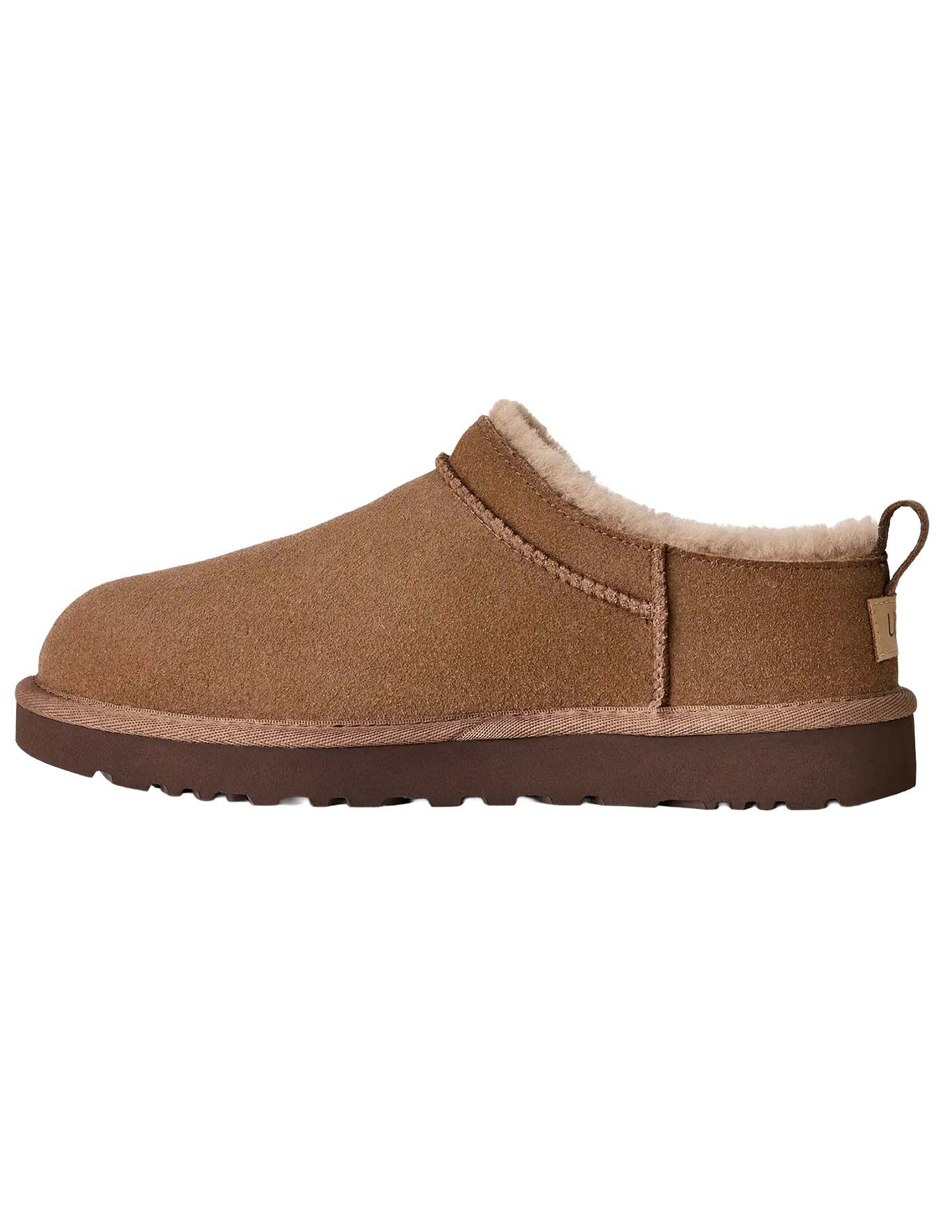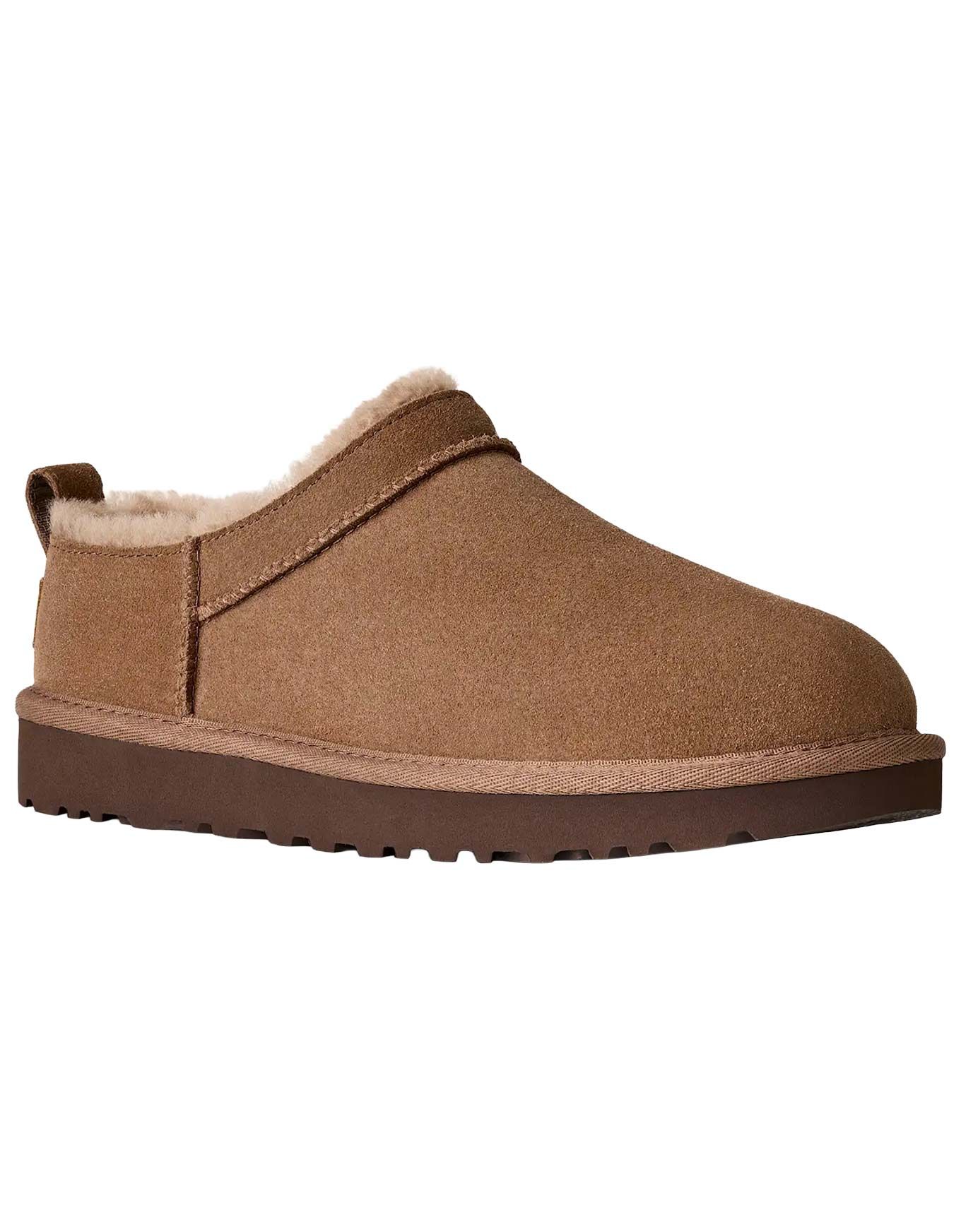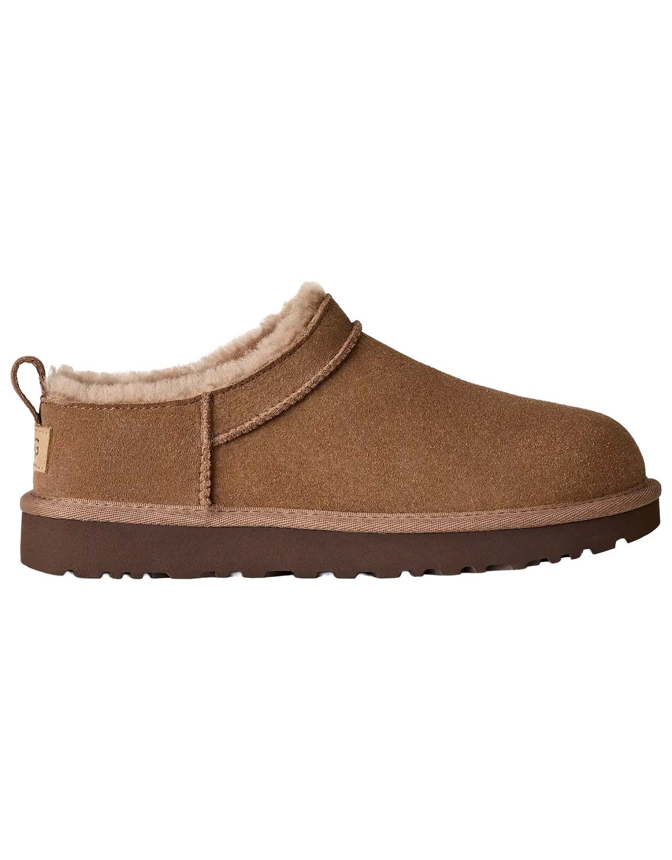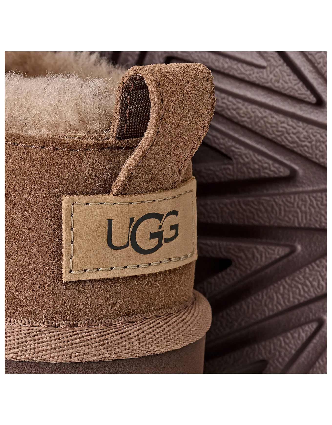 Chausson UGG Classic Micro Rocky Oak pour femme en daim avec doublure peau de mouton 10-17 mm, semelle intérieure et extérieure EVA biosourcé, enfilage facile, design sans lacets, chaleur et légèreté intérieur/extérieur.