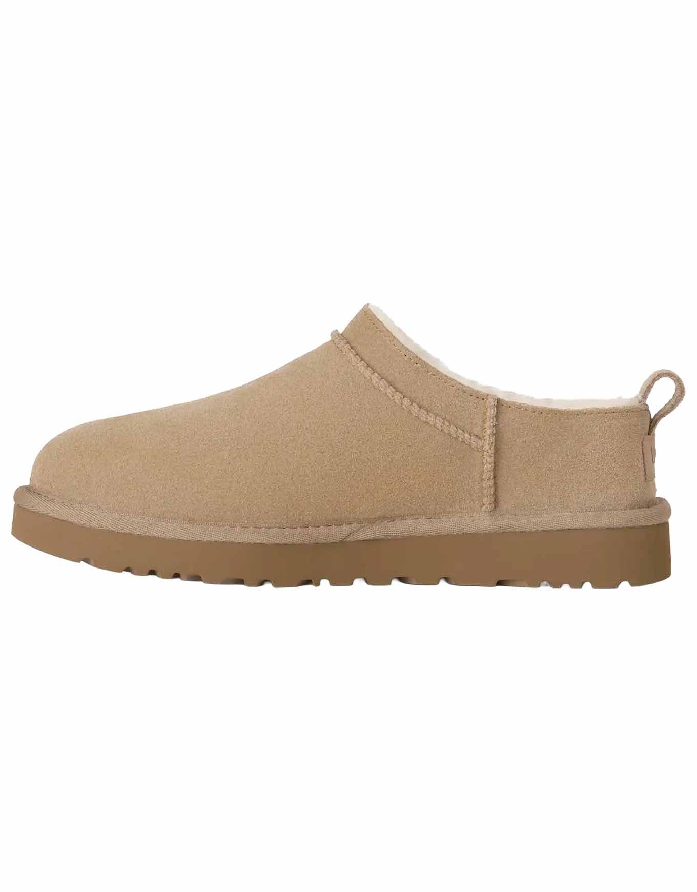 UGG Classic Micro Sand, chausson femme en daim avec doublure peau mouton 10-17 mm, semelle EVA biosourcé, enfilage facile, confort thermique intérieur-extérieur.