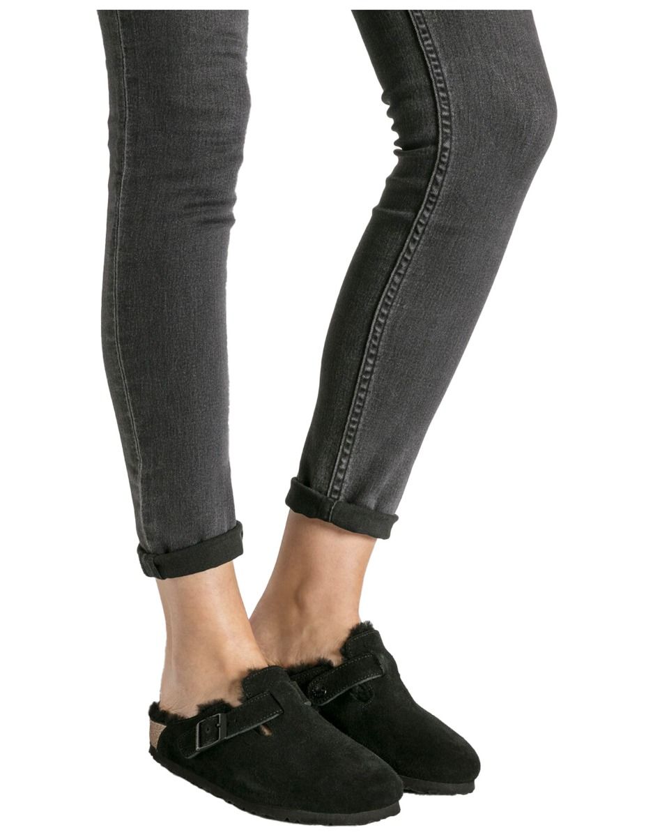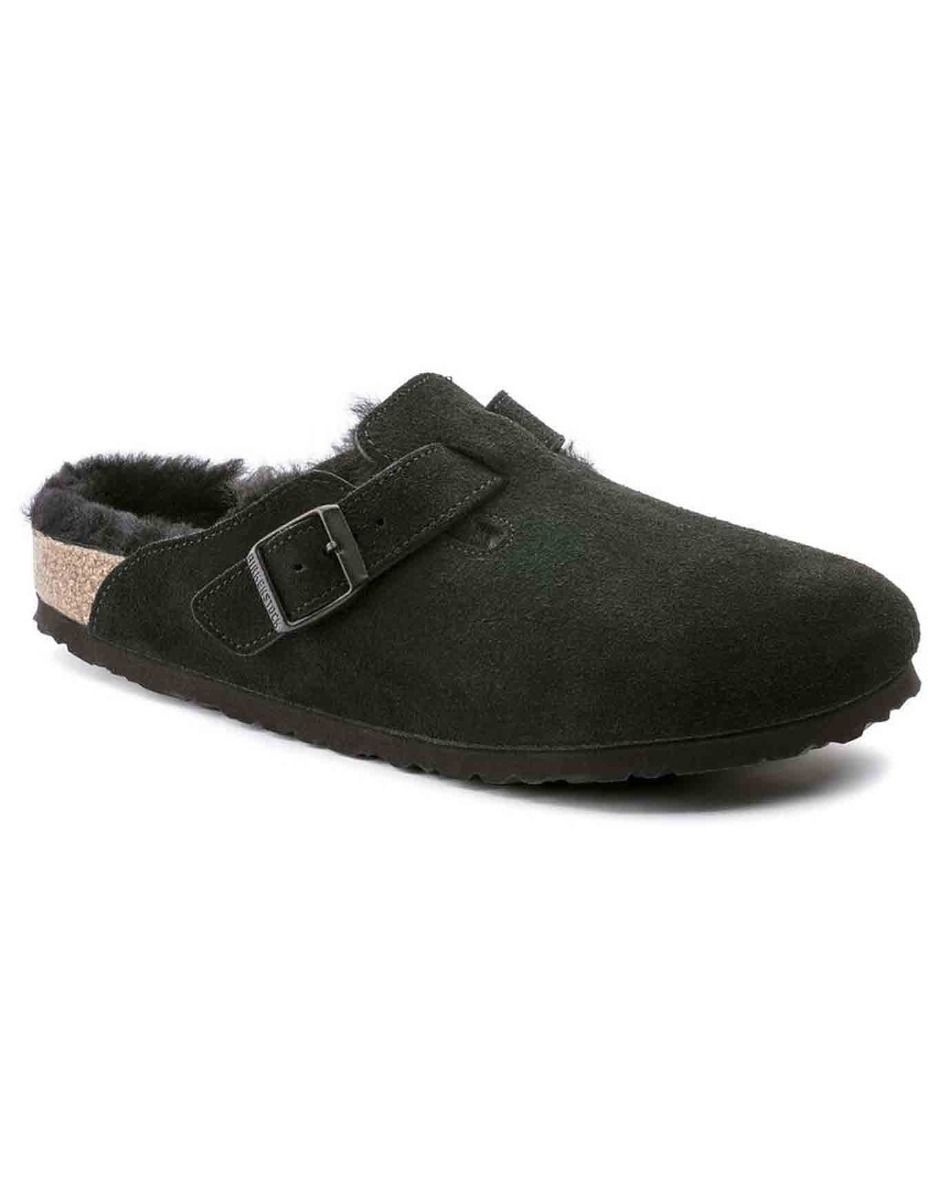 Sabot Birkenstock Boston Shearling en cuir velours noir, doublé fourrure d’agneau, semelle confort : chaleur et style assurés pour l’hiver.