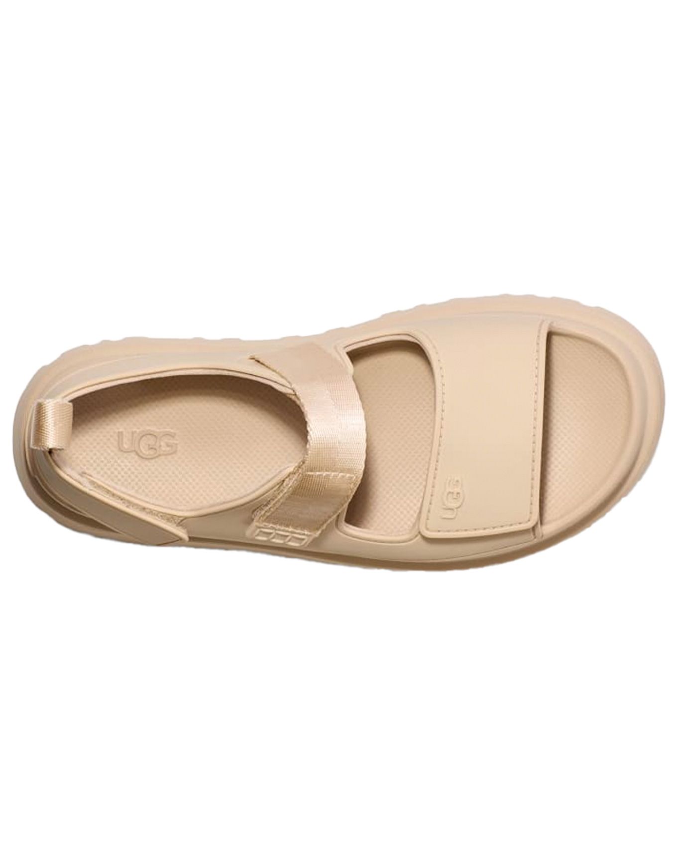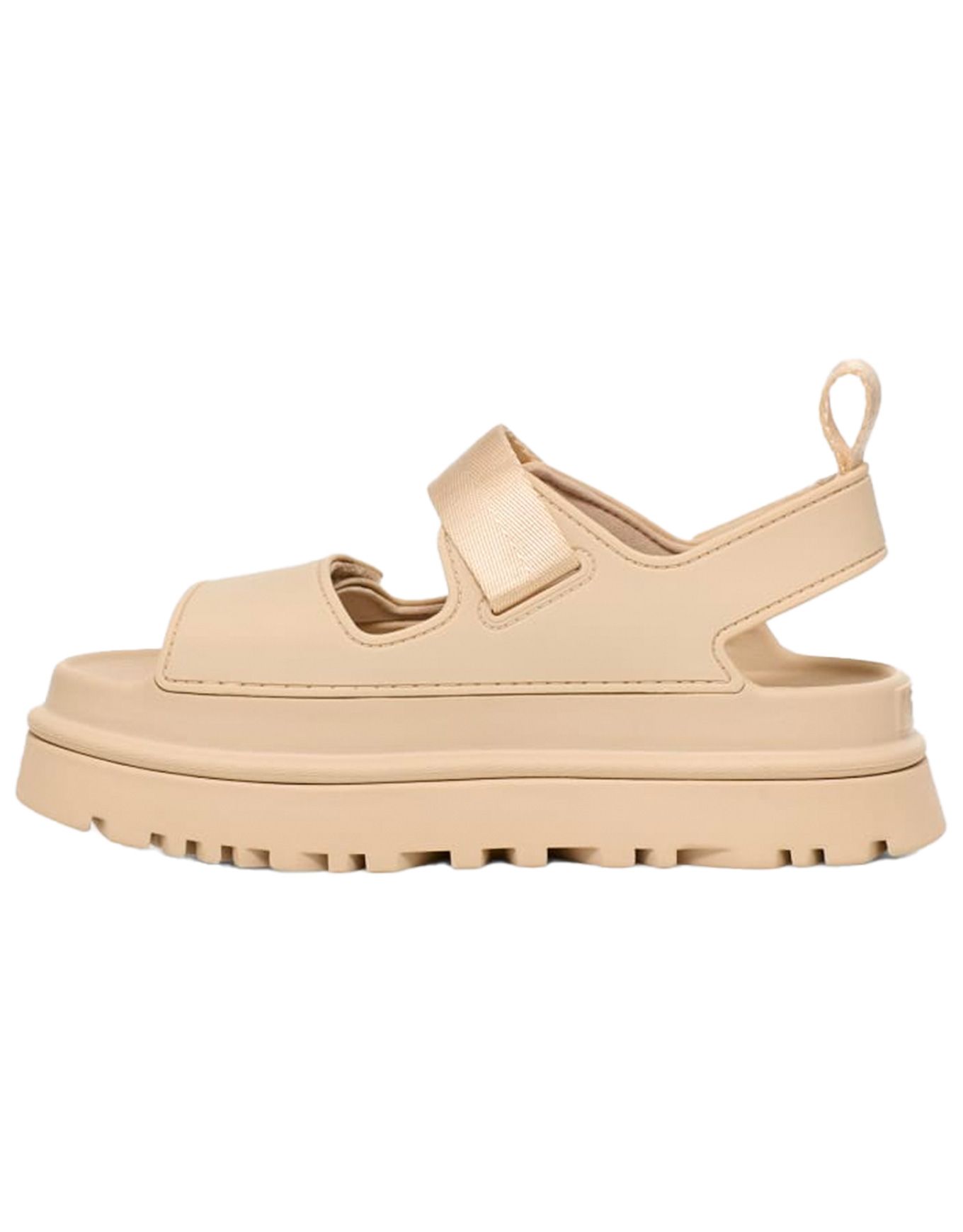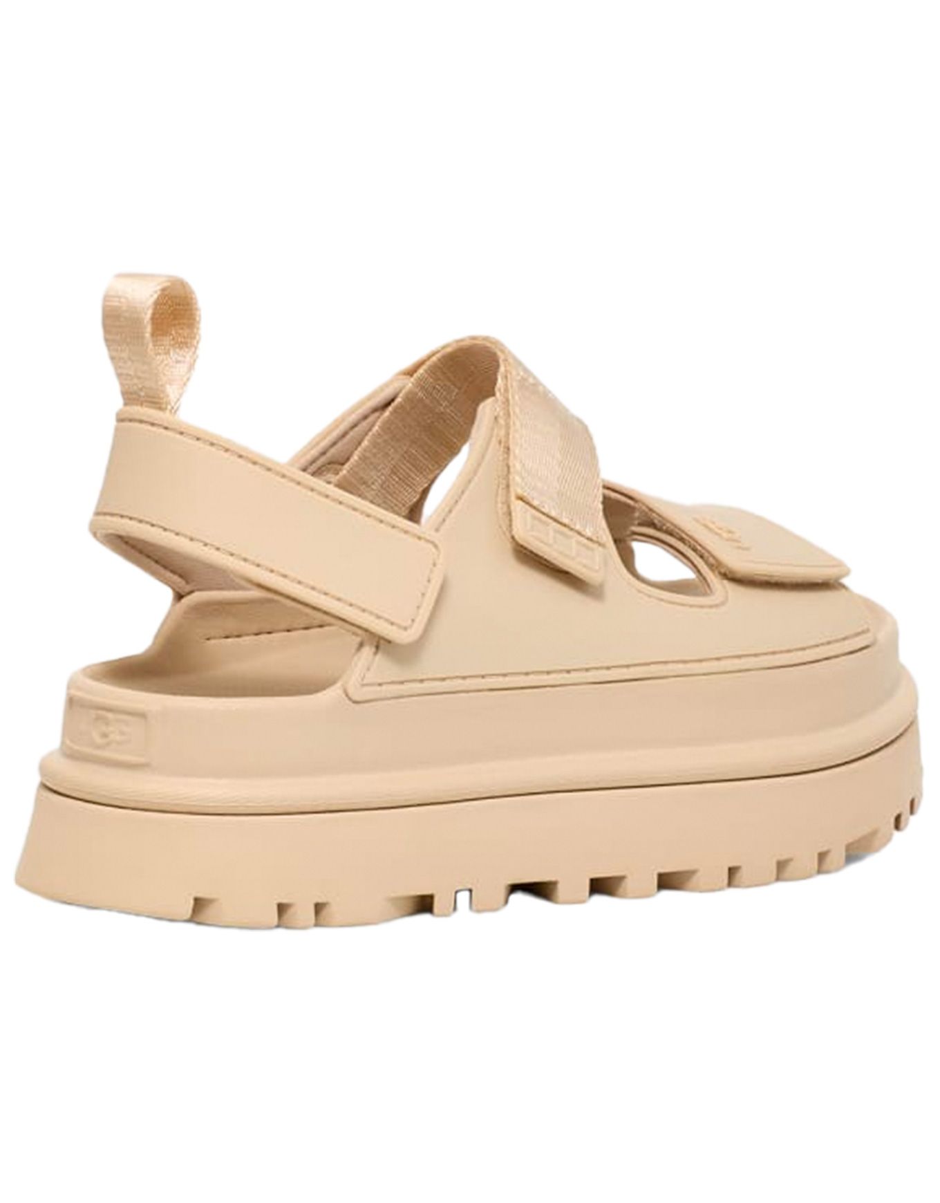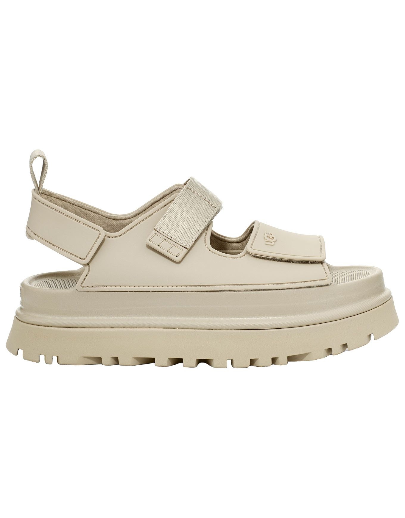 Les sandales à plateforme UGG Goldenglow Sea Salt pour femme allient confort durable et look estival : assise EVA, semelle SugarSole™ en mousse de canne à sucre et lanière cheville ajustable.