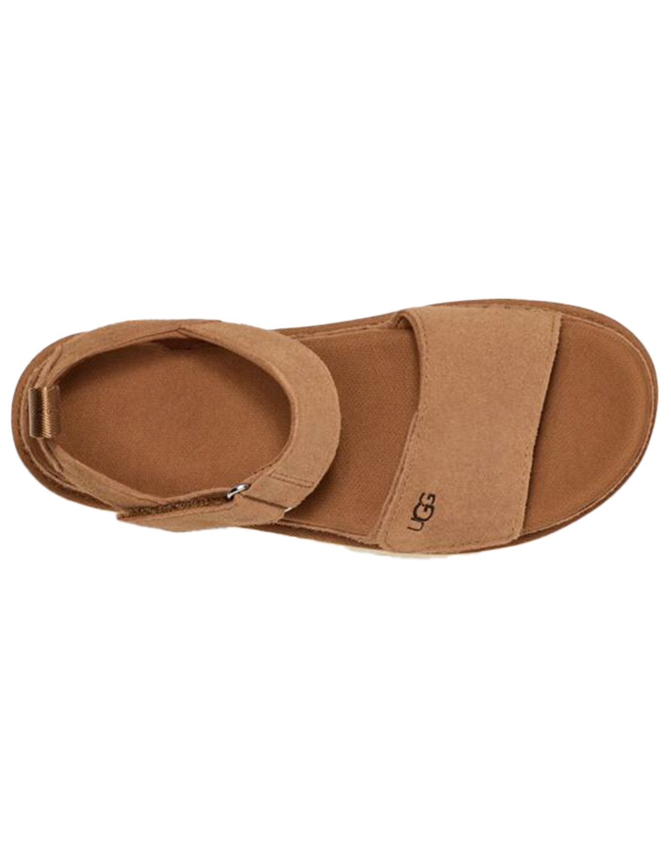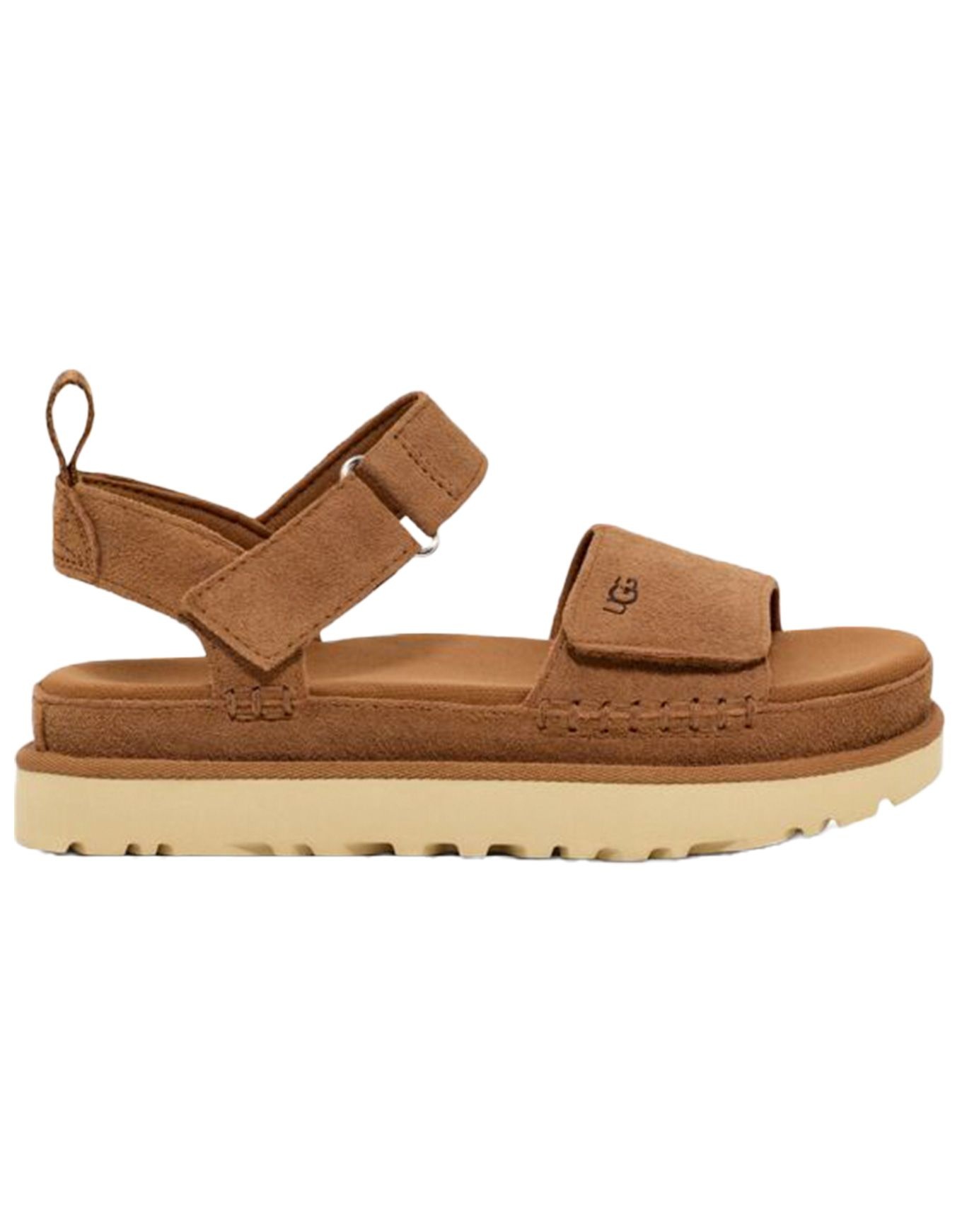 Sandales UGG Goldenstar Chestnut pour femme en daim velouté avec plateforme légère, semelle SugarSole™ biosourcée, assise mousse et lanières réglables pour confort et ajustement.