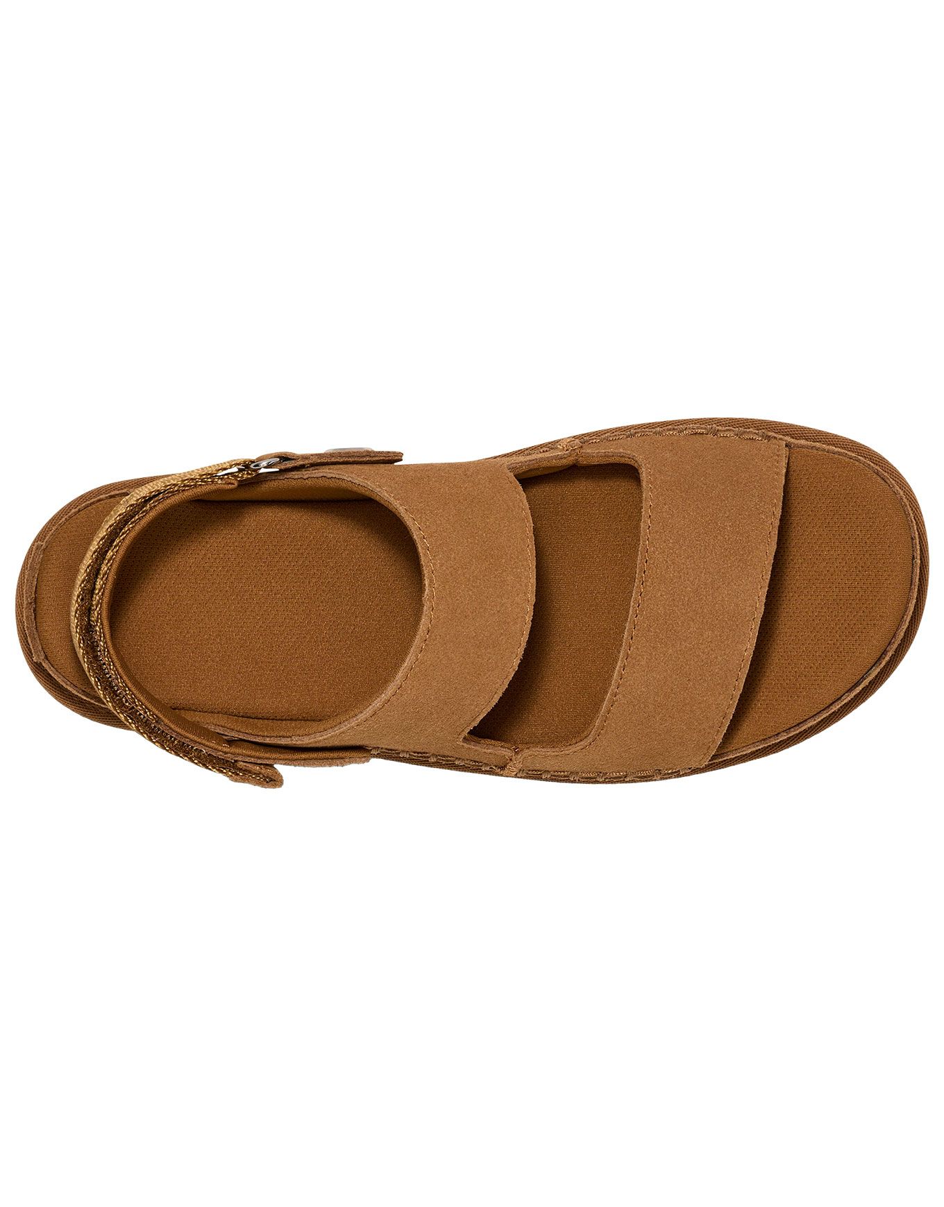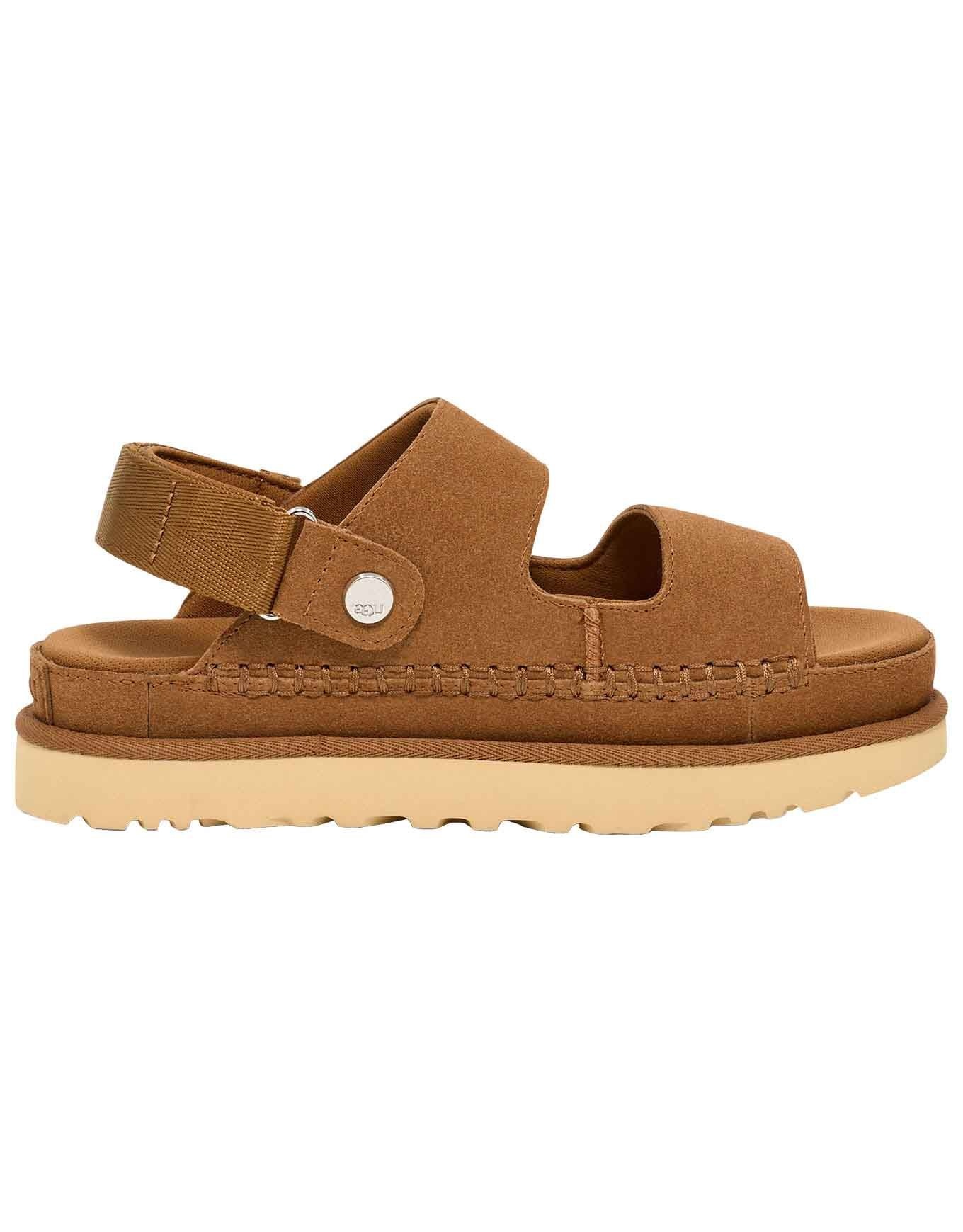 Les sandales compensées UGG Goldenstar Chestnut pour femme associent daim velouté, assise plantaire en mousse et semelle SugarSole™ biosourcée pour un confort léger tout l’été. Trois lanières réglables et doublure polyester recyclé assurent maintien et ajustement précis.