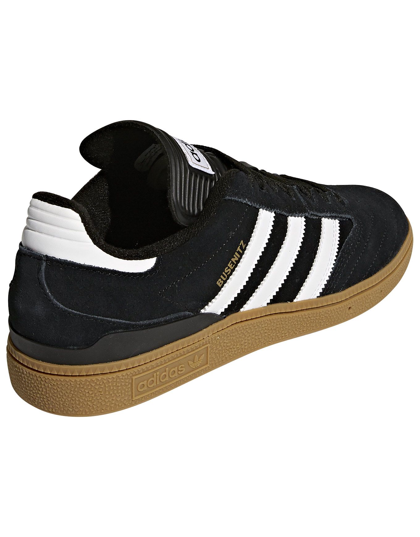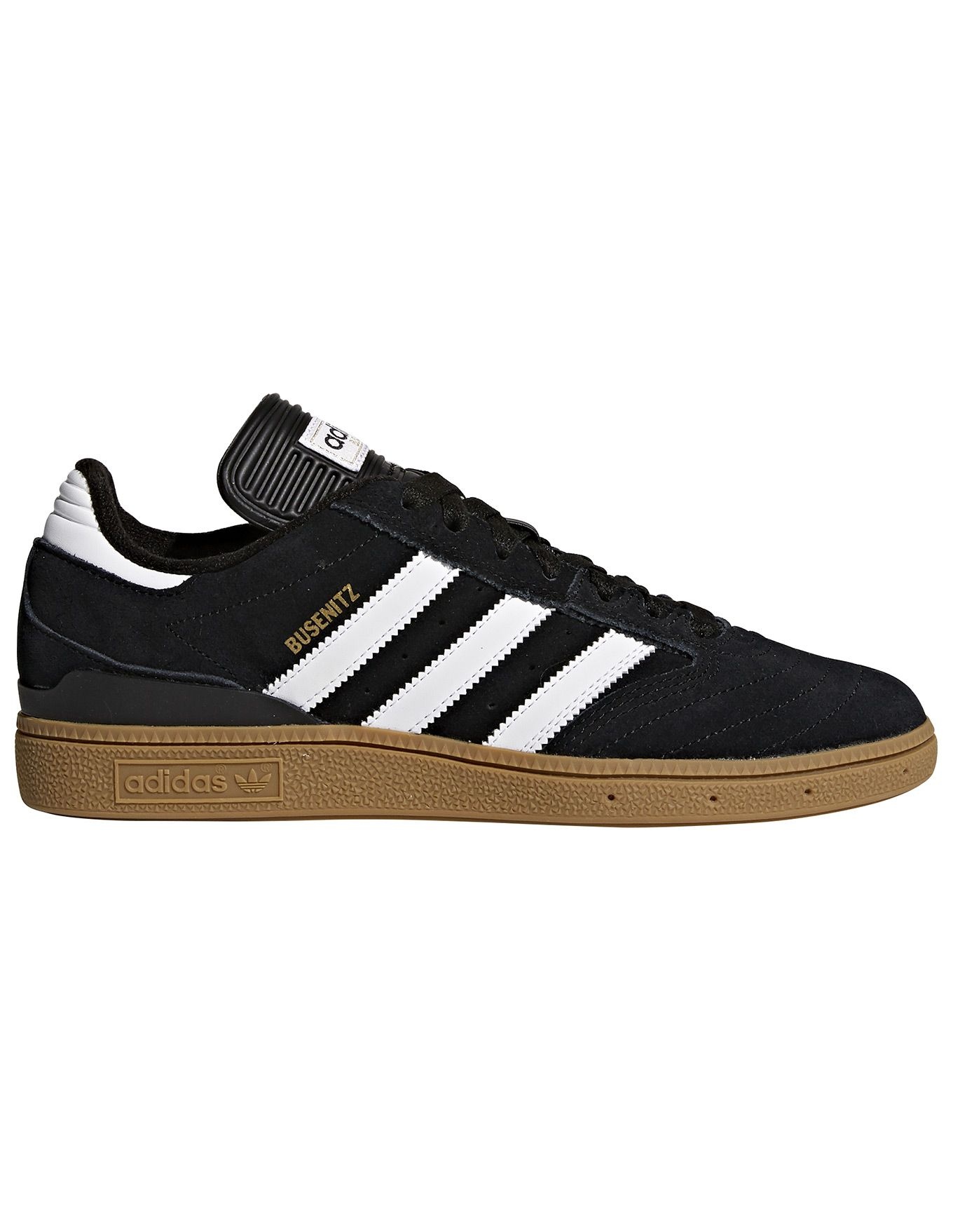 Chaussure de skate Adidas Originals Busenitz Core Black/Footwear White/Gold Metallic pour homme, en suède haute qualité, col Geofit matelassé, semelle Cupsole souple et point de pivot pour maintien, confort et adhérence optimaux.