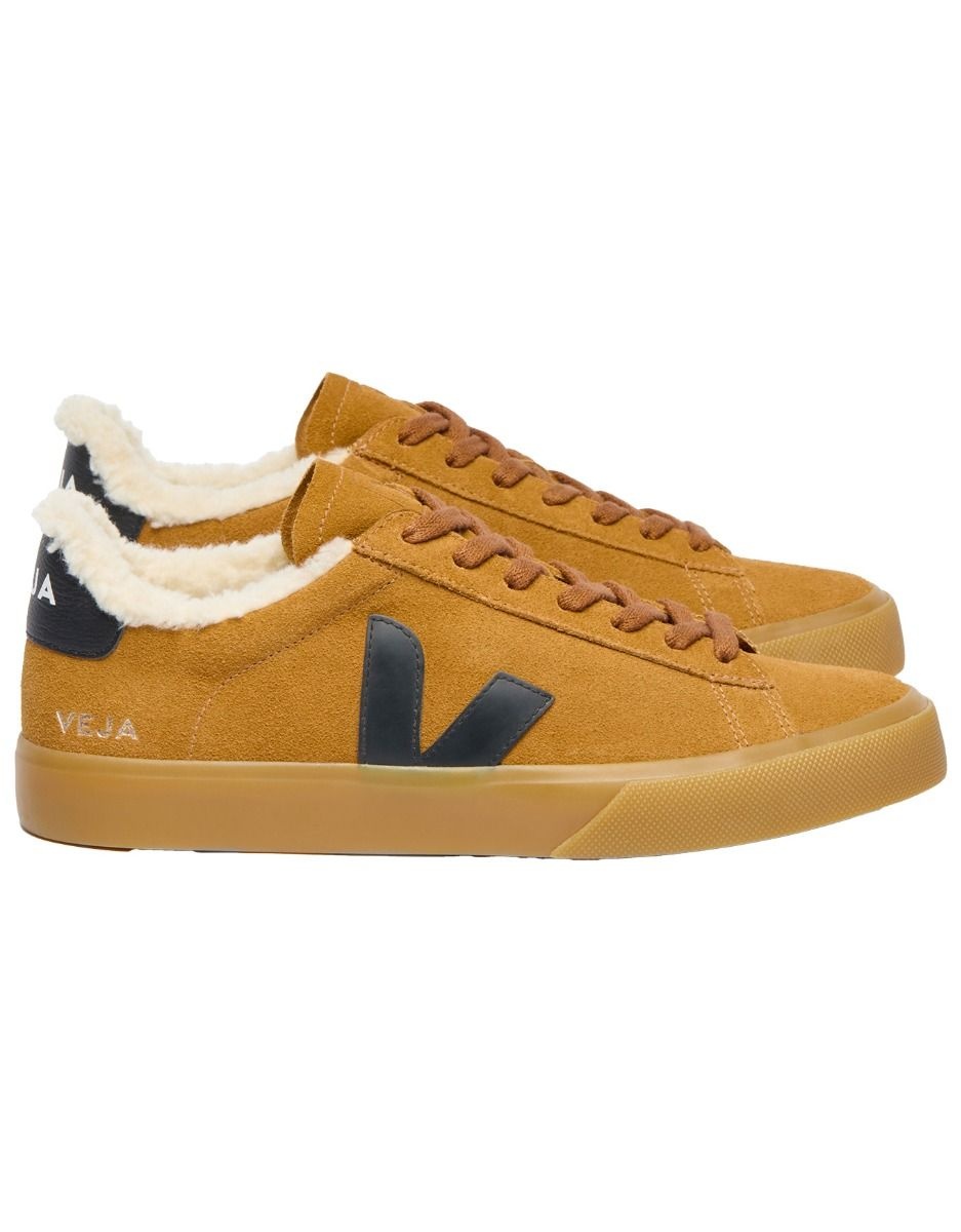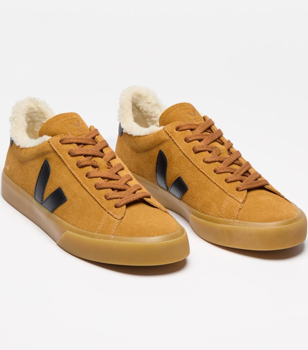 Veja Campo Winter Camel Black Natural, sneakers d’hiver homme en suède tanné sans produits dangereux, enduit d’huiles hydrofuges sans PFC, doublure polaire chaude, semelles intérieure/extérieure en caoutchouc d’Amazonie et EVA recyclé.