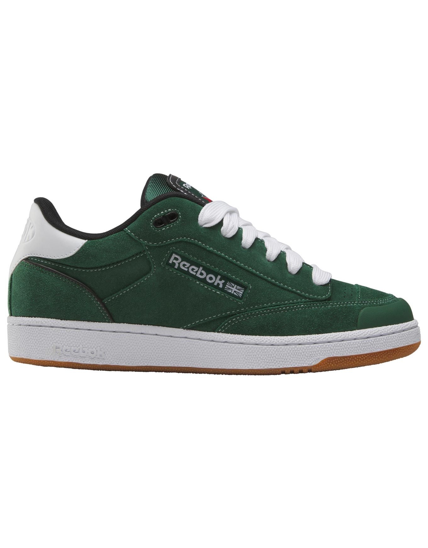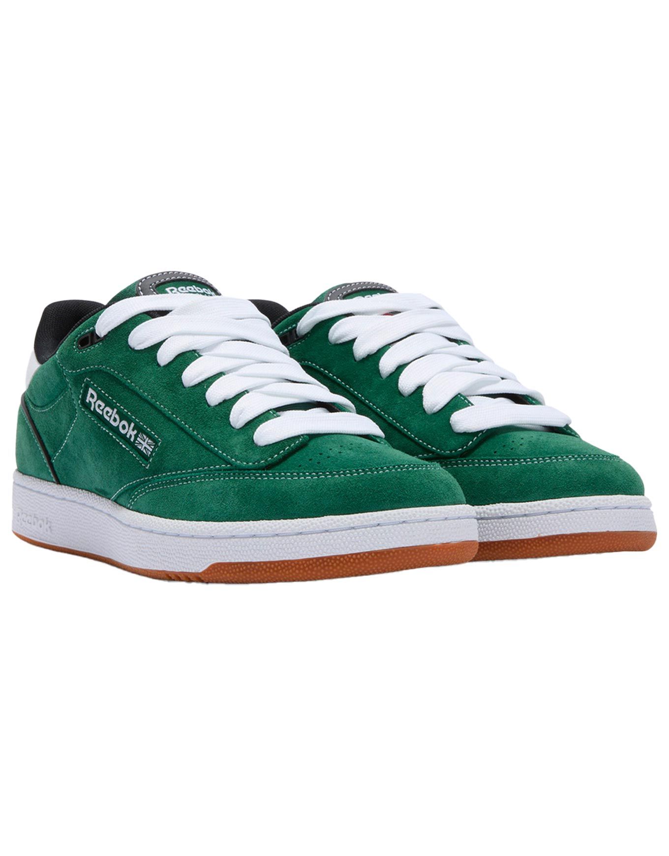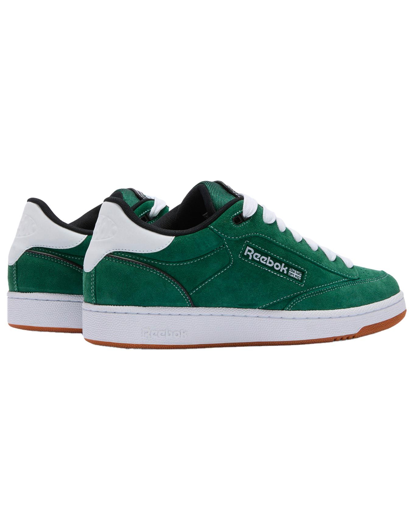 Sneakers unisexes Reebok Club C Bulc CLN Dark Green Black White, revisitant le style skate des années 90 en cuir suède souple, semelle caoutchouc durable et perforations orteils.