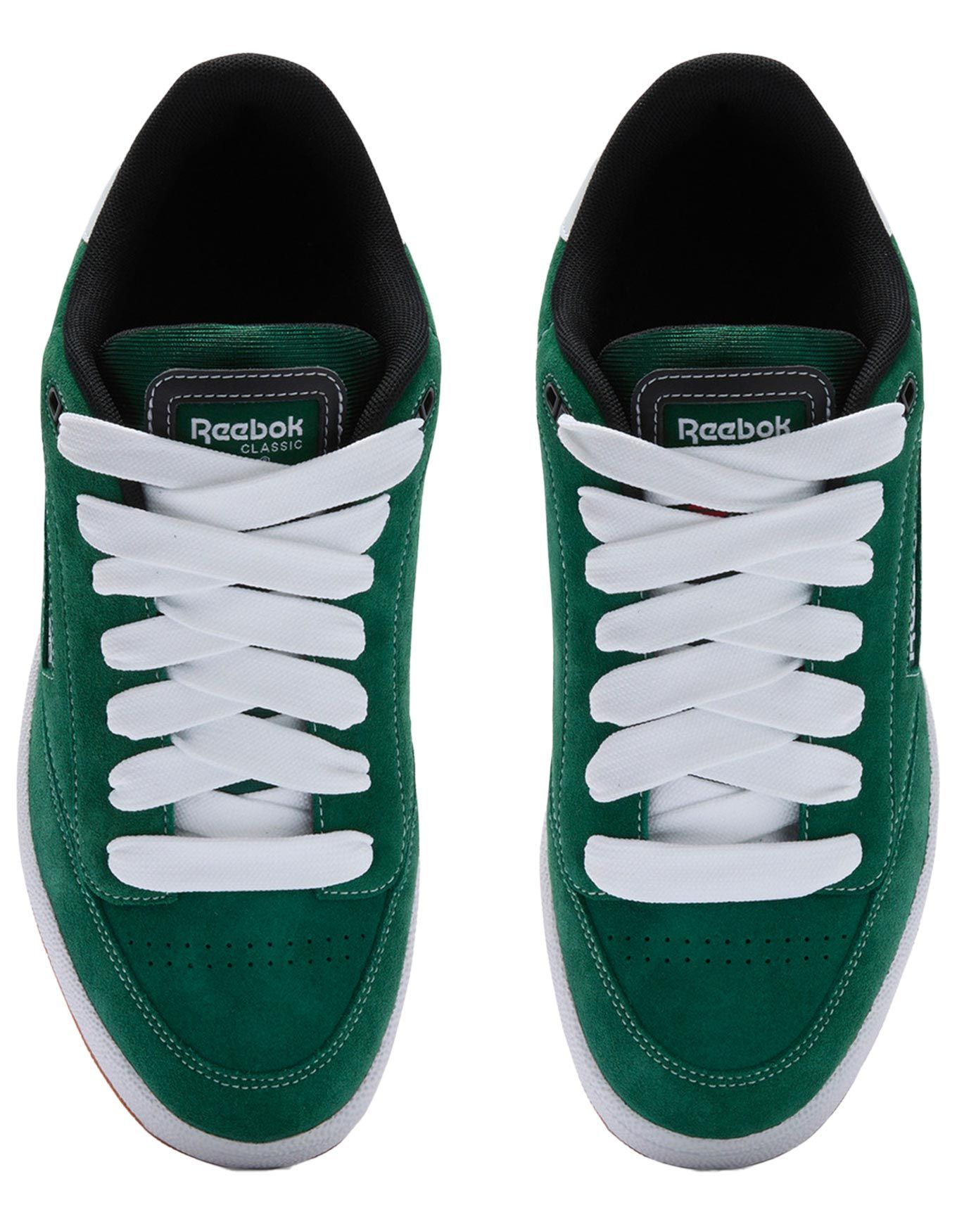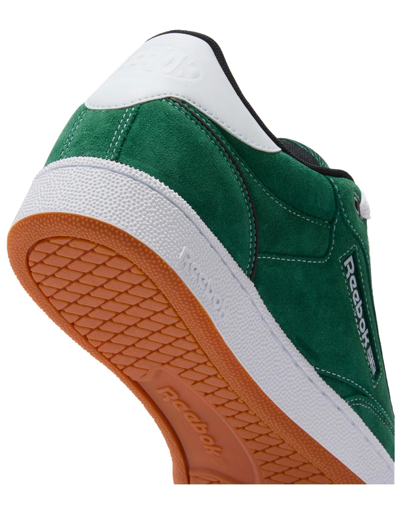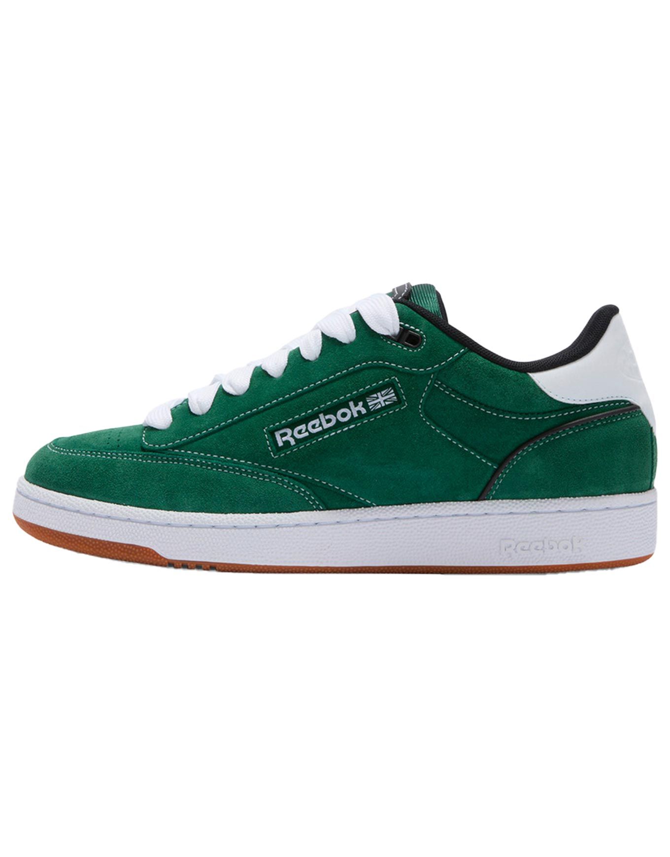 Sneakers unisexes Reebok Club C Bulc CLN Dark Green Black White, revisitant le style skate des années 90 en cuir suède souple, semelle caoutchouc durable et perforations orteils.