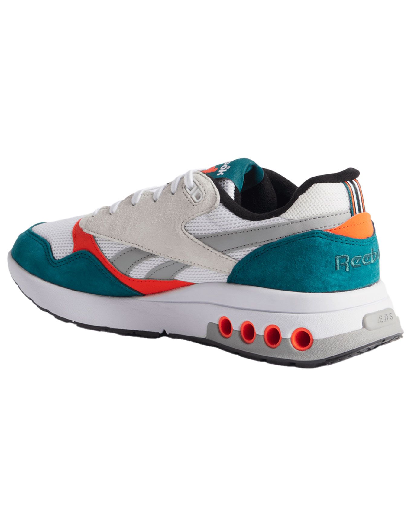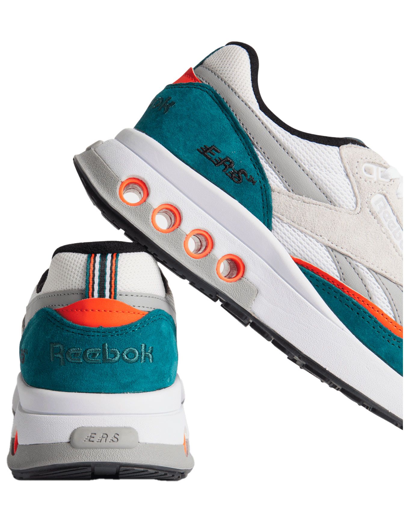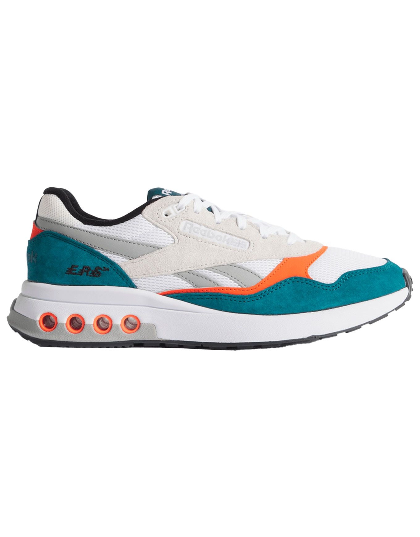 Baskets unisexes Reebok ERS World Retro Teal White Pump Orange, héritage 90s avec tige textile/cuir/suède, semelle EVA légère, caoutchouc adhérent et système ERS™ amortissant.