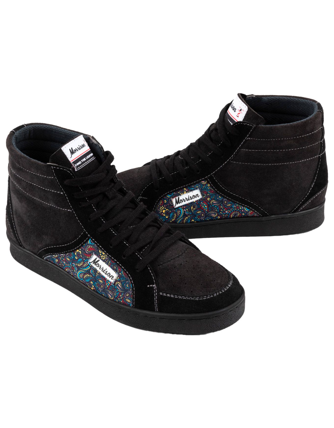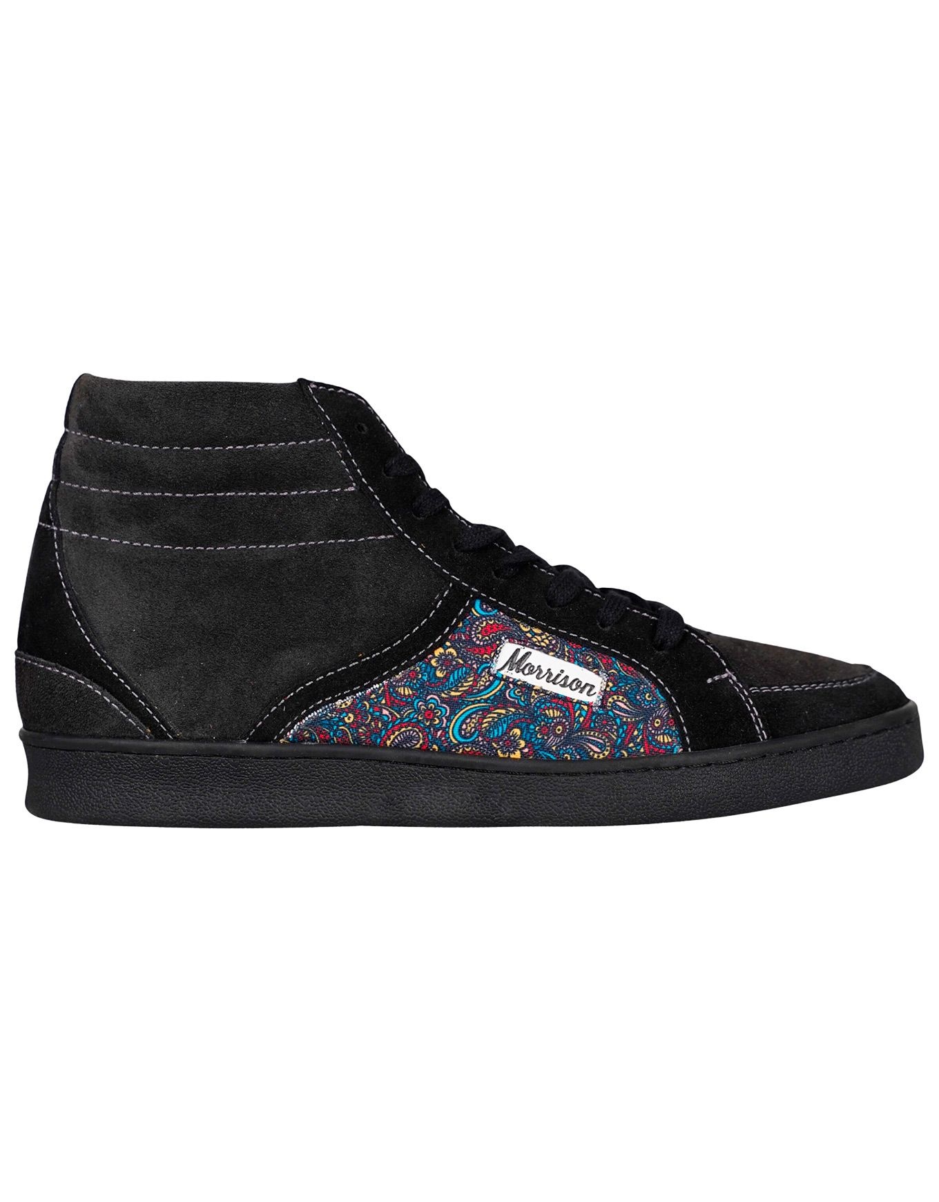 Baskets Morrison Higher Blackhawk homme en cuir suédé noir/anthracite, semelle caoutchouc recyclé, imprimé cachemire psychédélique, talon renforcé et tige mid pour confort et maintien.