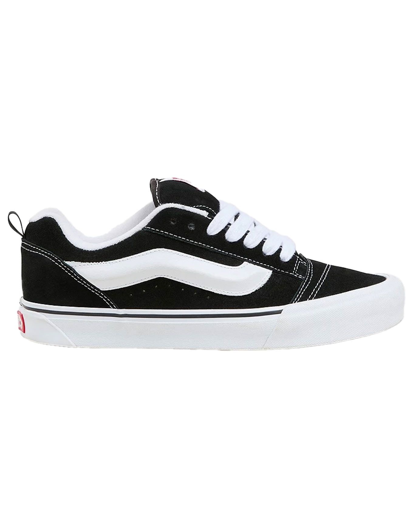 La chaussure Vans Knu Skool Black/True White réédite le style skate épais des années 90 avec sa semelle robuste, sa rayure Sidestripes 3D et sa tirette talon pour un enfilage facile.