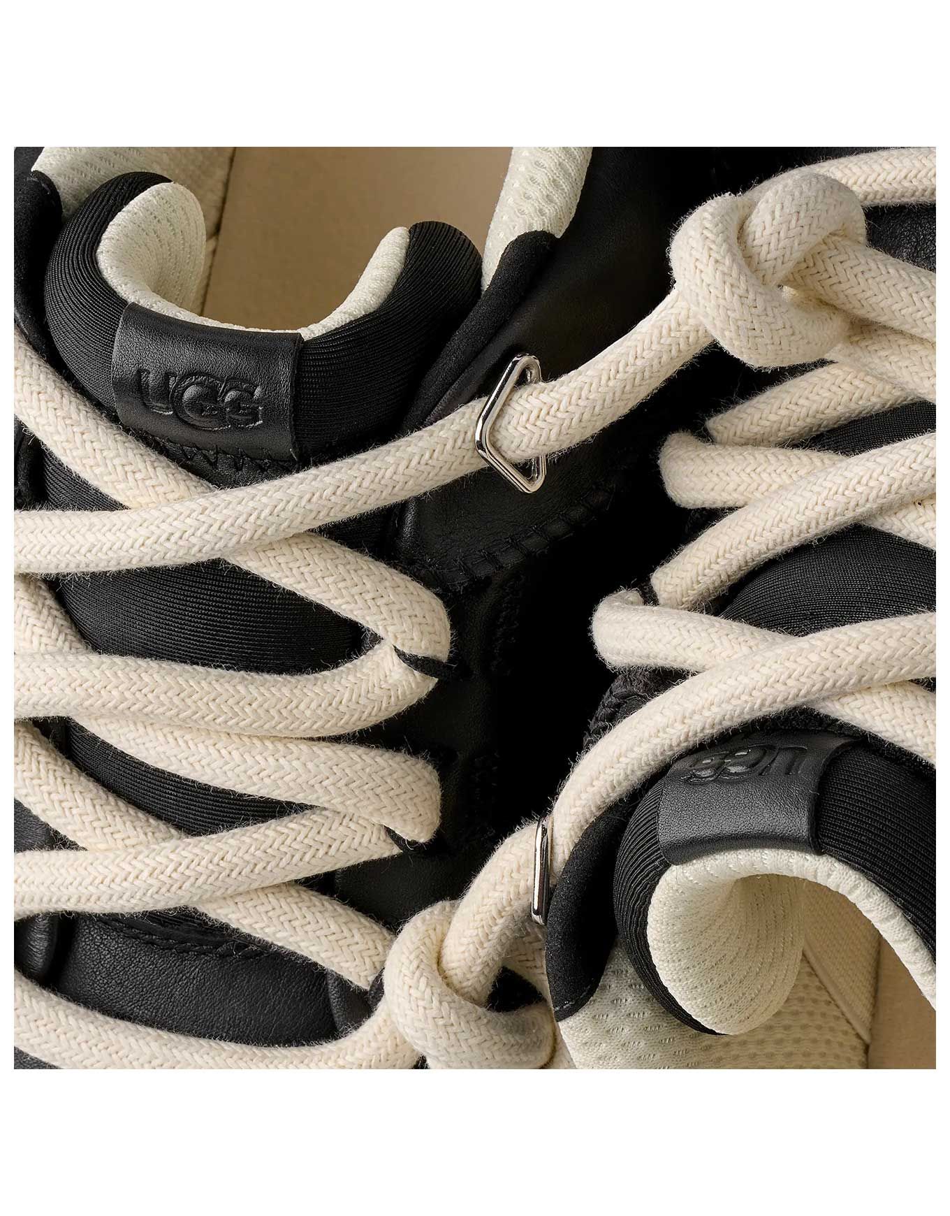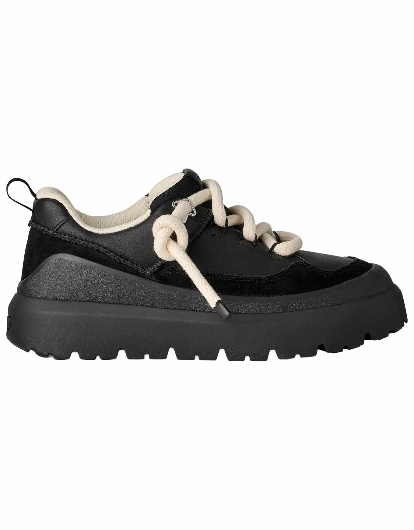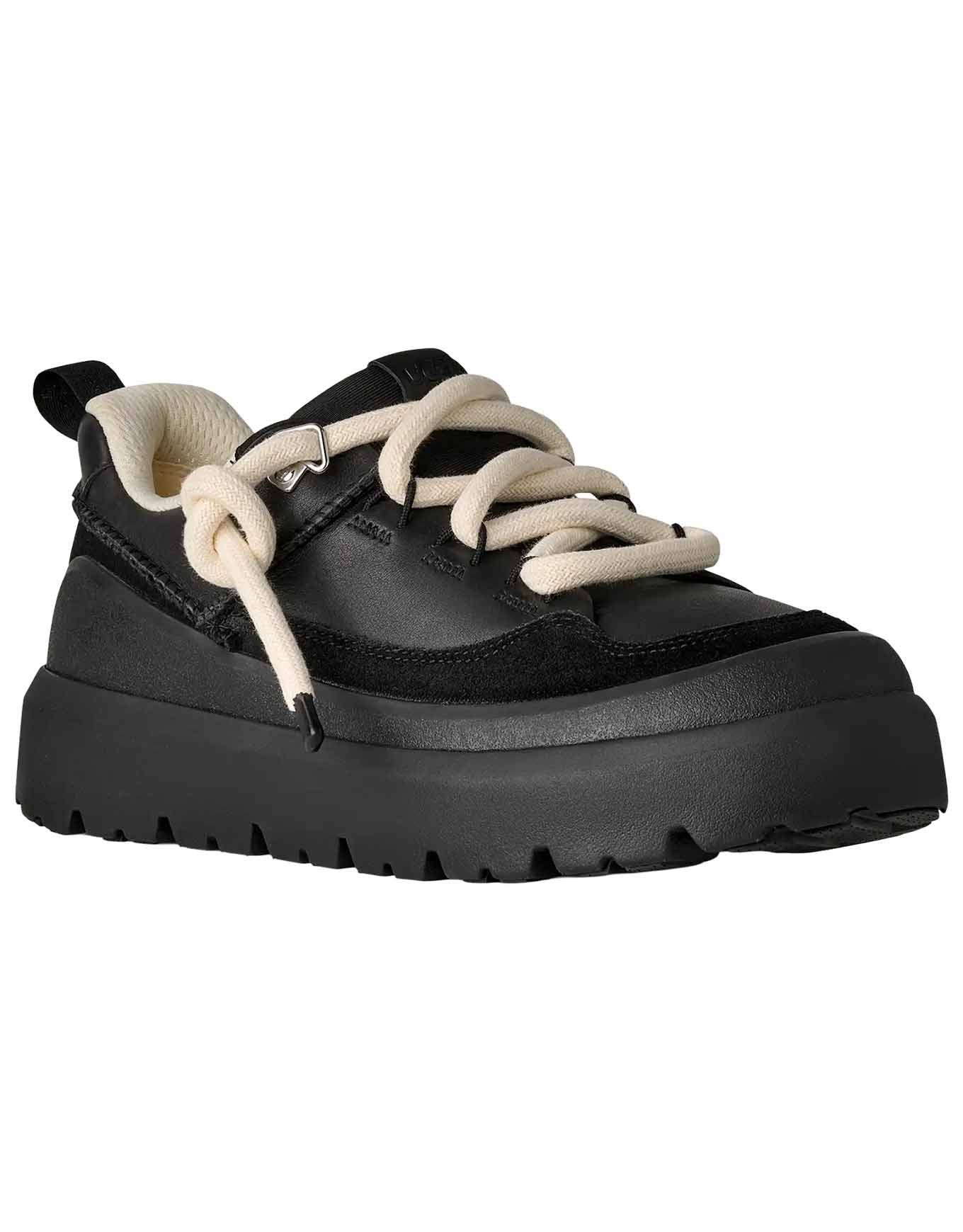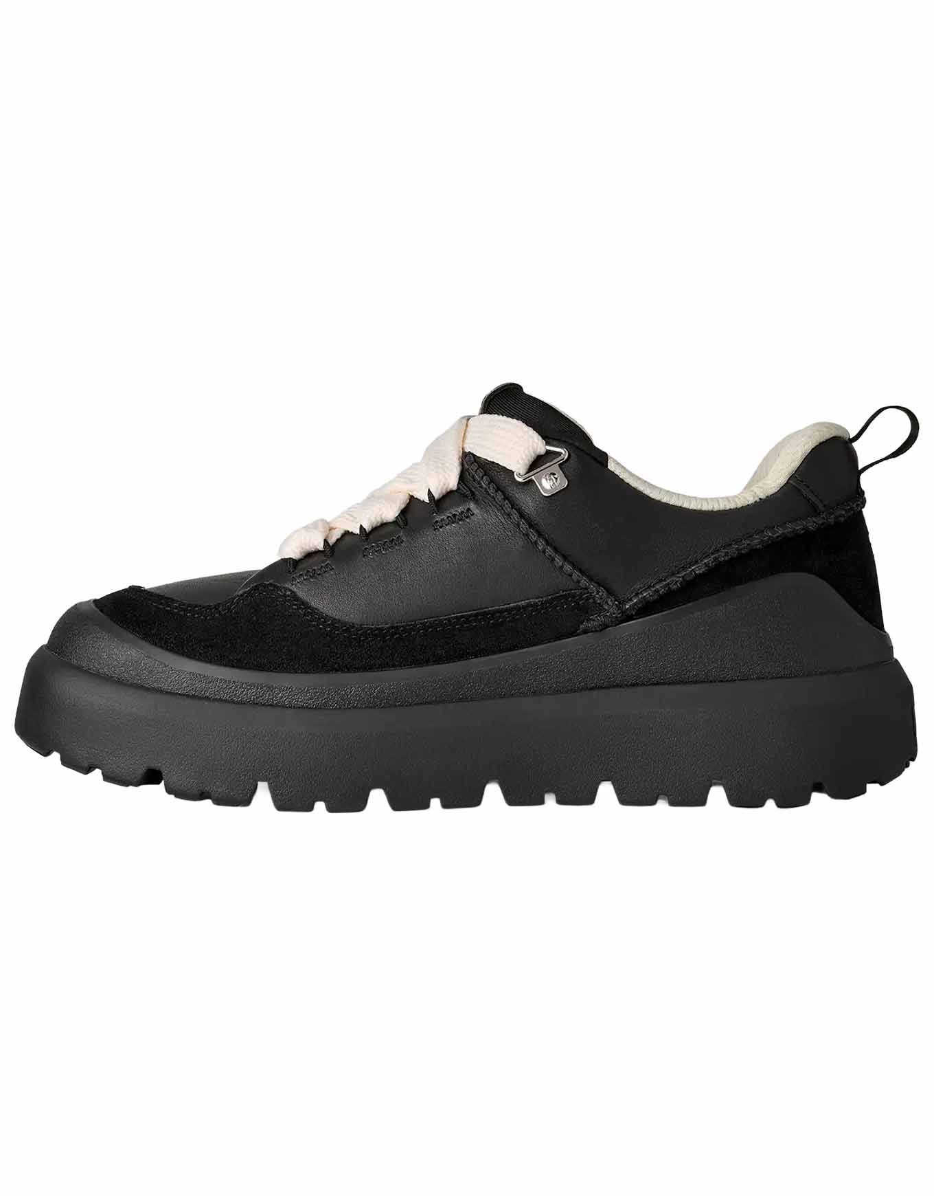 UGG Heritage Utility Sneaker Black/Black, sneakers urbaines en cuir pleine fleur, doublure et lacets recyclés, semelle légère en EVA de canne à sucre et crampons Spider Rubber® pour confort, adhérence et style éco-responsable.
