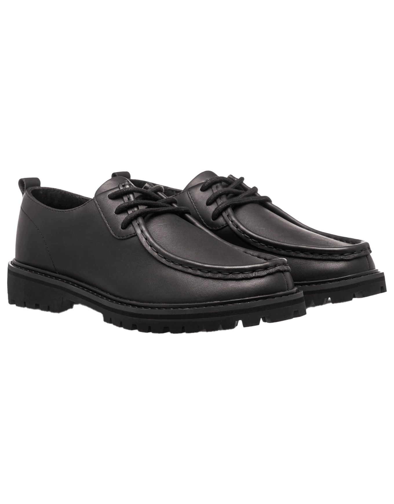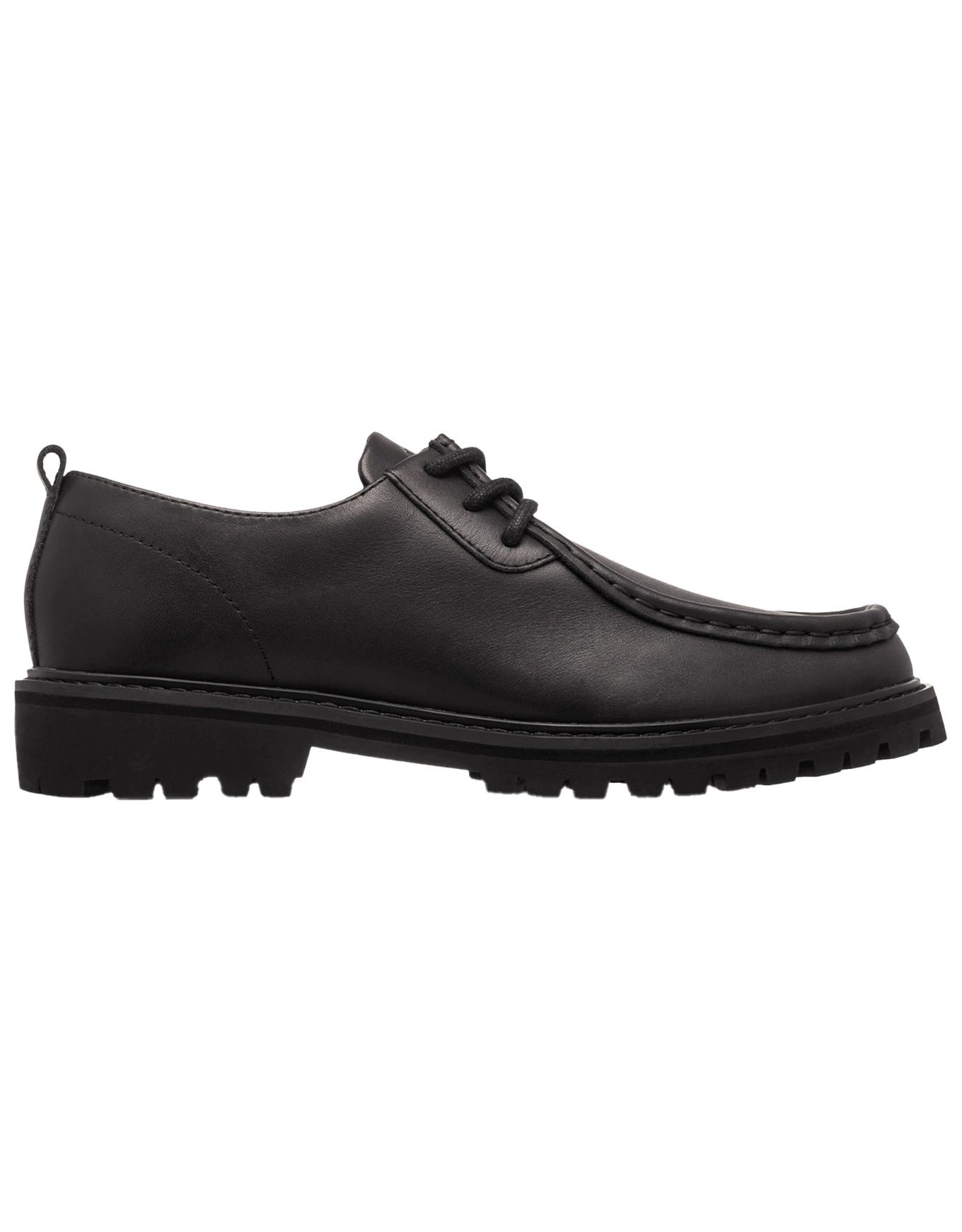 Chaussures Clae Morrison Antique Black Leather revisitent le style moc-toe en cuir résistant, semelle caoutchouc crampons, confort sneakers, look intemporel.