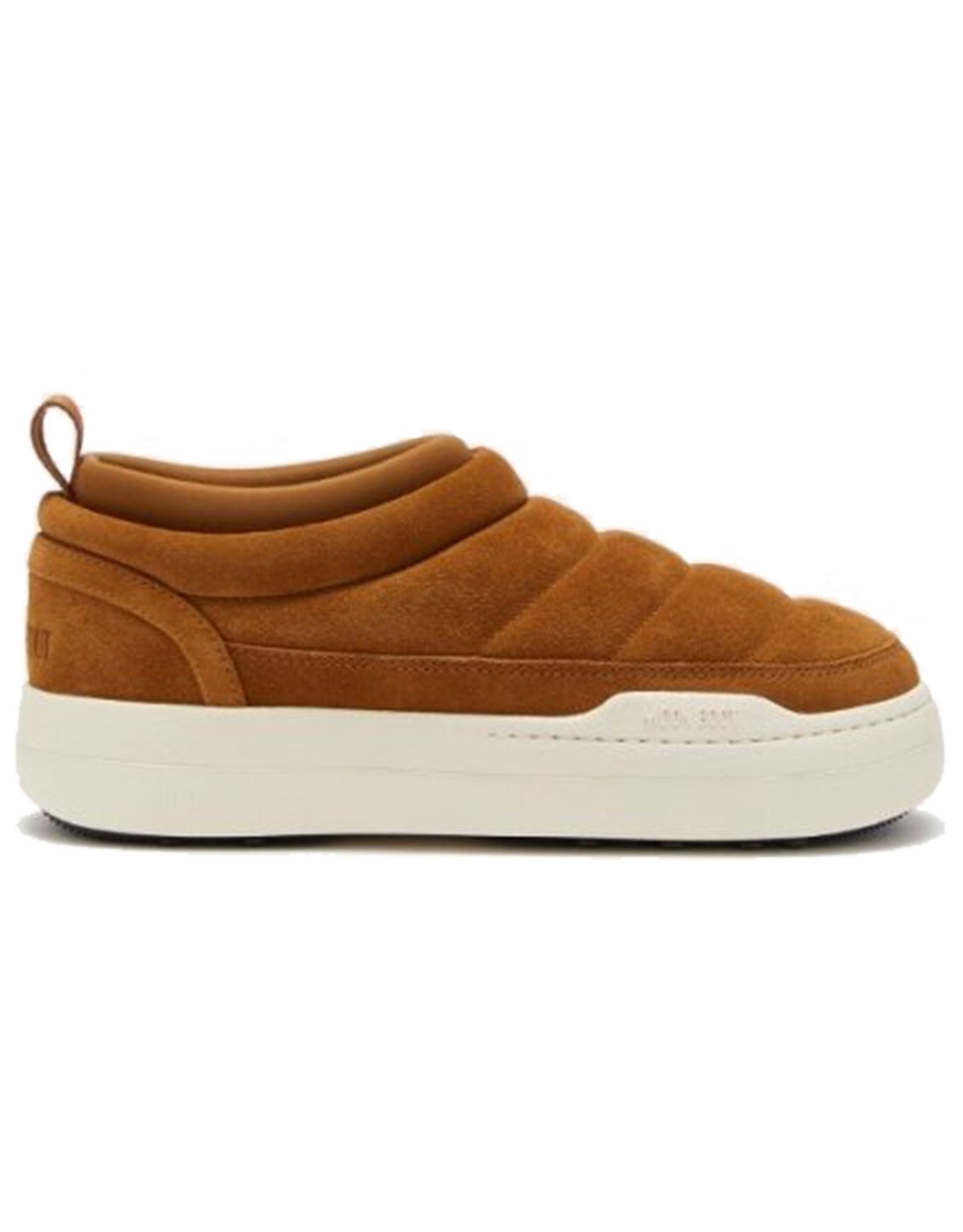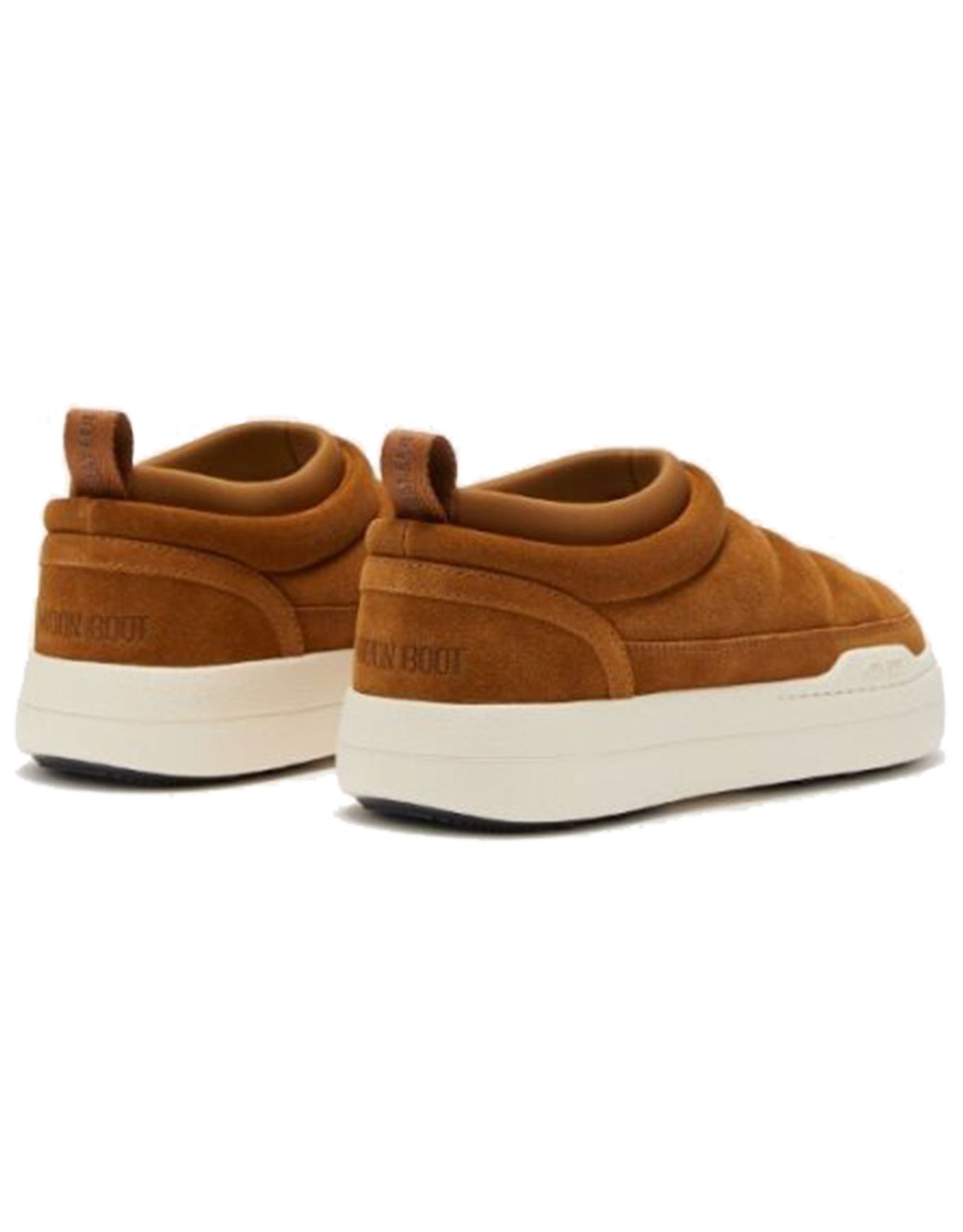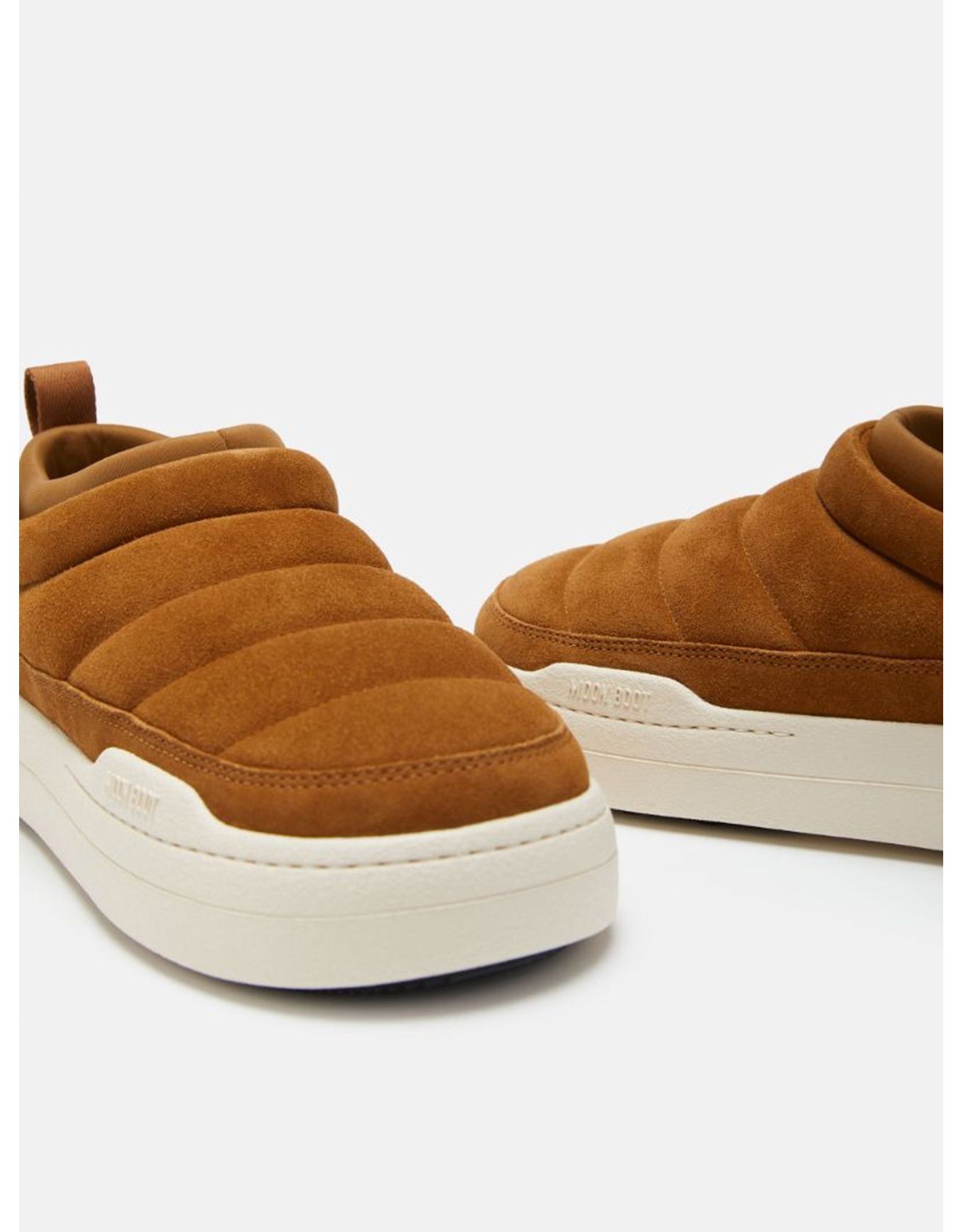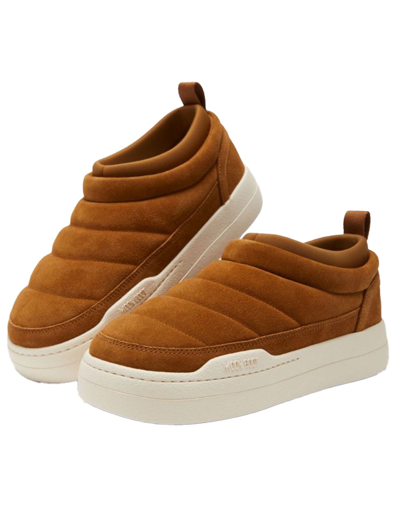 Moon Boot Park Soft Suede Cognac, chaussons d’hiver unisexes en daim, offrent chaleur et élégance en ville ou à la montagne grâce à leur coupe basse.