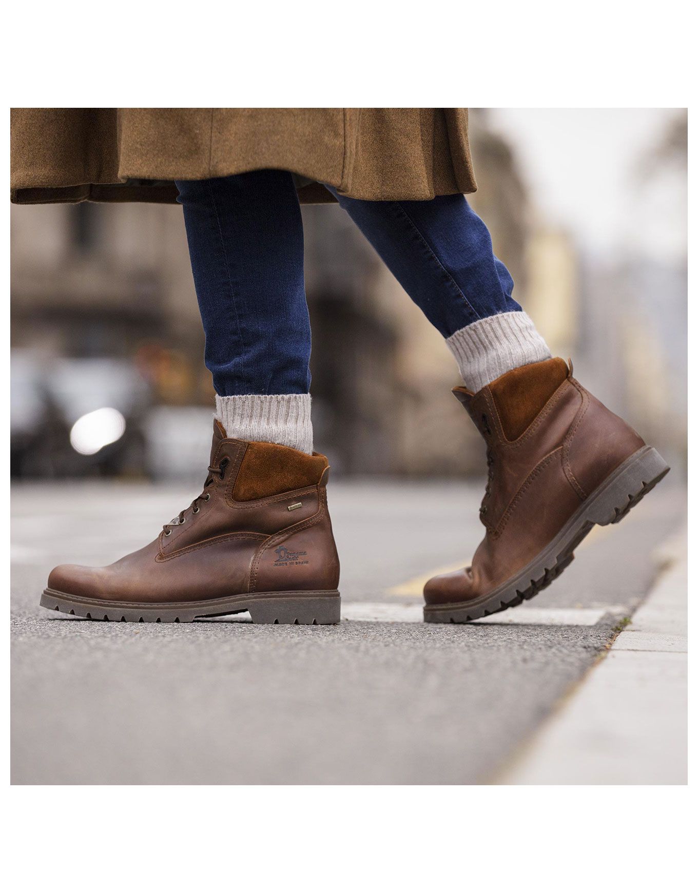 Les bottes Panama Jack Amur GTX C8 Napa Grass Cuero/Bark pour homme associent cuir nappa gras imperméable et membrane GORE-TEX pour garder vos pieds au sec en ville ou en rando. Semelle anatomique amovible et caoutchouc naturel assurent confort et adhérence, tige 14 cm et talon 4,5 cm, fabrication espagnole.