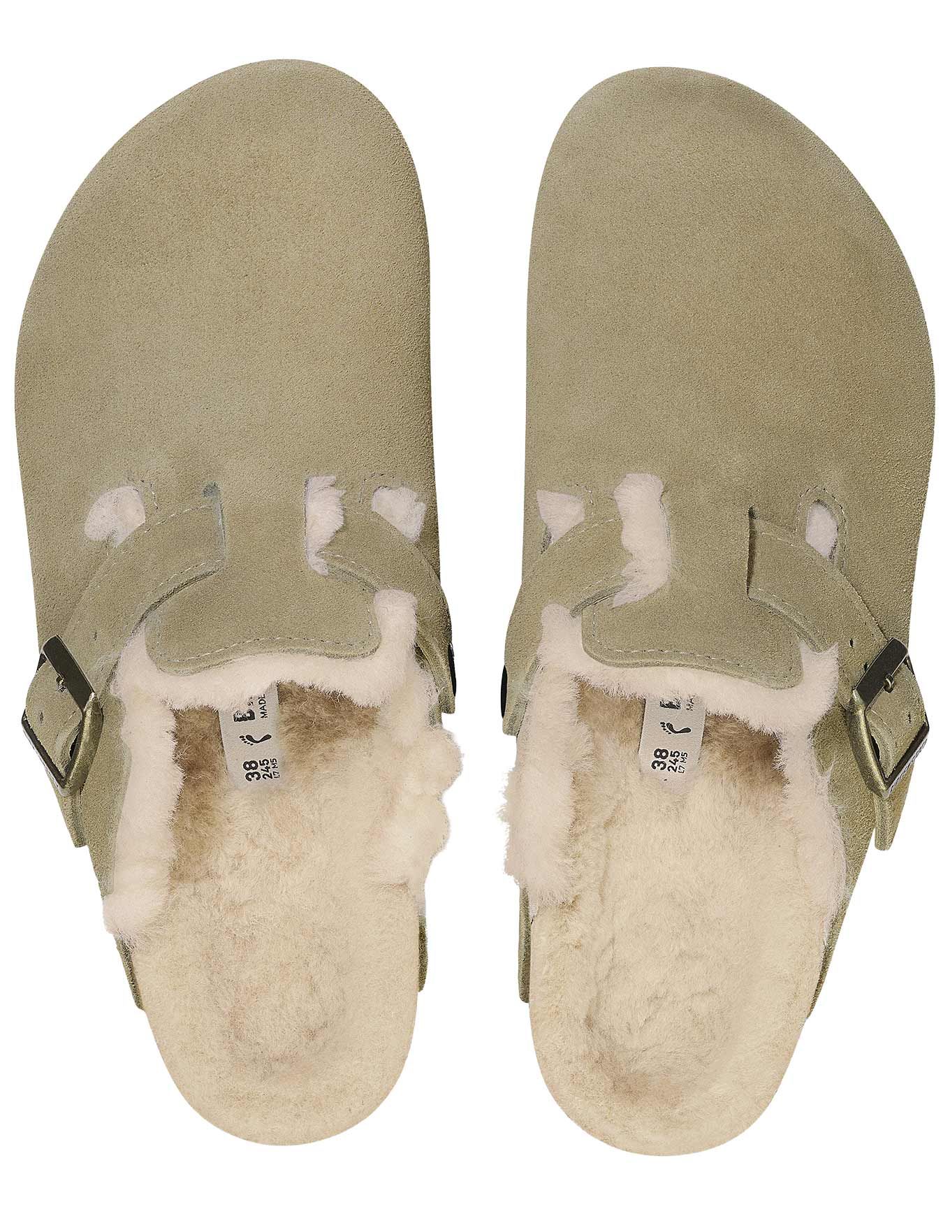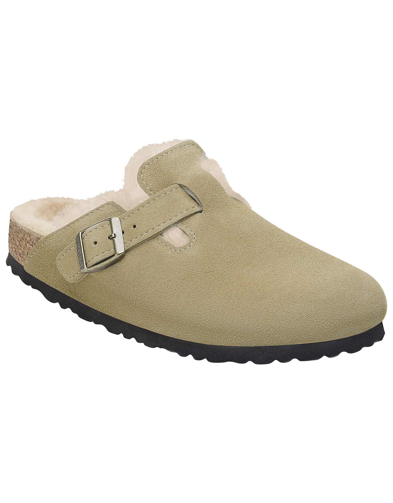 Sabot unisexe Birkenstock Boston Shearling Suede Regular Taupe en cuir suédé haut de gamme, doublé peau d’agneau pour un confort chaud et respirant durant l’hiver.