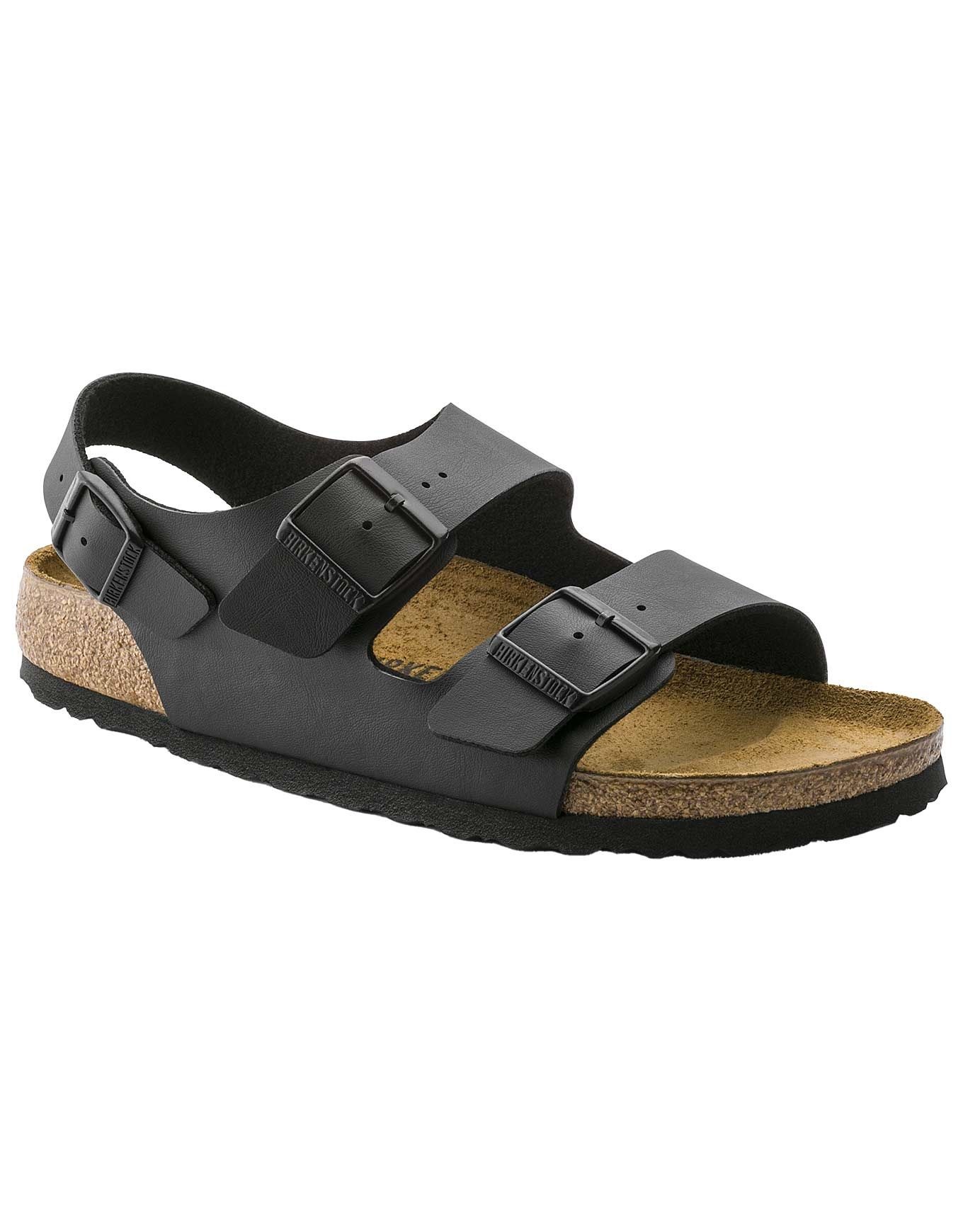 Sandales Milano Birko-Flor Black unisexe de Birkenstock en Birko-Flor® doux et résistant, ajustables par deux brides avec fermeture scratch pour un maintien fiable sur route ou sentier.