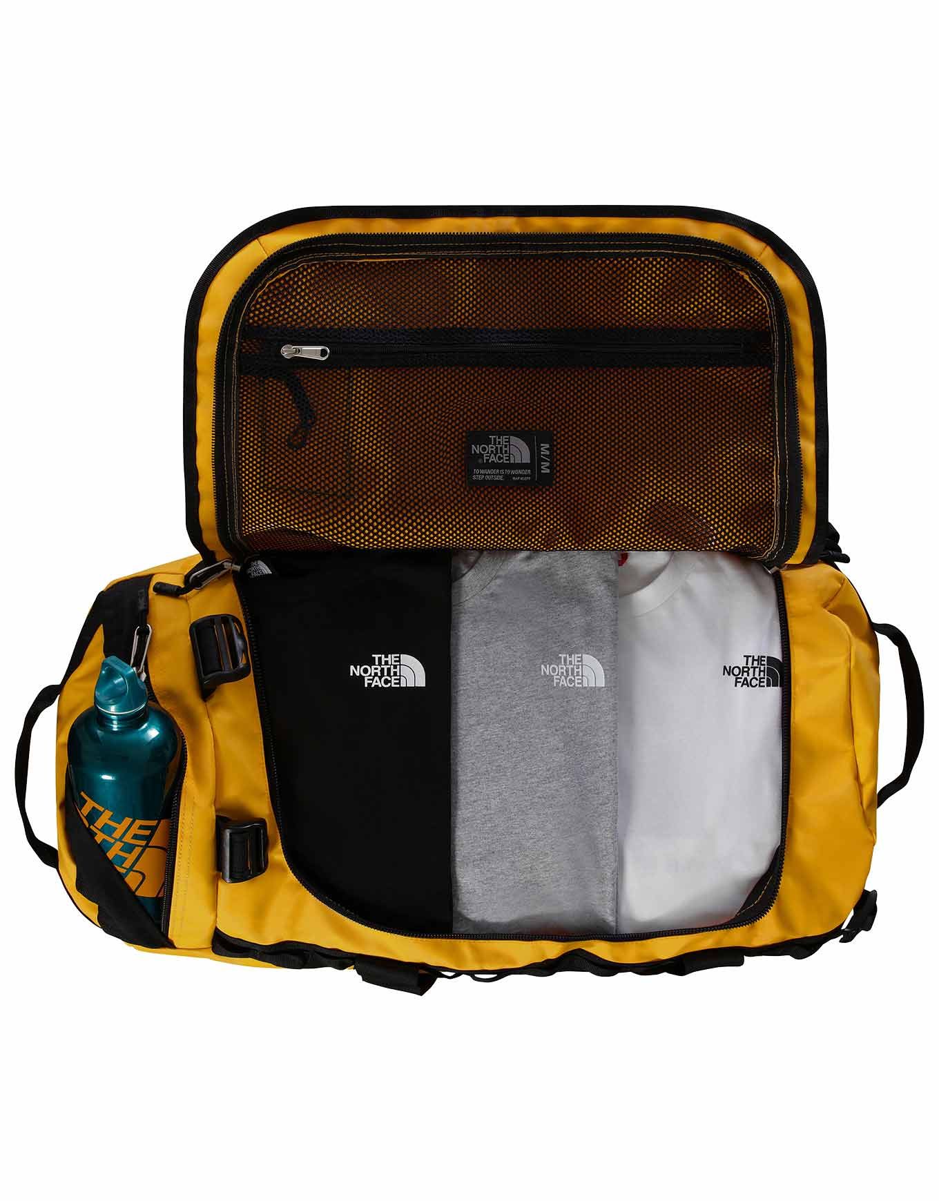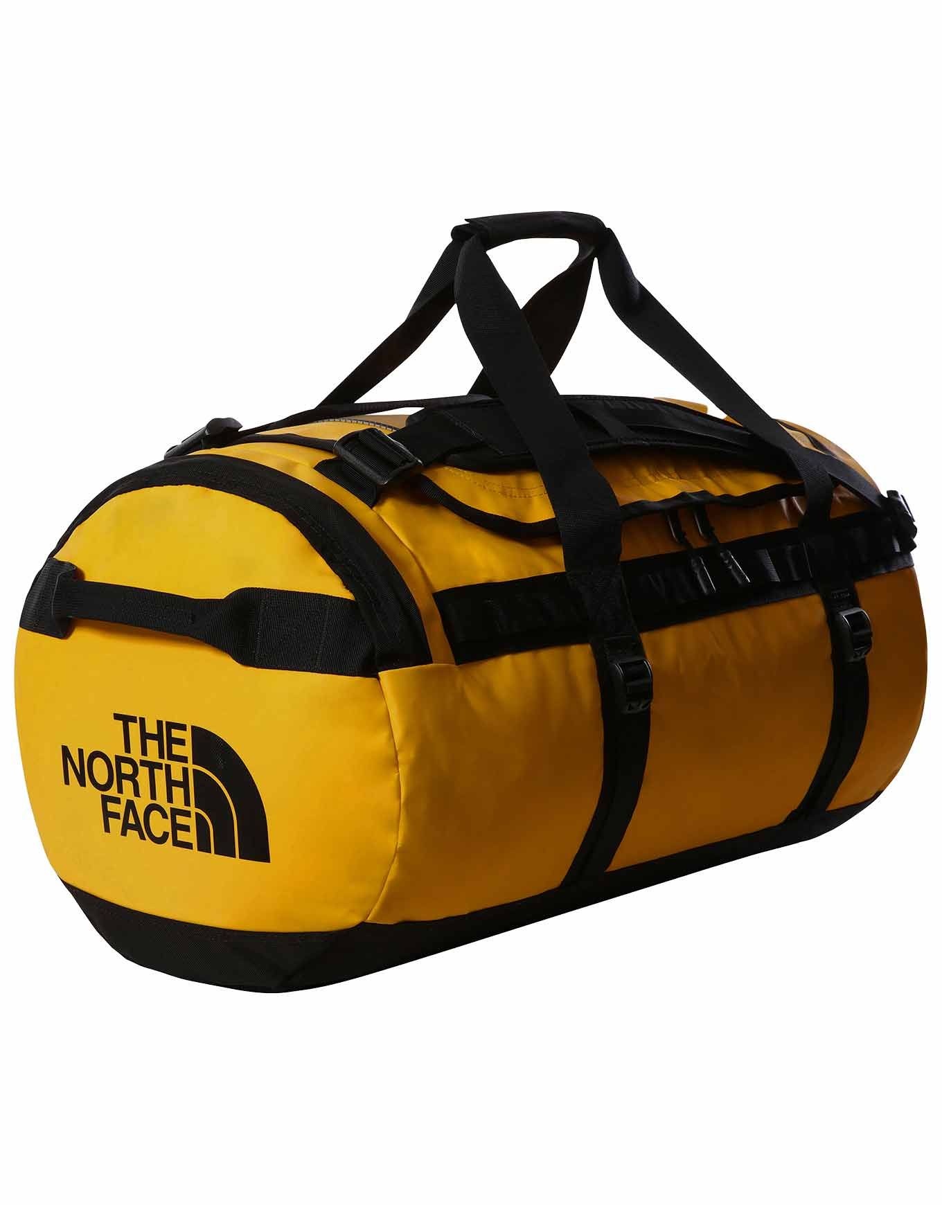 The North Face Base Camp Duffel M Summit Gold est un sac de voyage 71 L en nylon balistique résistant à l’eau, convertible en sac à dos grâce à des bretelles amovibles, avec sangles de compression et poche séparatrice.