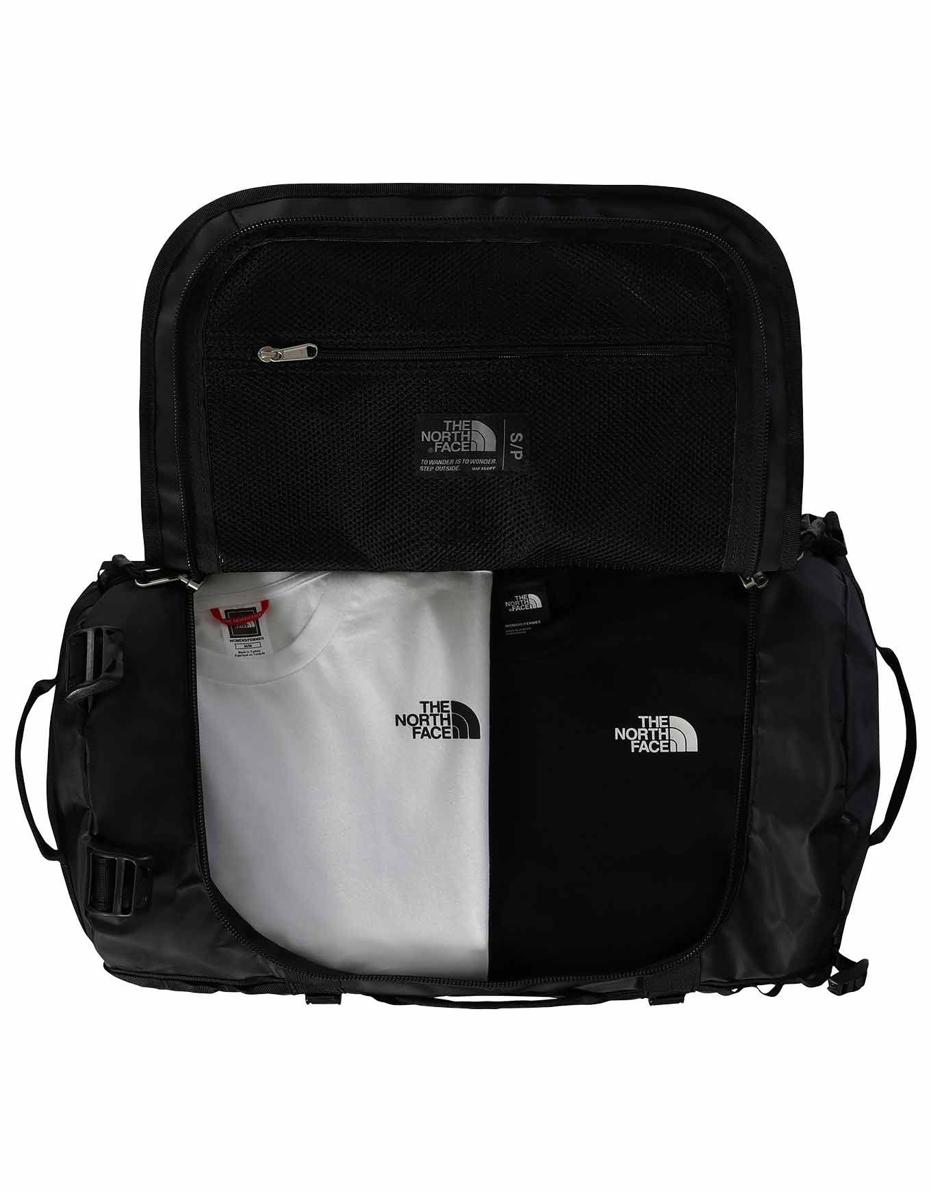 The North Face Base Camp Duffel S TNF Black est un sac de voyage 50 L en nylon balistique résistant à l’eau, convertible en sac à dos par bretelles ergonomiques amovibles, avec compartiment chaussures/sales et quatre sangles de compression.