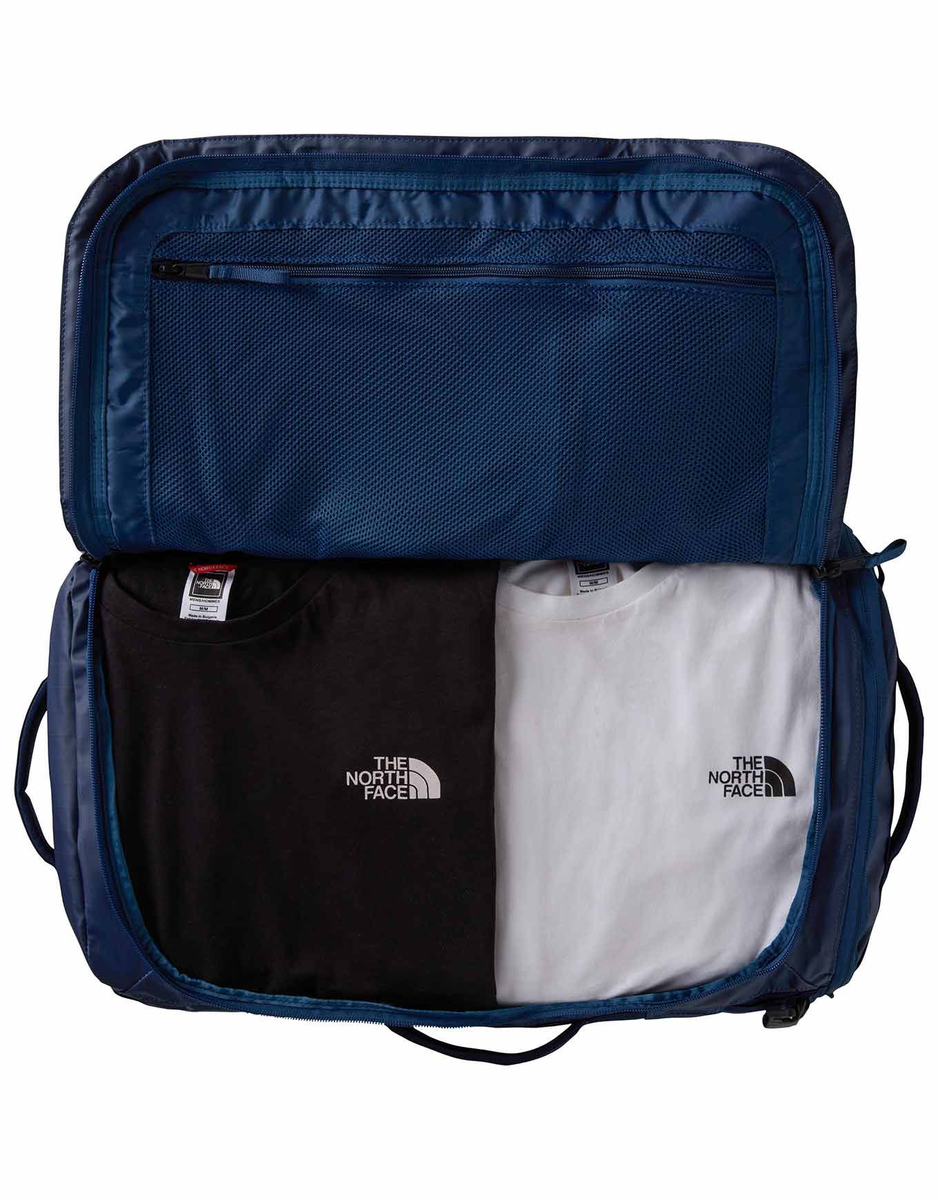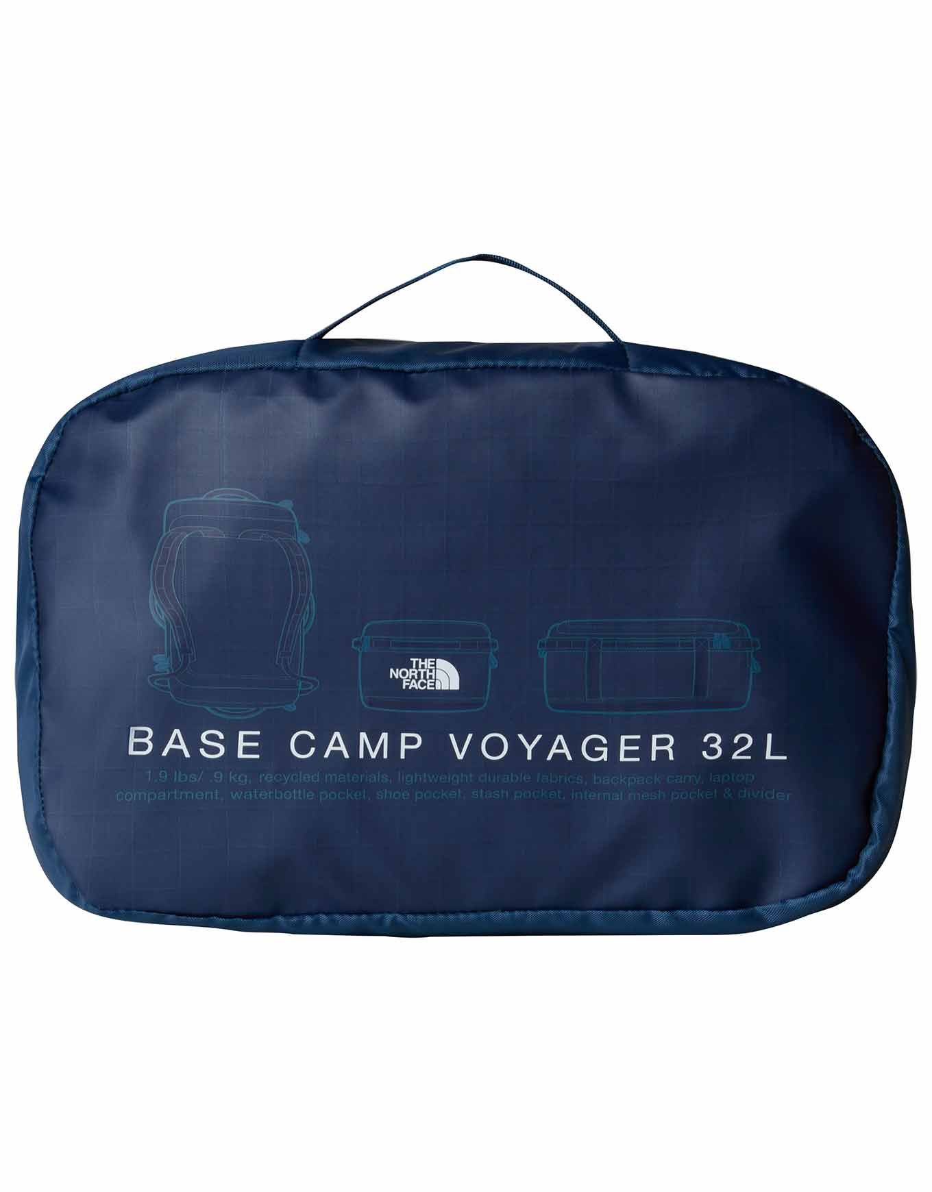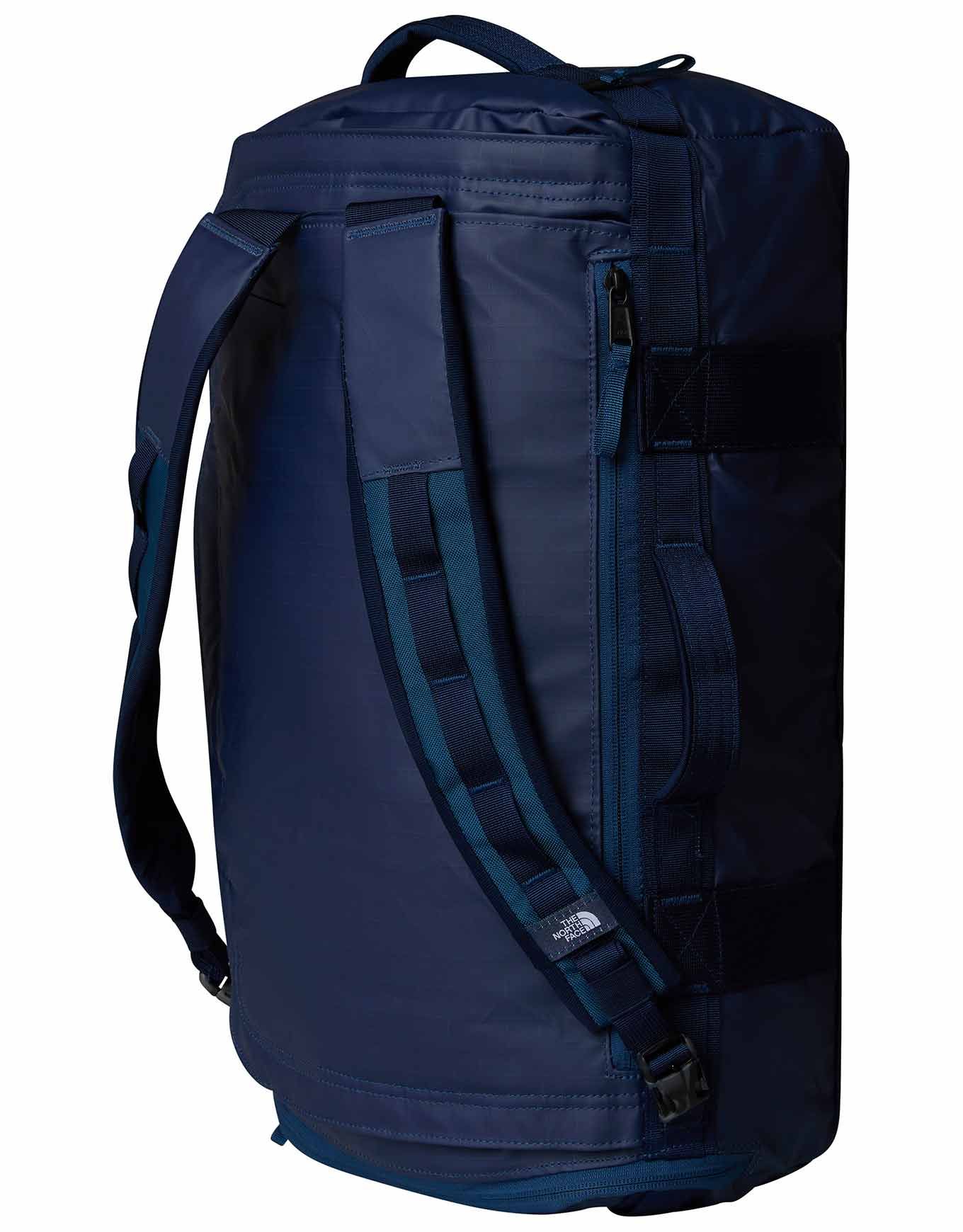 The North Face Base Camp Voyager Duffel 32L Shady Blue Summit Navy est un sac de voyage ultra-résistant en matière recyclée, léger et convertible en sac à dos, avec poche ordinateur et compartiments réglables.
