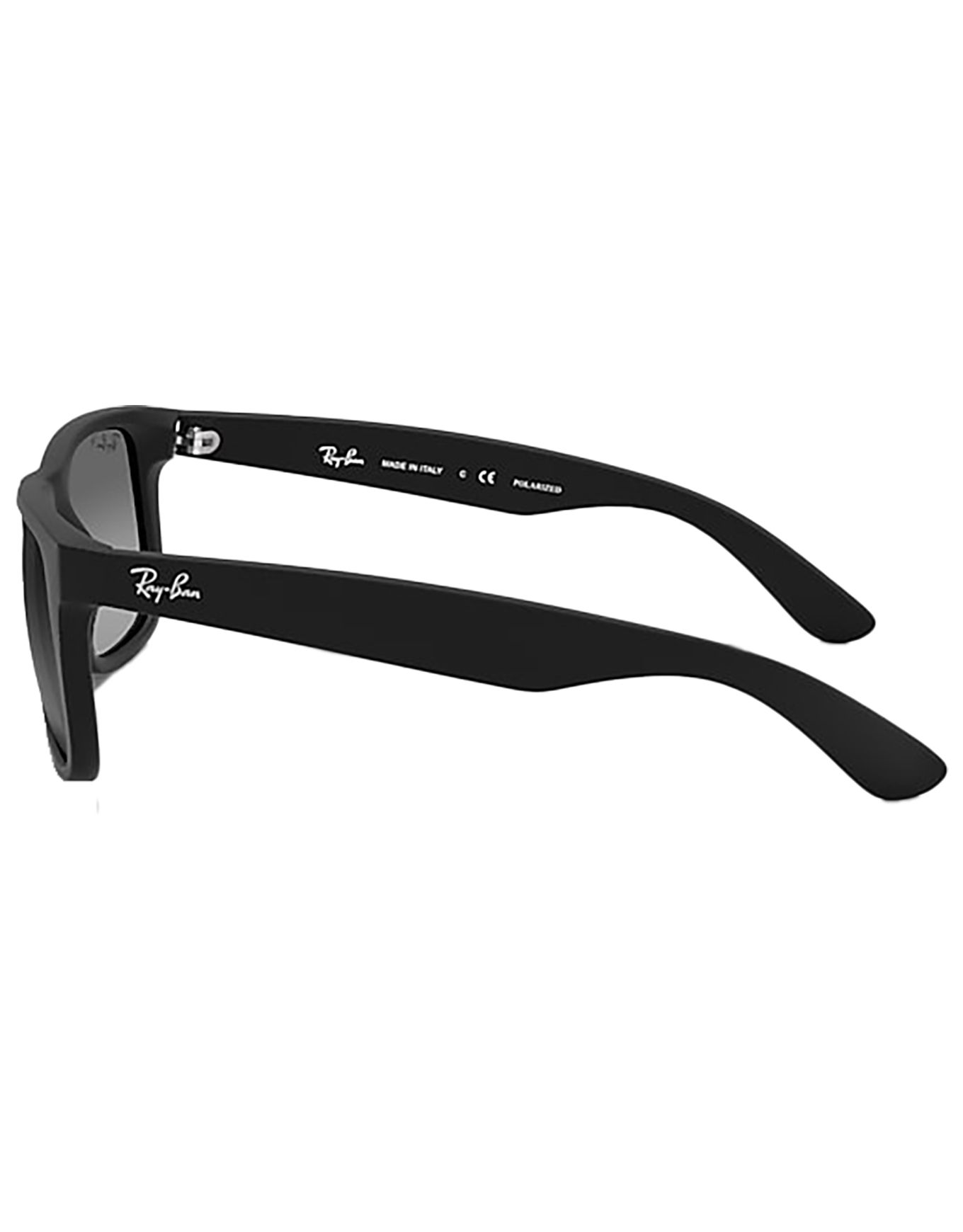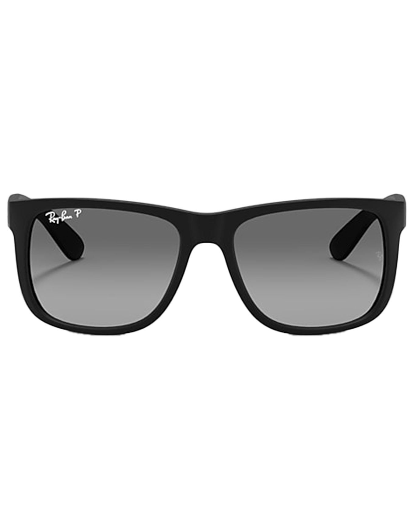 Les lunettes de soleil Ray-Ban Justin Classic Matte Rubber Black Light Grey offrent une protection polarisante catégorie 2 avec verres dégradés, monture nylon carrée légère à pont haut et étui inclus.