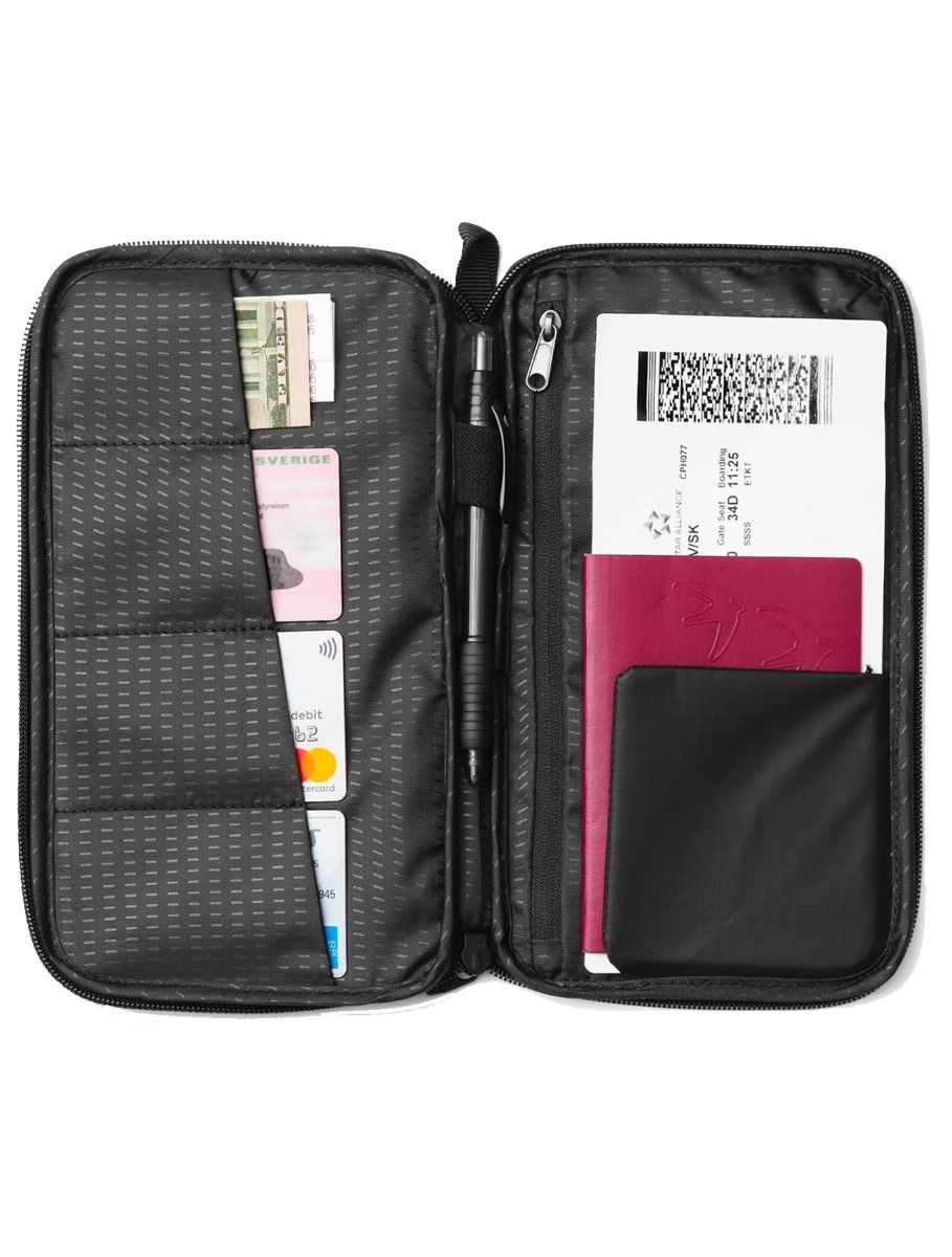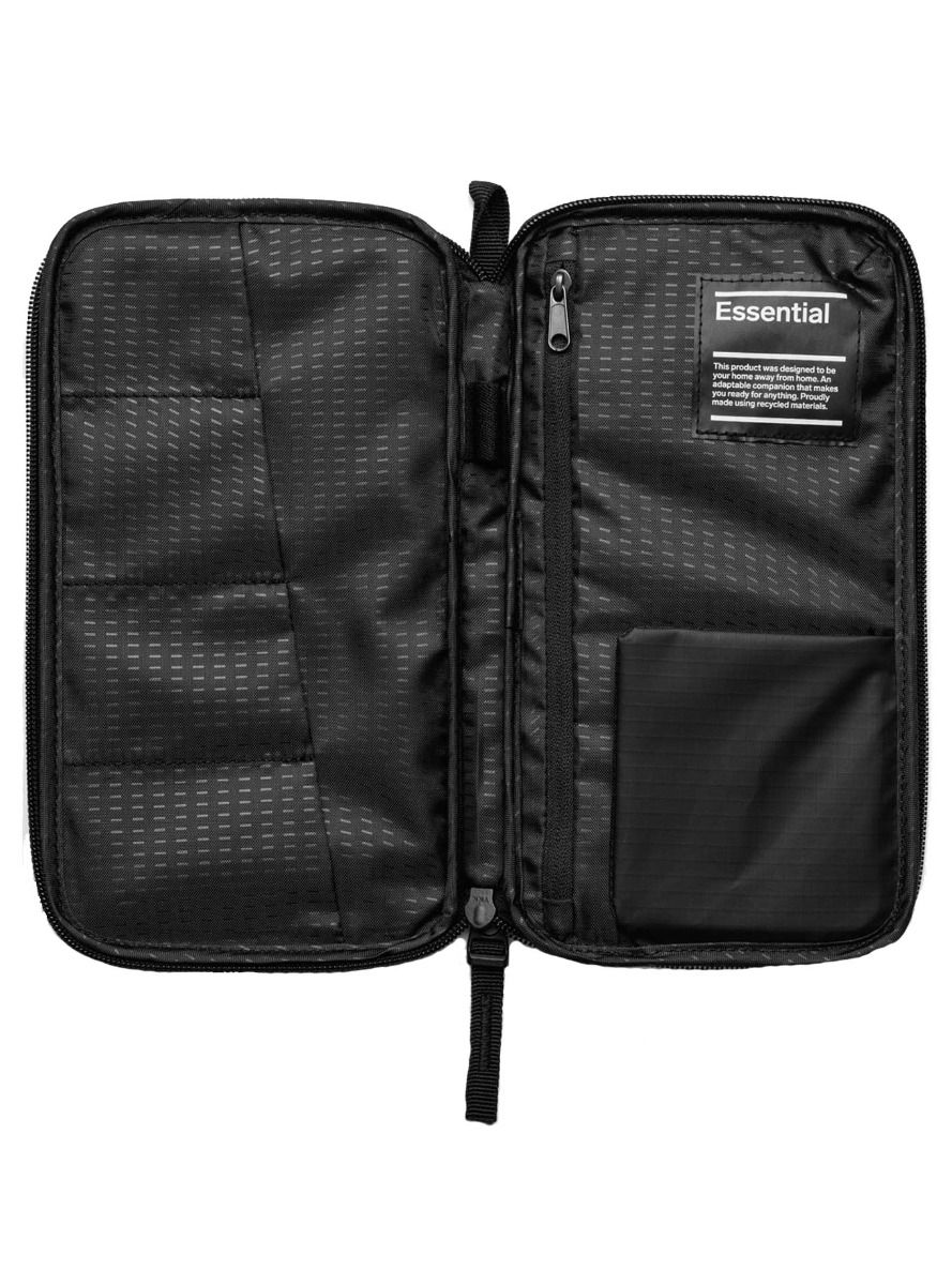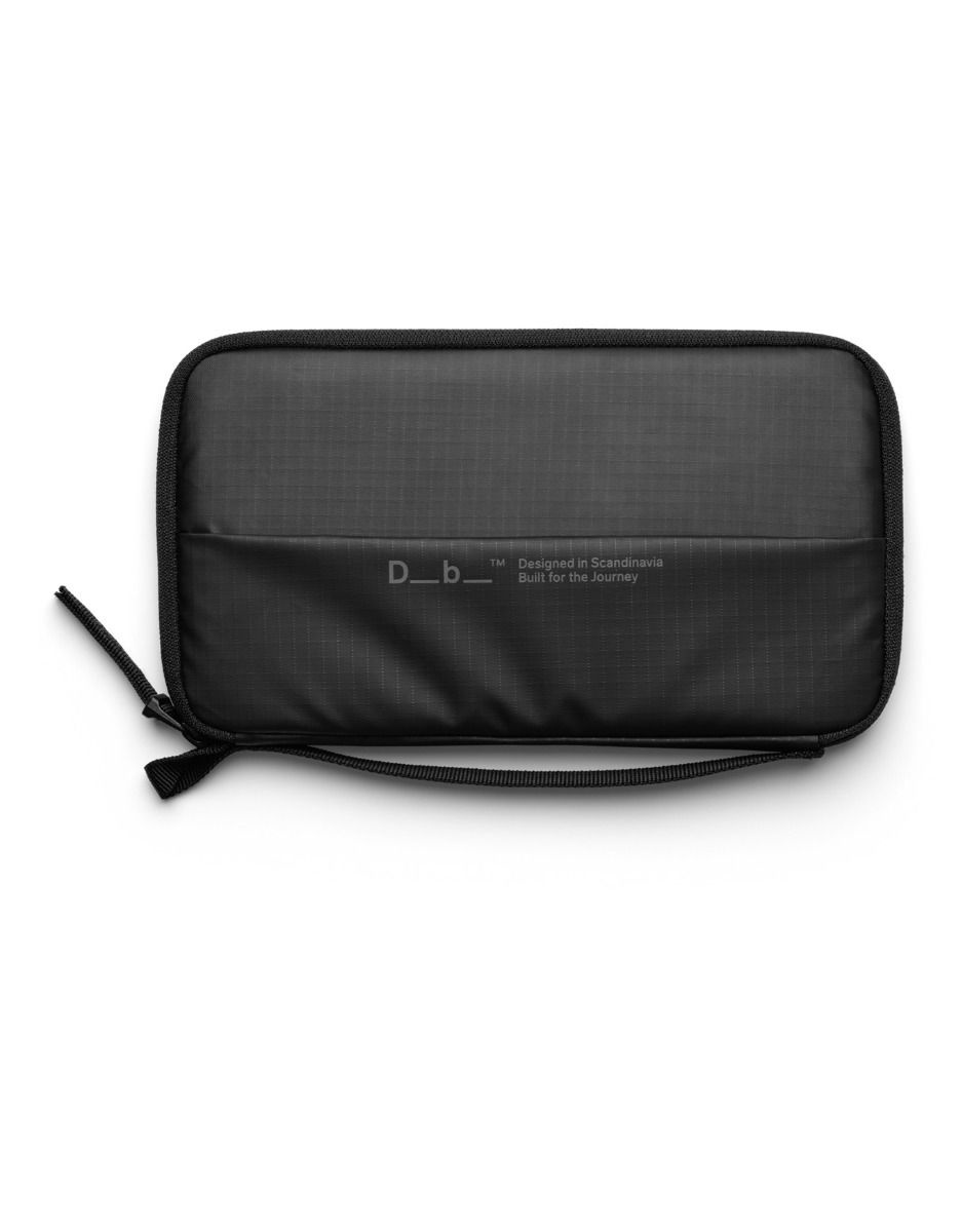 Db Essential Passport Cover Black Out : porte-passeport en polyamide recyclé résistant avec compartiment passeport, poche zippée billets, 4 fentes cartes, porte-stylo et poche clés pour voyager organisé.