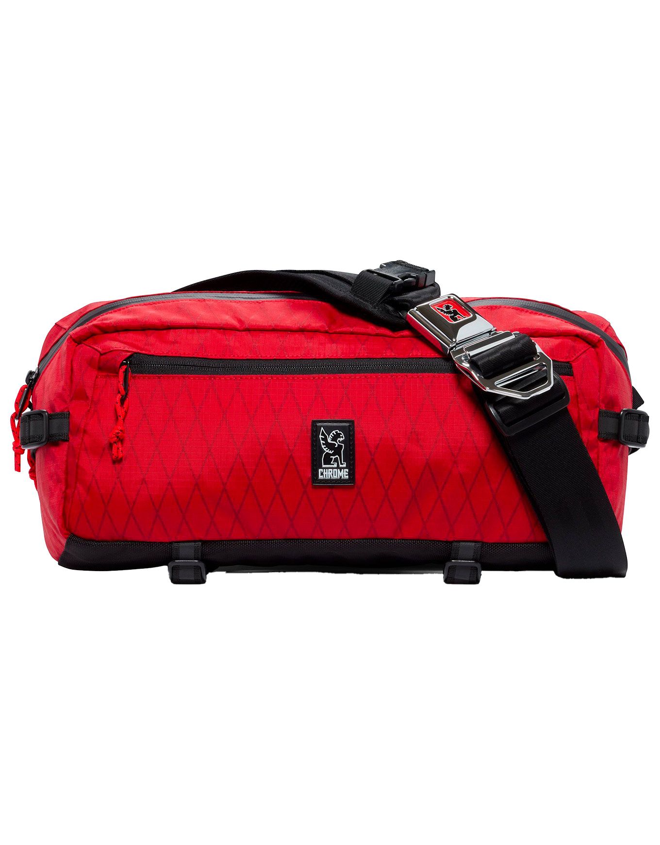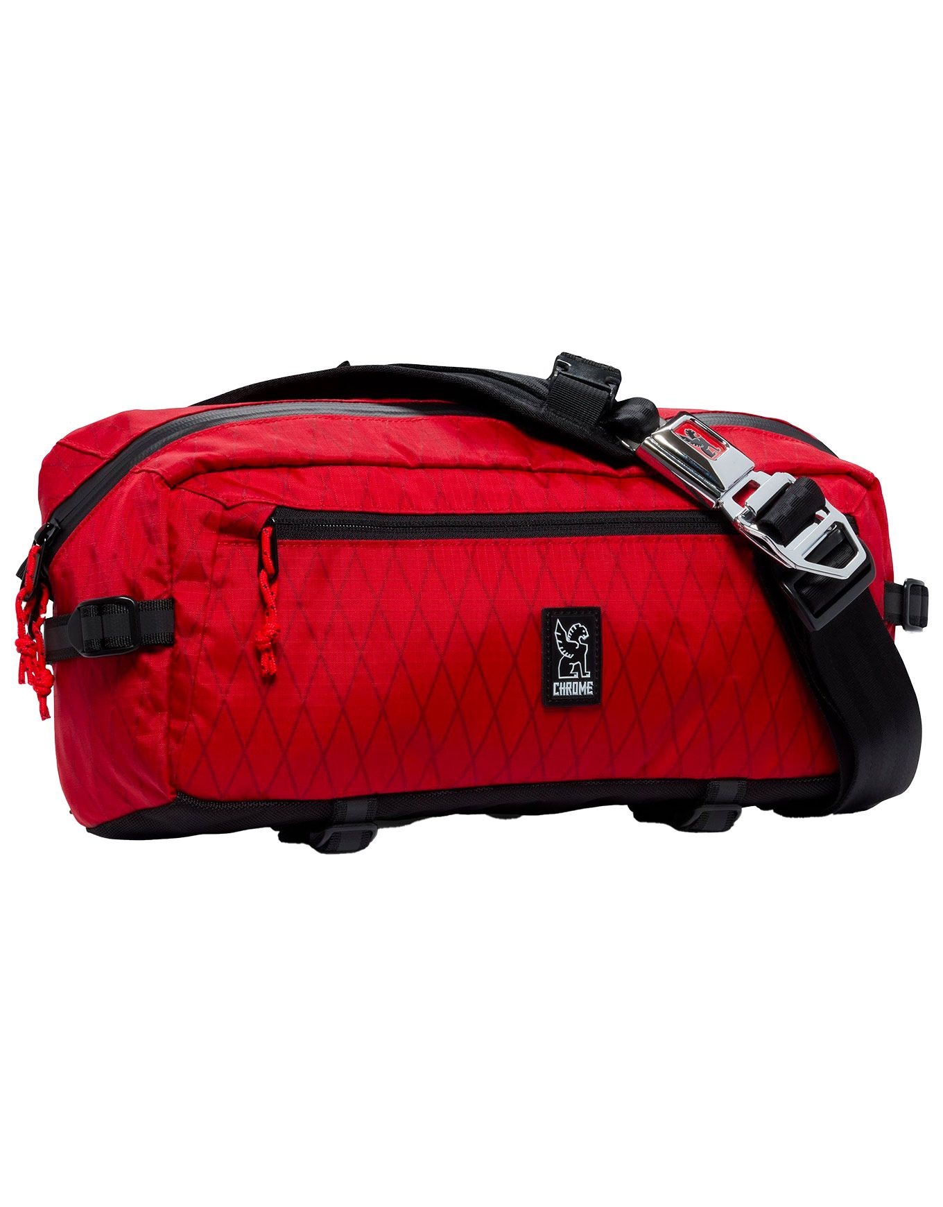Sacoche en bandoulière Chrome Kadet Red X, 9 L en nylon 1050D ultra-résistant, assurée par la boucle ceinture de sécurité et la sangle latérale pour une stabilité optimale à vélo ou à pied en ville.