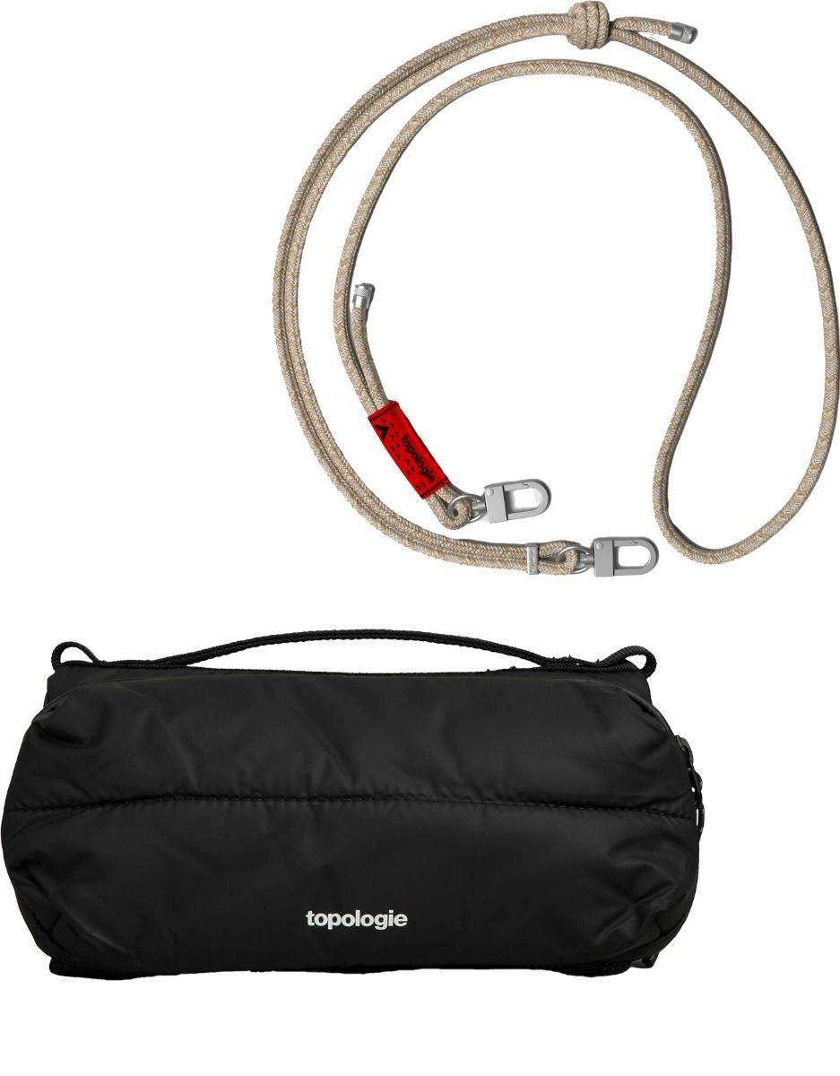 Sacoche Topologie Bottle Sacoche Medium Black Dry en tissu déperlant, conçue pour transporter gourde 500-1000 ml, parapluie ou essentiels. Deux compartiments zippés, poches intérieures, crochet clés, compatible sangles Wares System™.