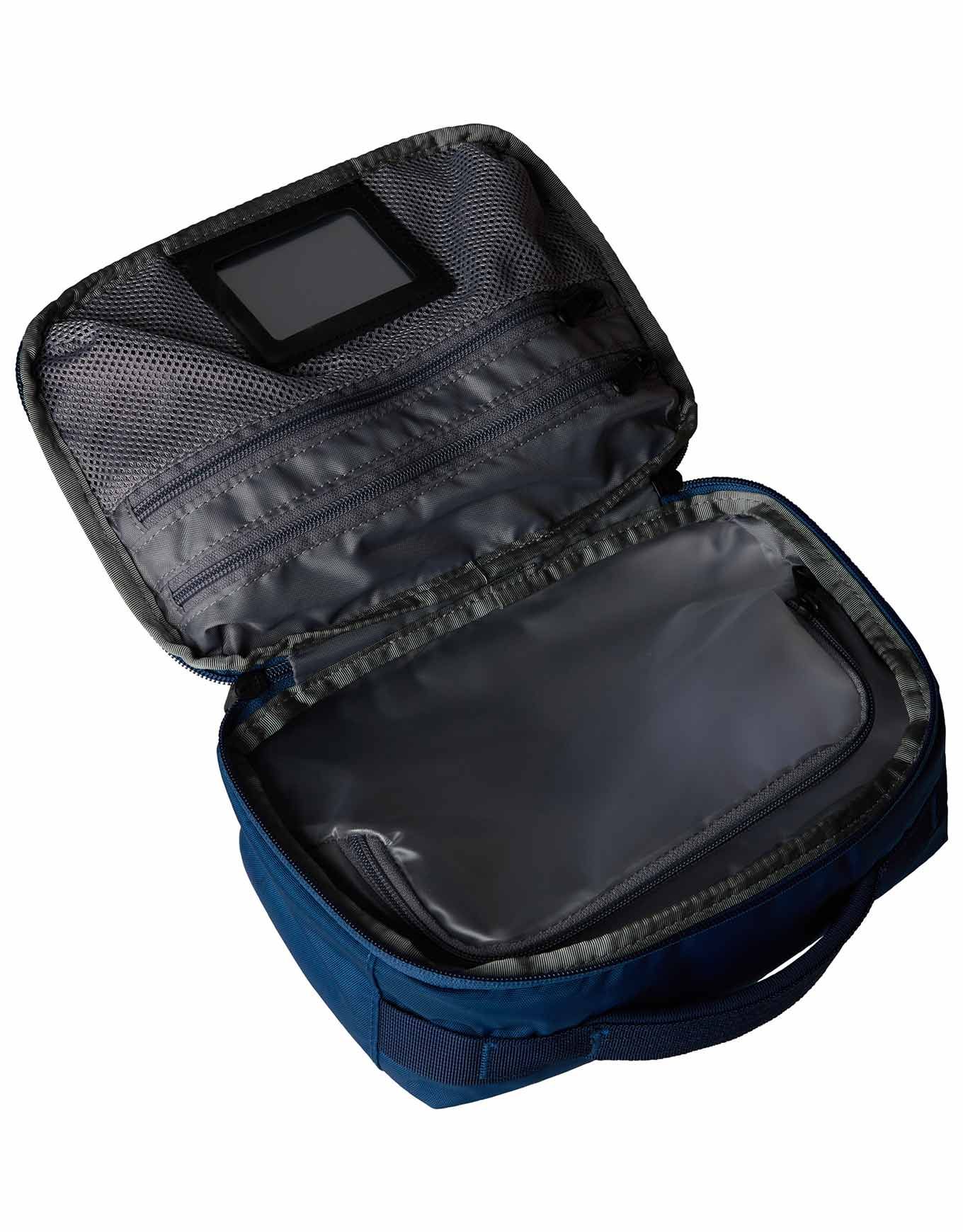 The North Face Base Camp Voyager Toiletry Kit Shady Blue Summit Navy est une trousse de toilette légère en matière recyclée, organisée en deux parties avec poches filet élastiquées, poche zippée séparée pour affaires humides et crochet de suspension intégré.