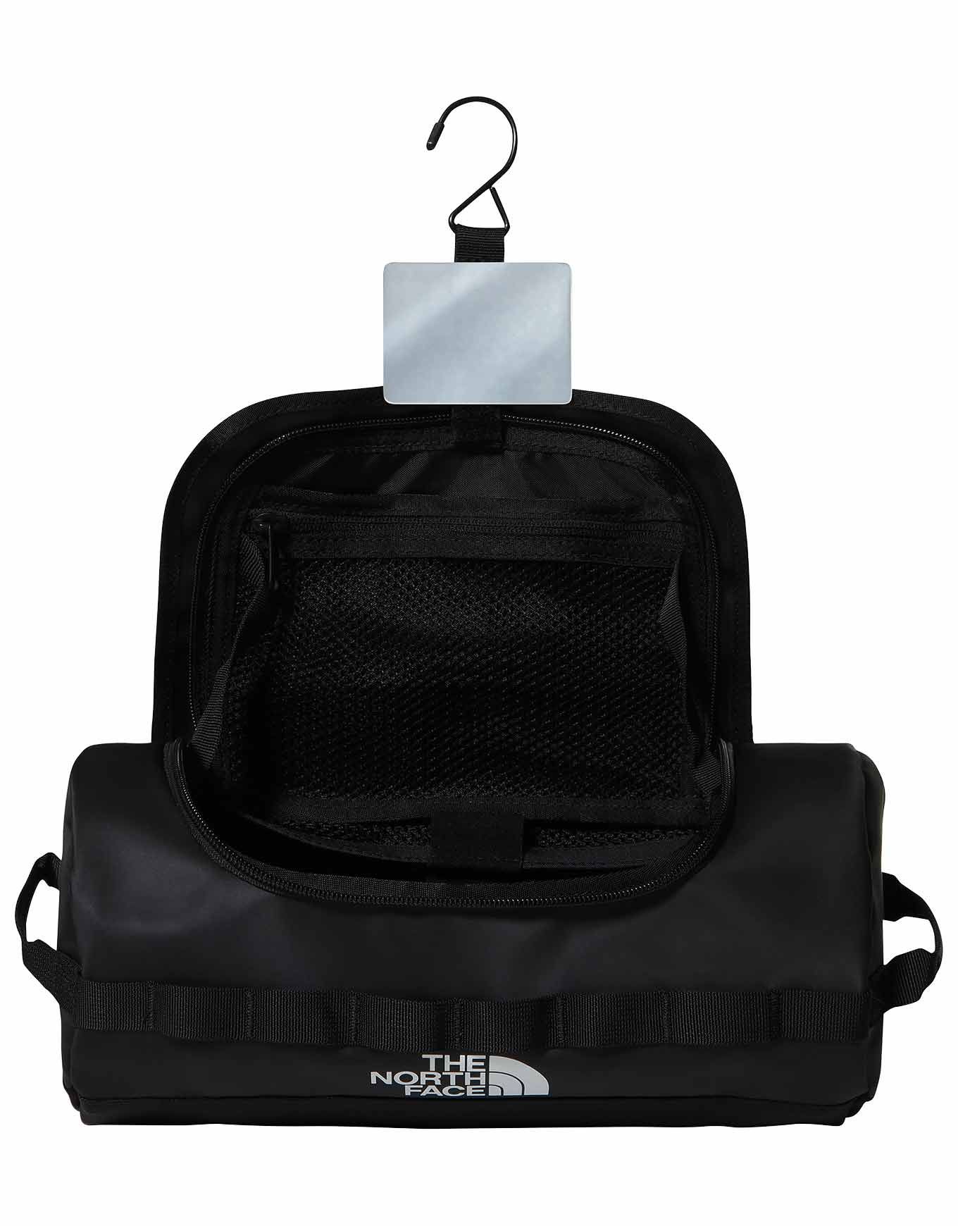 Trousse de toilette The North Face BC Travel Canister L TNF Black/TNF White en matériau durable identique aux sacs Base Camp, grande ouverture, crochet suspendu et miroir intégré, compatible sacs Base Camp.