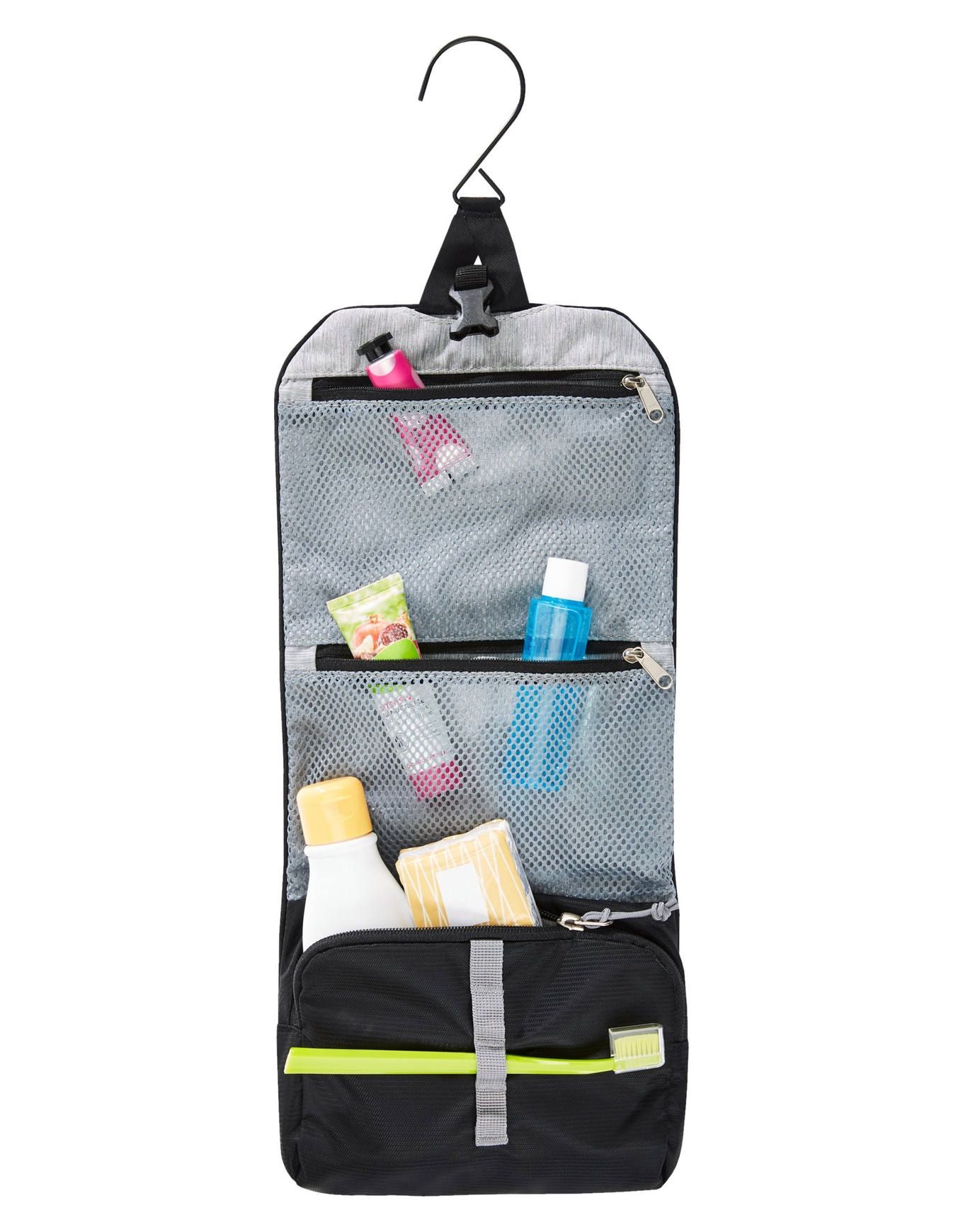 Ce petit étui se fixe aisément par un crochet escamotable. Il offre une poche principale zippée ainsi que deux poches plates en filet, également fermées par zip. Une boucle permet de le refermer en un geste, tandis que des passants maintiennent brosses à dents et accessoires d’hygiène en place.