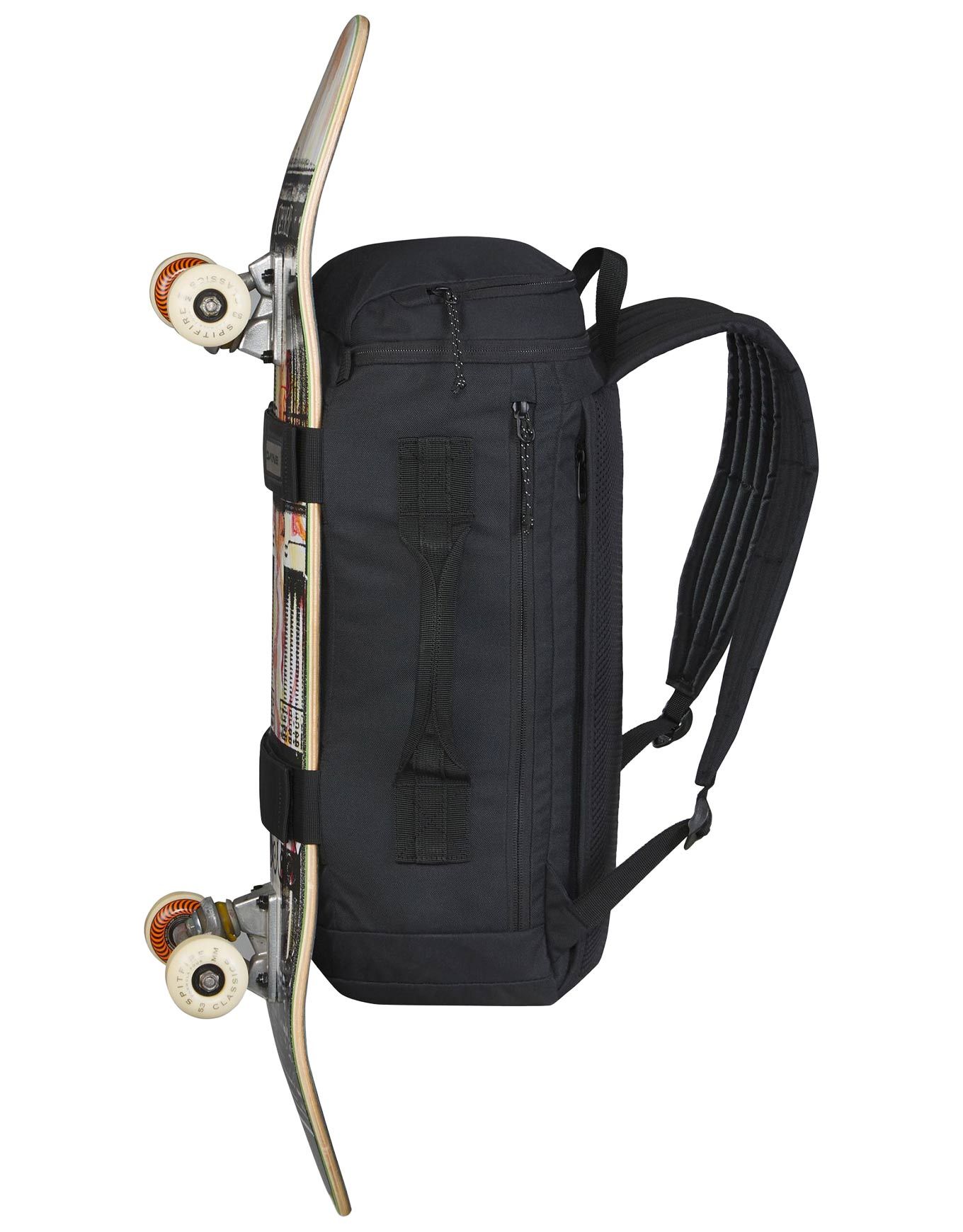 Sac à dos Dakine Mission Street Pack 25L Black conçu pour le skate urbain : compartiment rembourré 15 », porte-planche, poche latérale bouteille, organisation optimisée et détails réfléchissants.