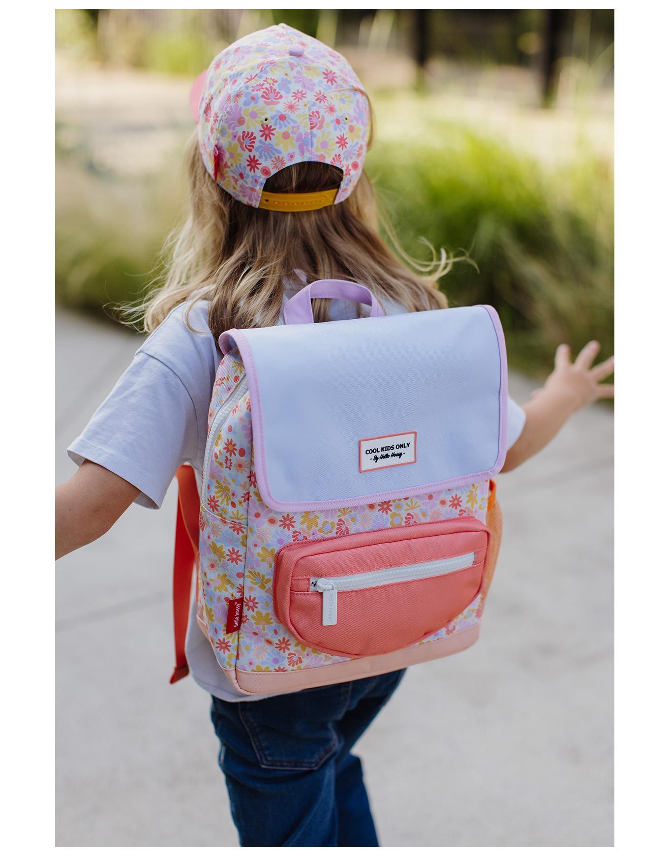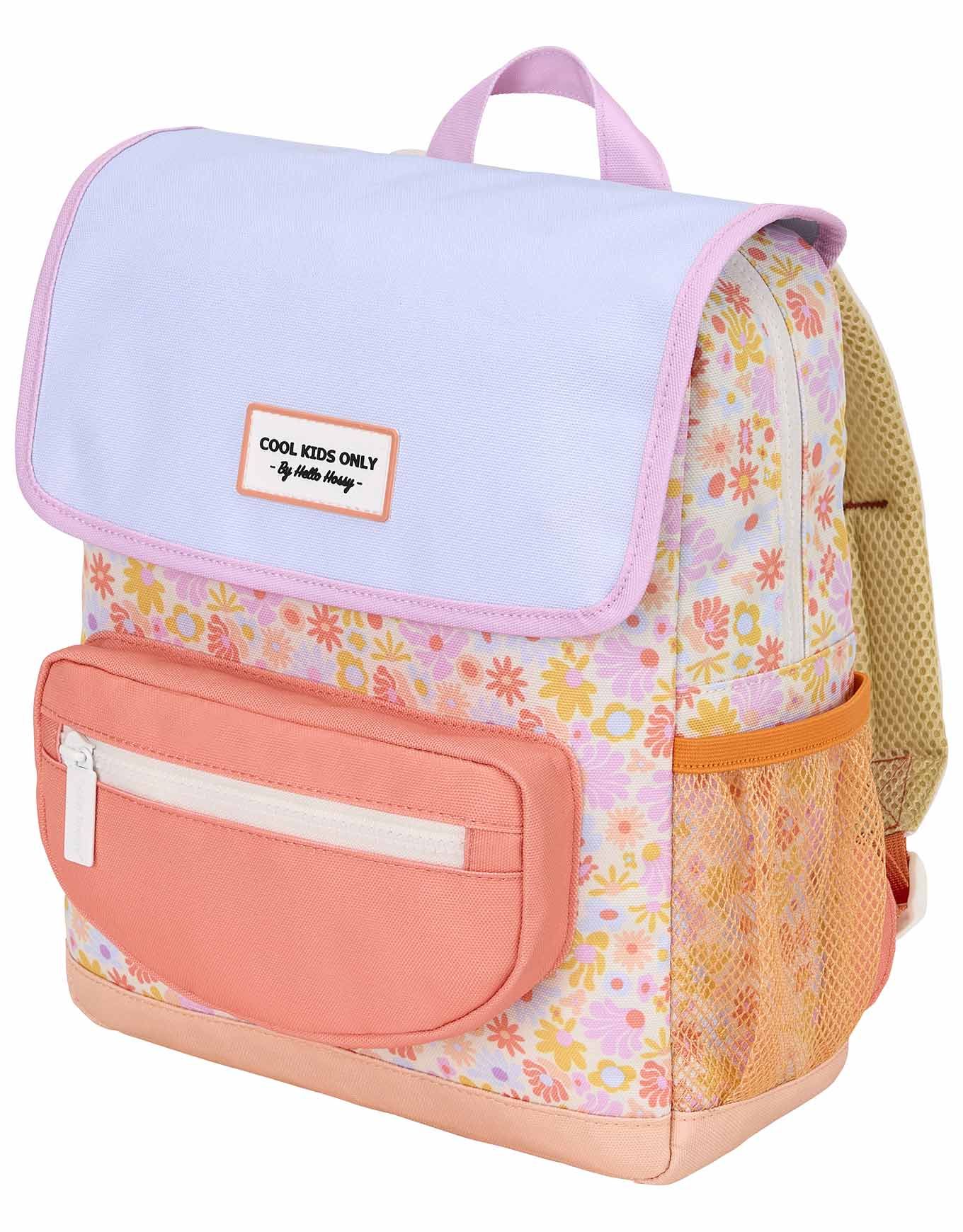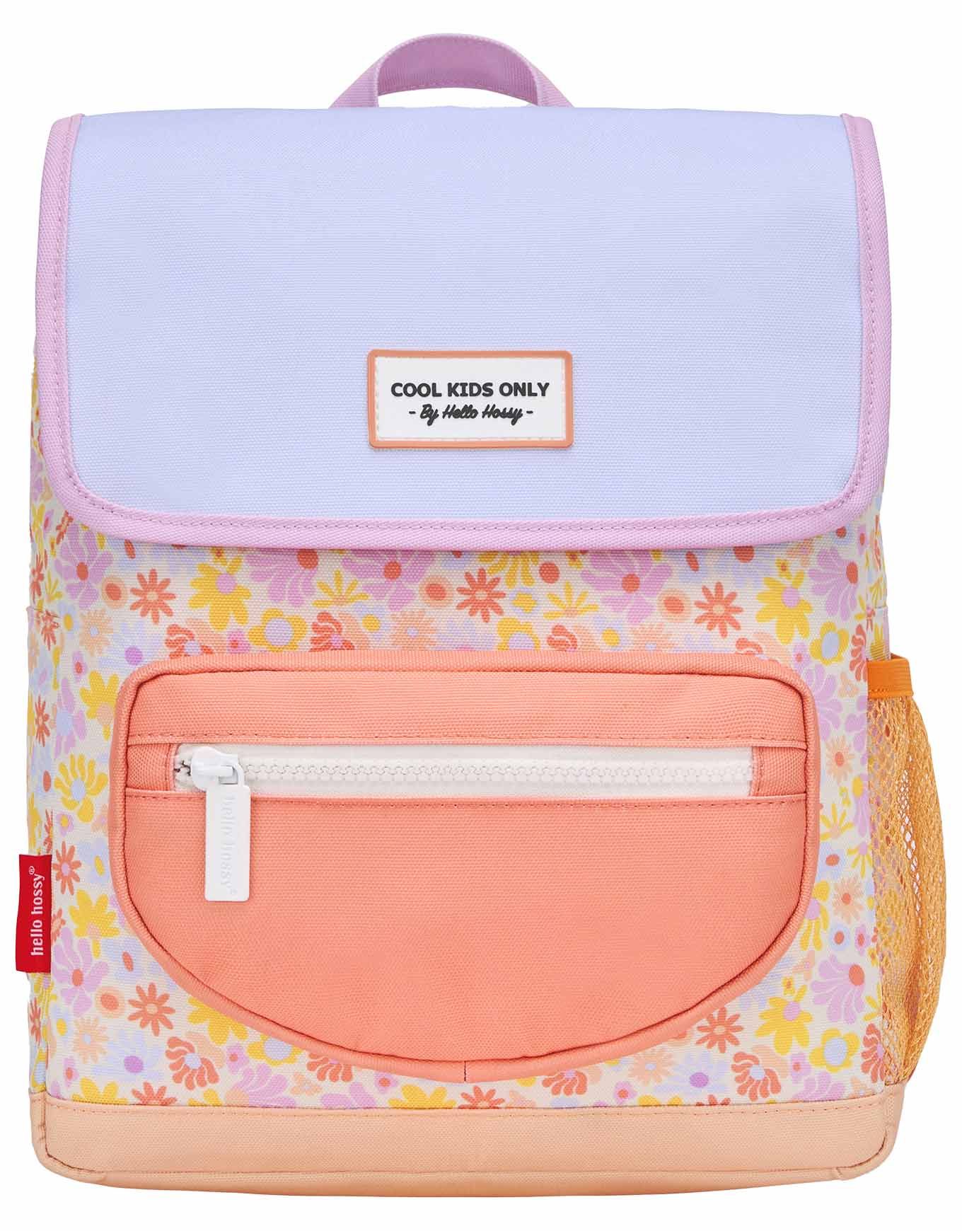 Cartable enfant Hello Hossy Retro Flower en matière 100 % écoresponsable, compartiment principal spacieux, poche zippée avant et porte-gourde intégré pour école et parc.