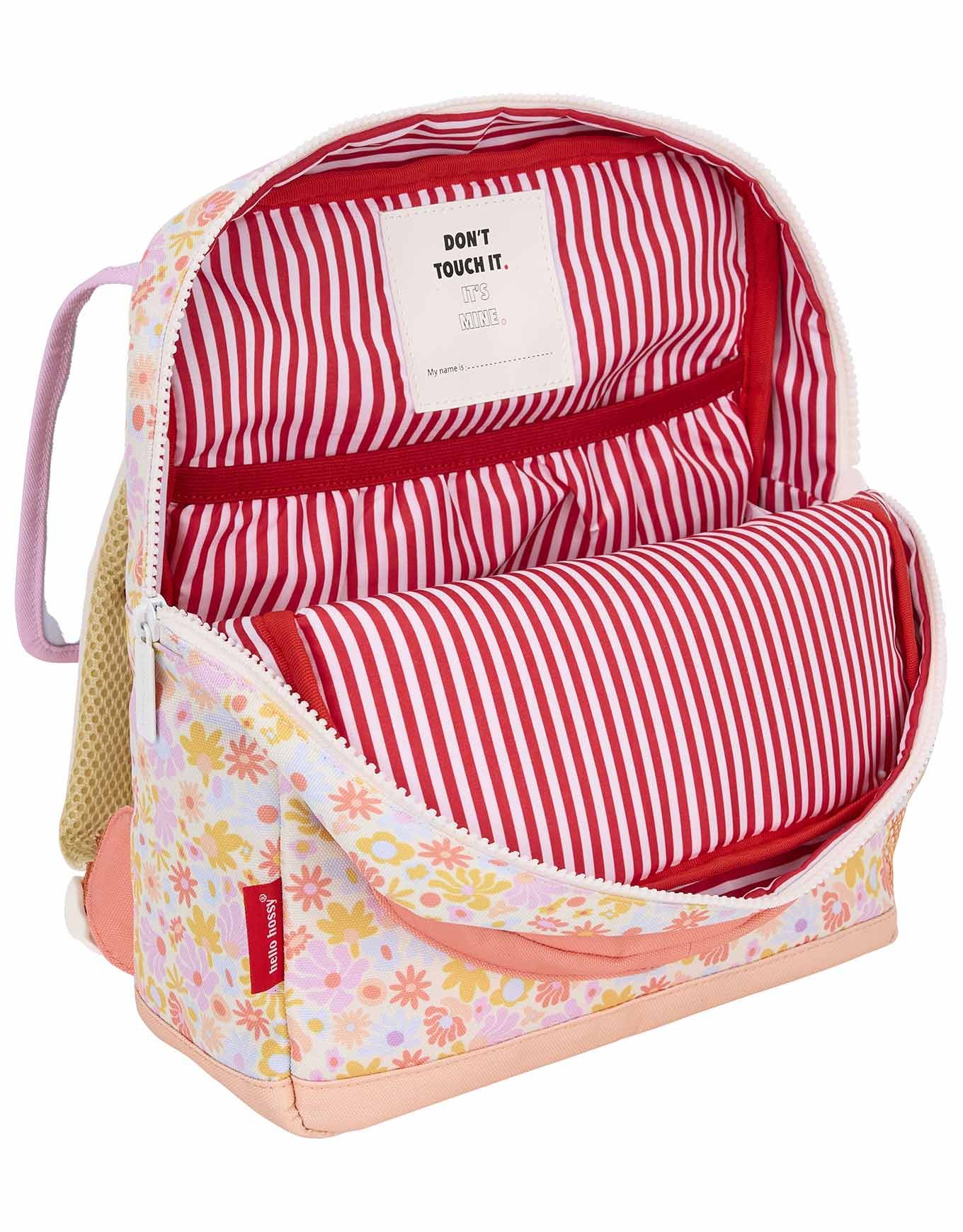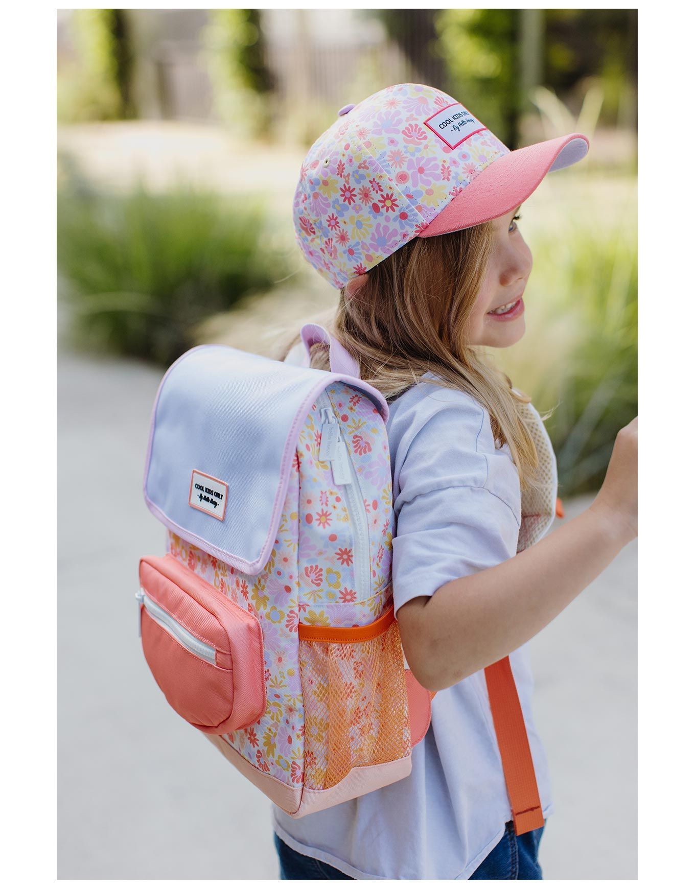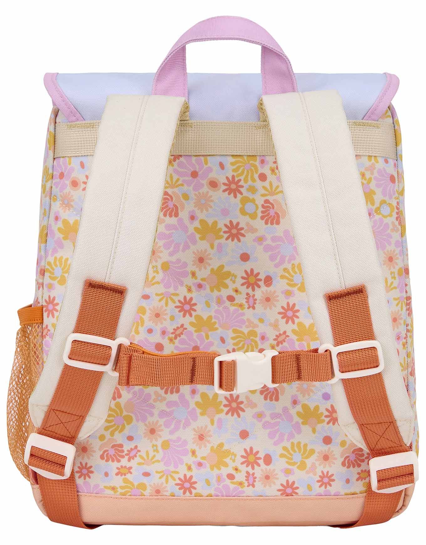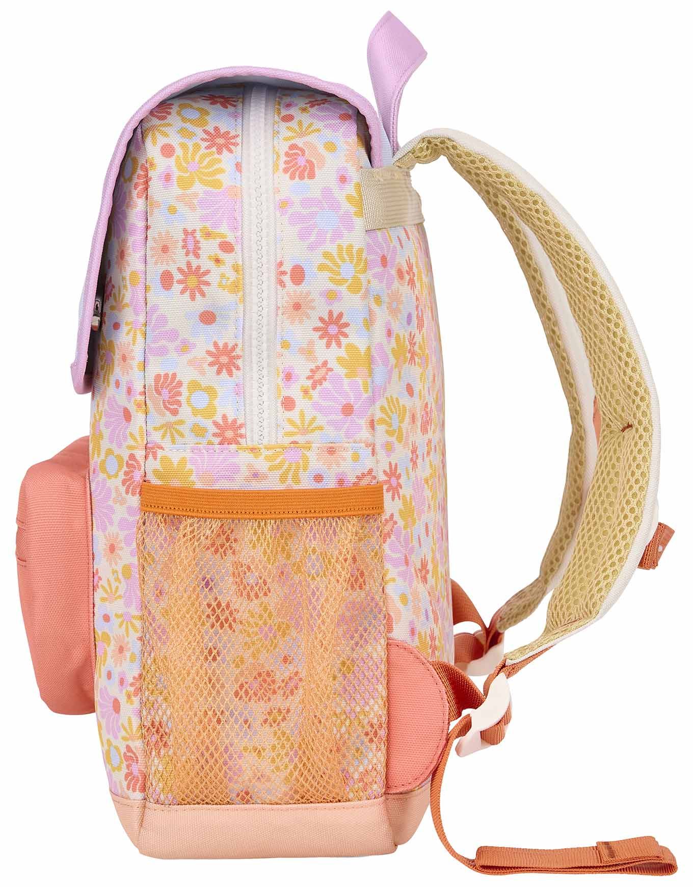 Cartable enfant Hello Hossy Retro Flower en matière 100 % écoresponsable, compartiment principal spacieux, poche zippée avant et porte-gourde intégré pour école et parc.
