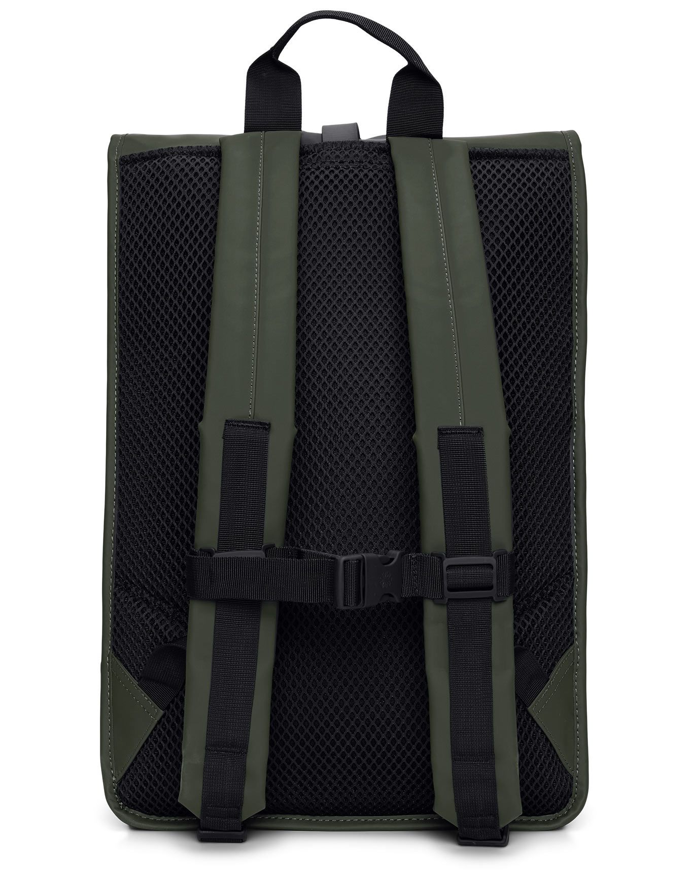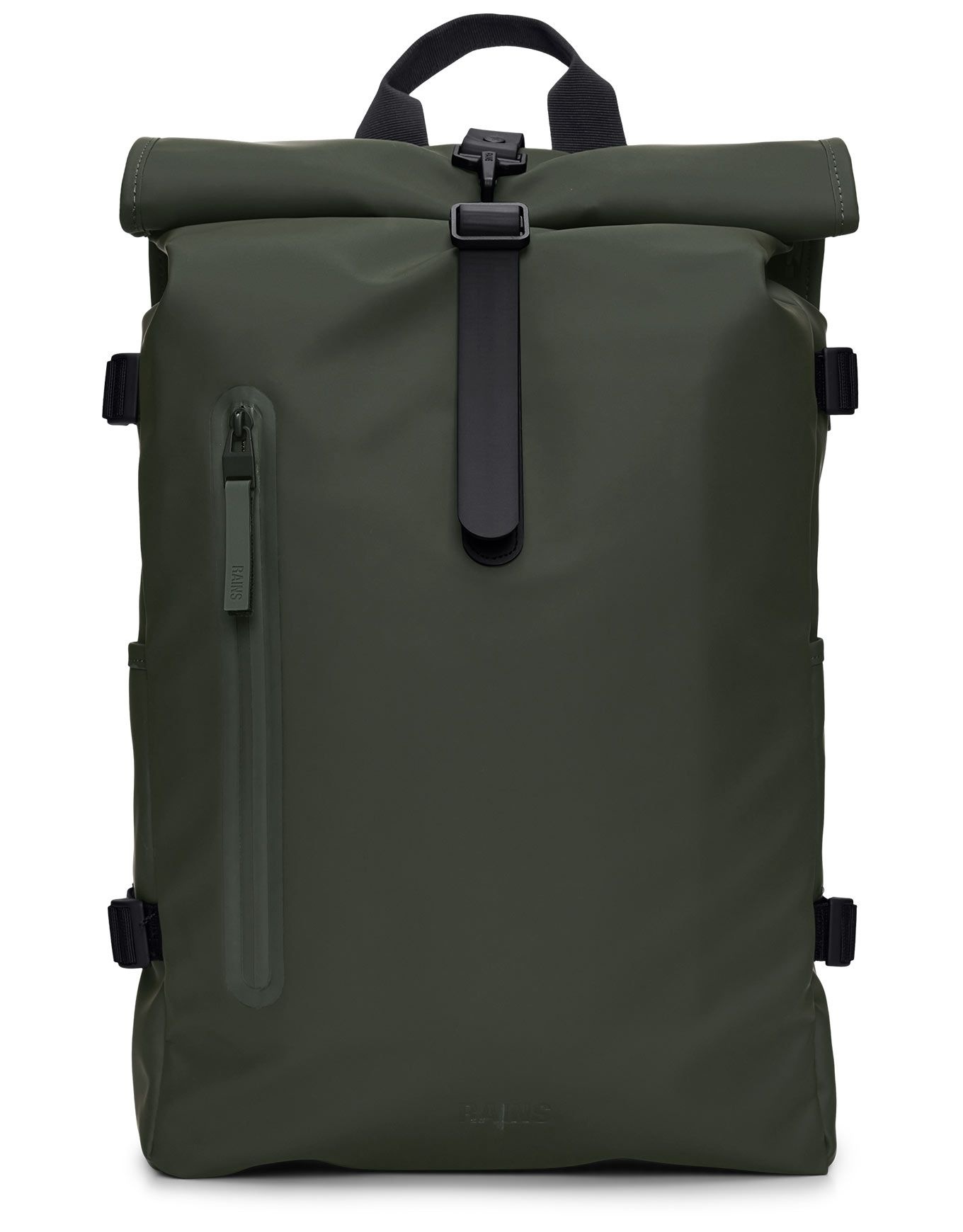 Sac à dos Rains Rolltop Rucksack Large W3 Green en tissu PU imperméable, fermeture roll-top, poche PC 16″, bretelles et dos matelassés, sangle ventrale ajustable pour un confort et une stabilité optimaux en ville ou à vélo.