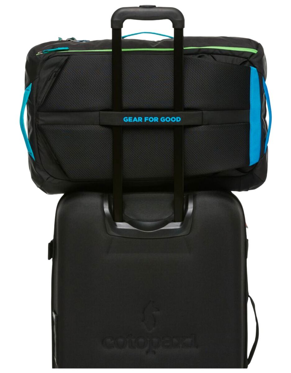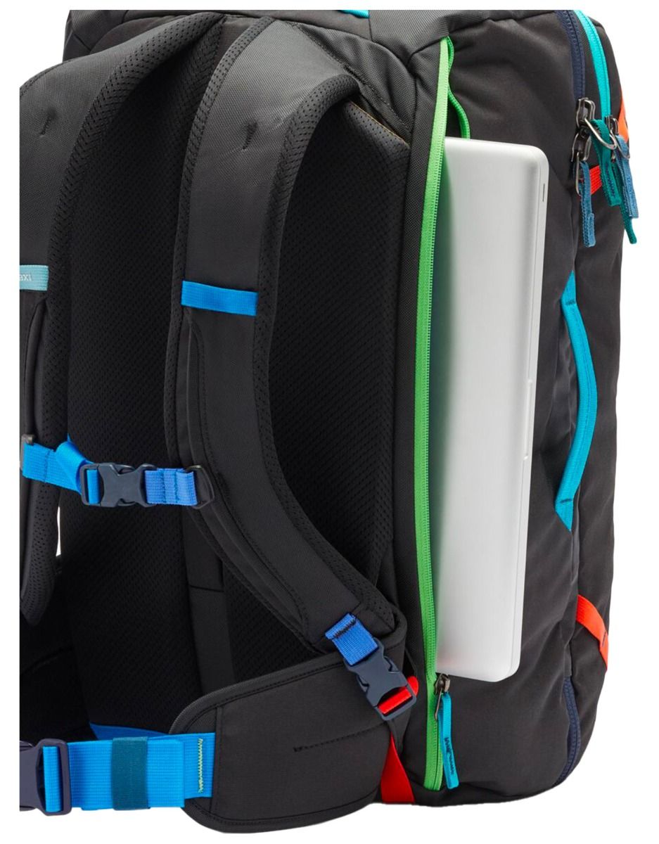 Le sac de voyage Cotopaxi Allpa 35L Travel Pack Del Día Dark, fabriqué en tissu 100 % recyclé aux Philippines, offre un accès valise complet, des bretelles ergonomiques amovibles, une ceinture de hanche et une housse polaire pour ordinateur 15″.