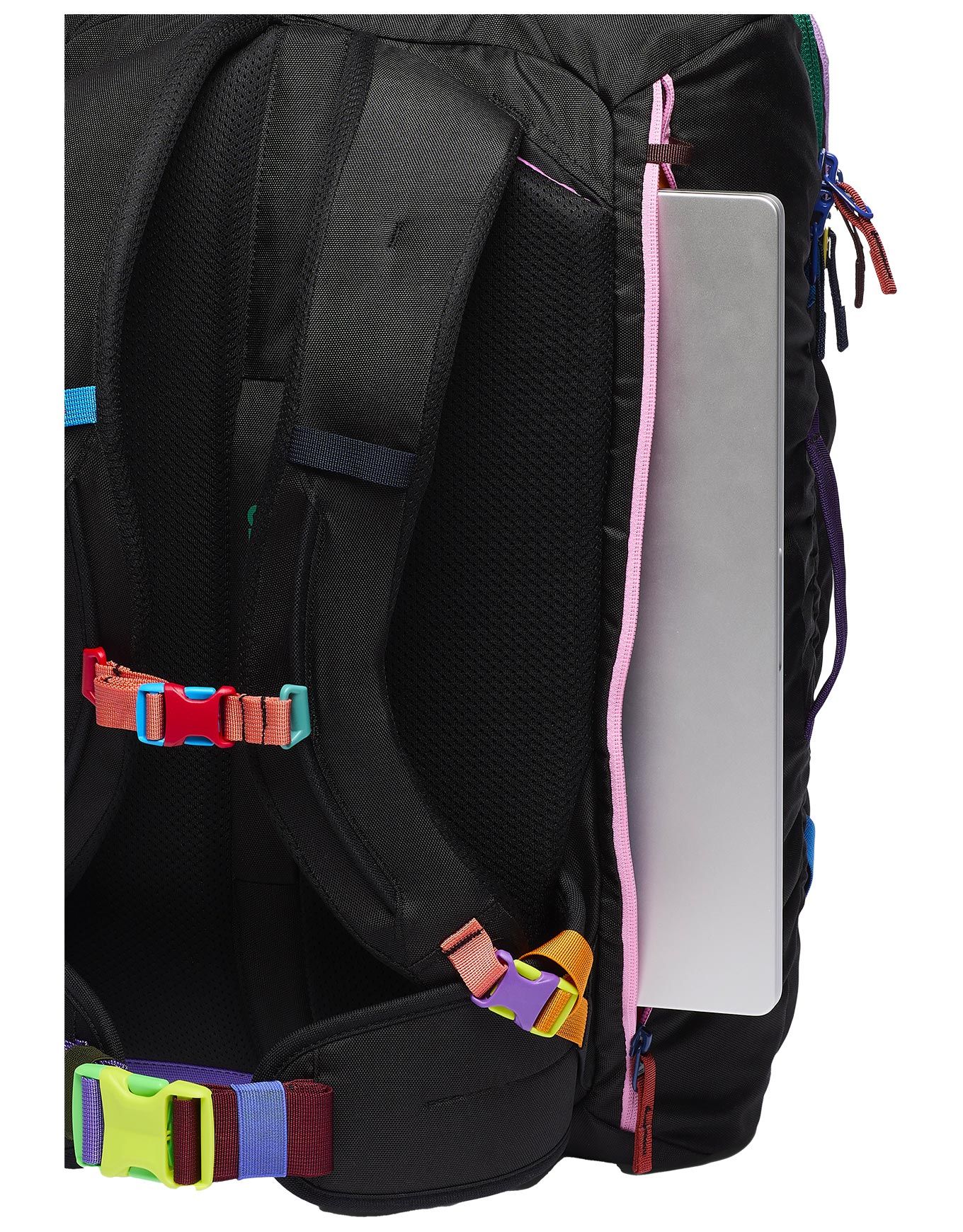 Sac de voyage Allpa 42L Travel Pack Del Día Dark de Cotopaxi en tissu 100 % recyclé, fabrication philippine unique, avec accès valise, poche laptop 15″, bretelles ergonomiques et ceinture hanche amovible.