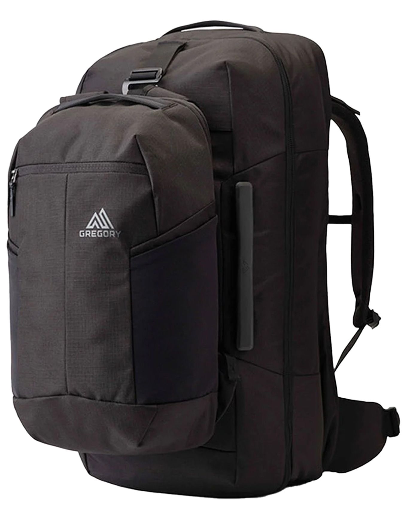 Le sac de voyage Gregory Border 50+15 Black Lichen combine un compartiment principal 50 L à ouverture valise et un sac à dos 15 L amovible, offrant modularité et organisation pour les grands voyageurs.