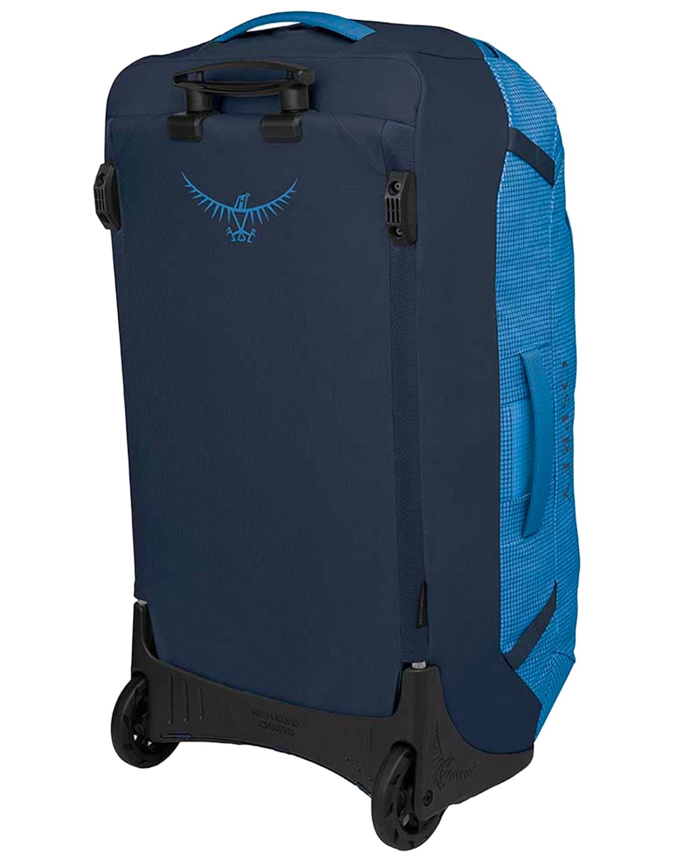 Sac de voyage à roulettes Osprey Rolling Transporter 90 Blue Fame/Scoria Blue, 90 L en nylon NanoTough™ 100 % recyclé bluesign®, chassis HighRoad™ et roues 110 mm pour maniabilité fluide sur tous terrains, accès principal sécurisé, poche laptop et sangles compression internes.