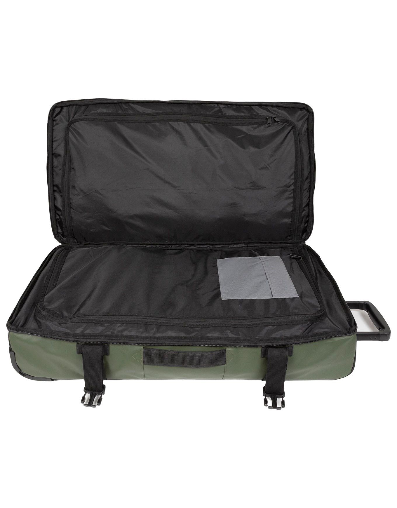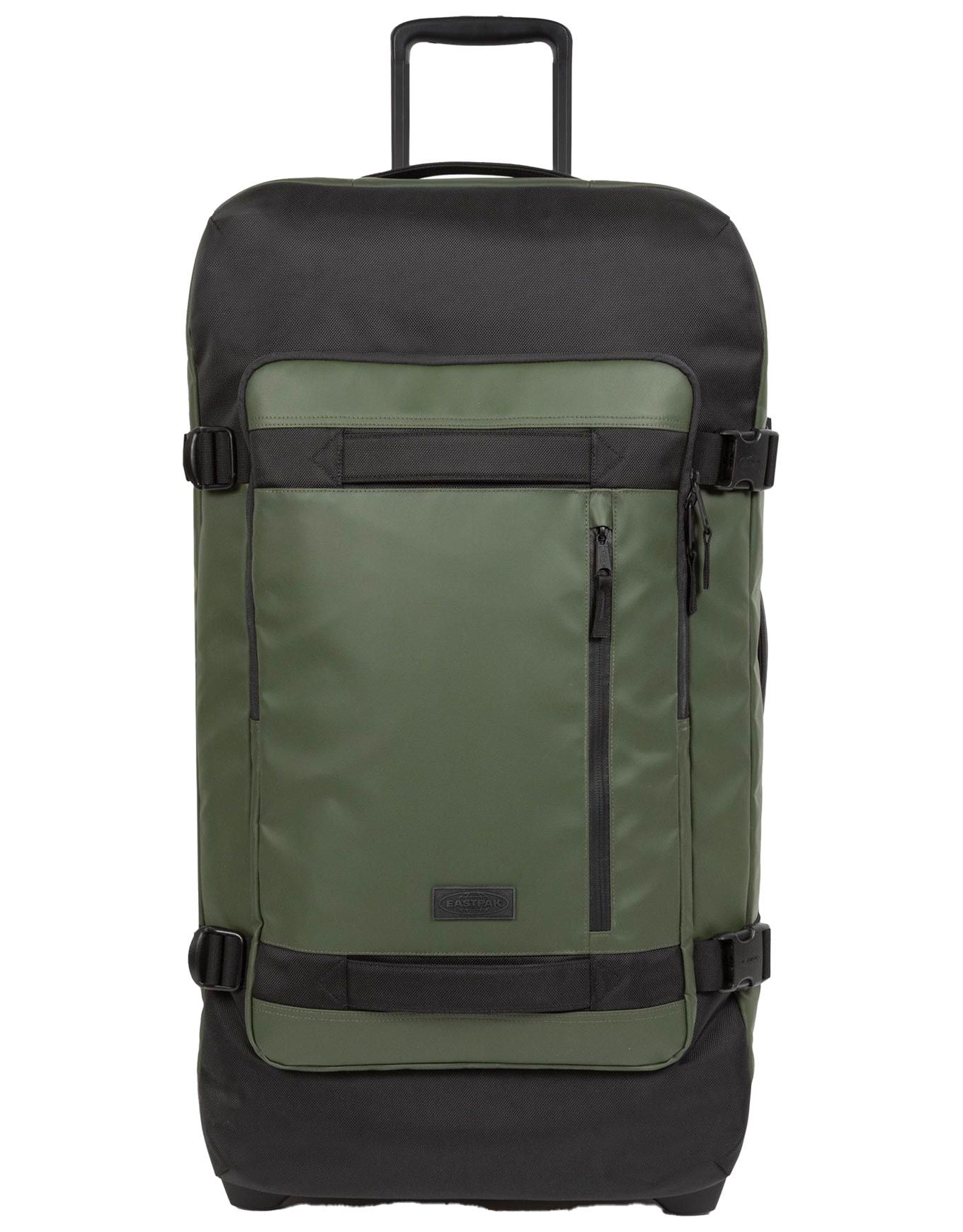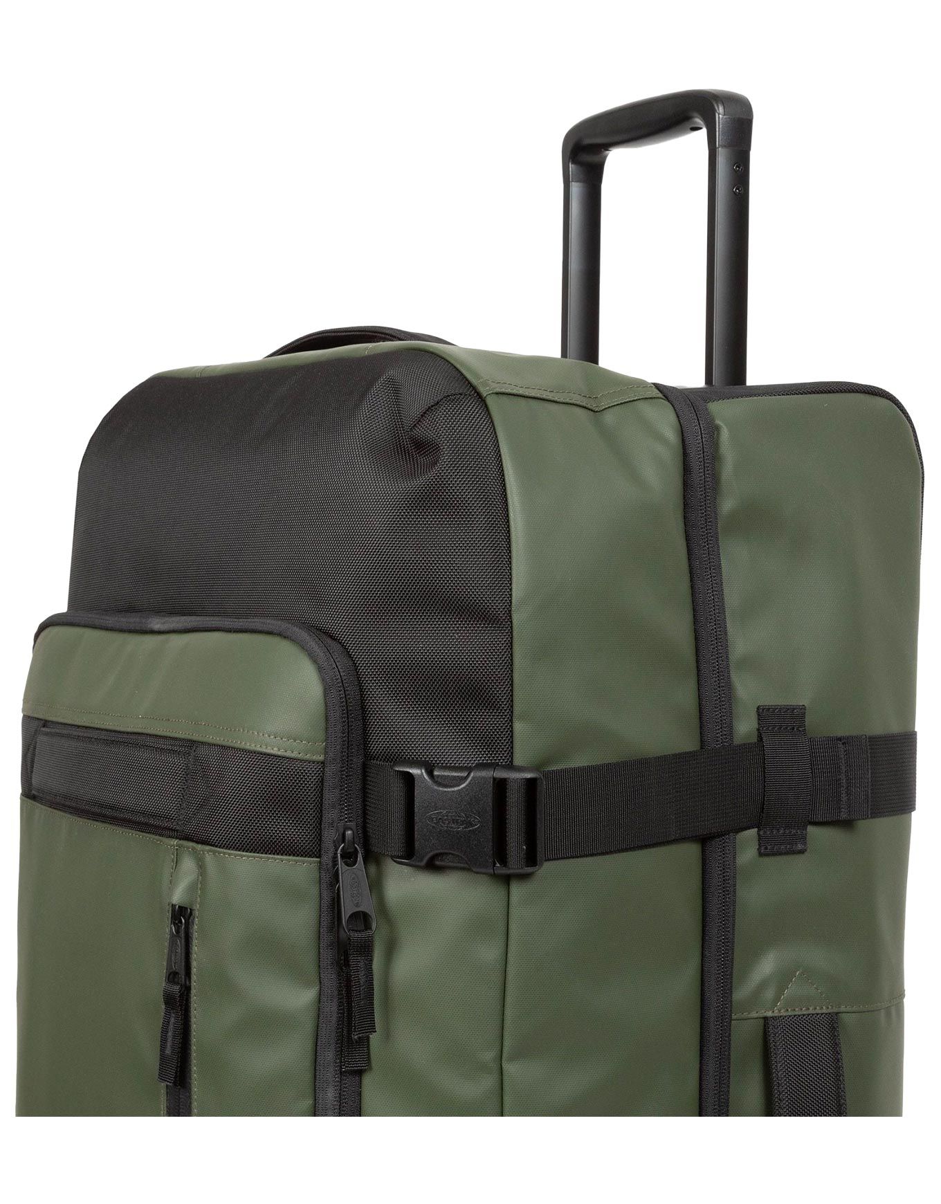Valise Eastpak Tranverz Cnnct L Cnnct Top Khaki 121 L, double compartiment, sangles compression, poignée télescopique, roulettes fluides, polyester résistant à l’eau, coins néoprène, cadenas TSA, se range à plat.