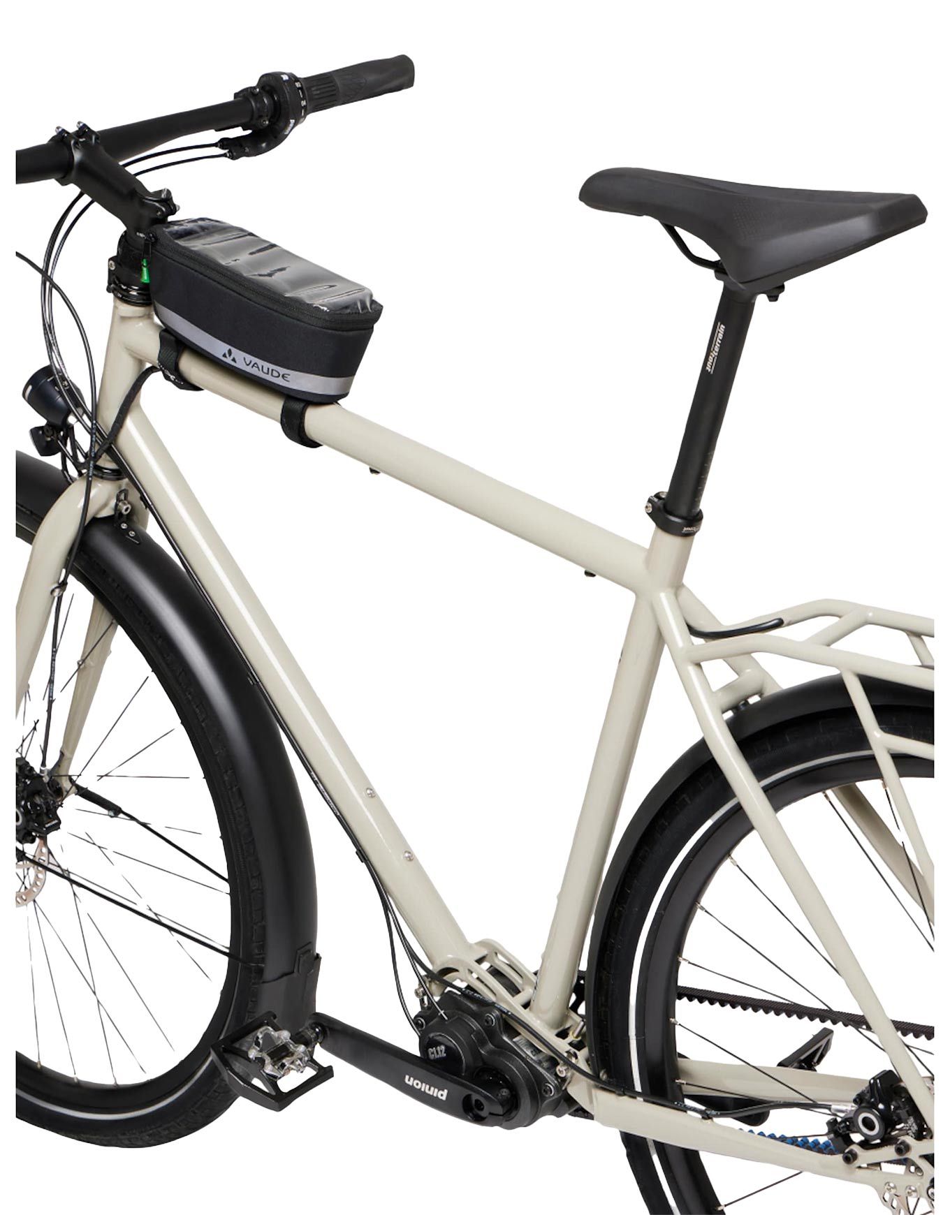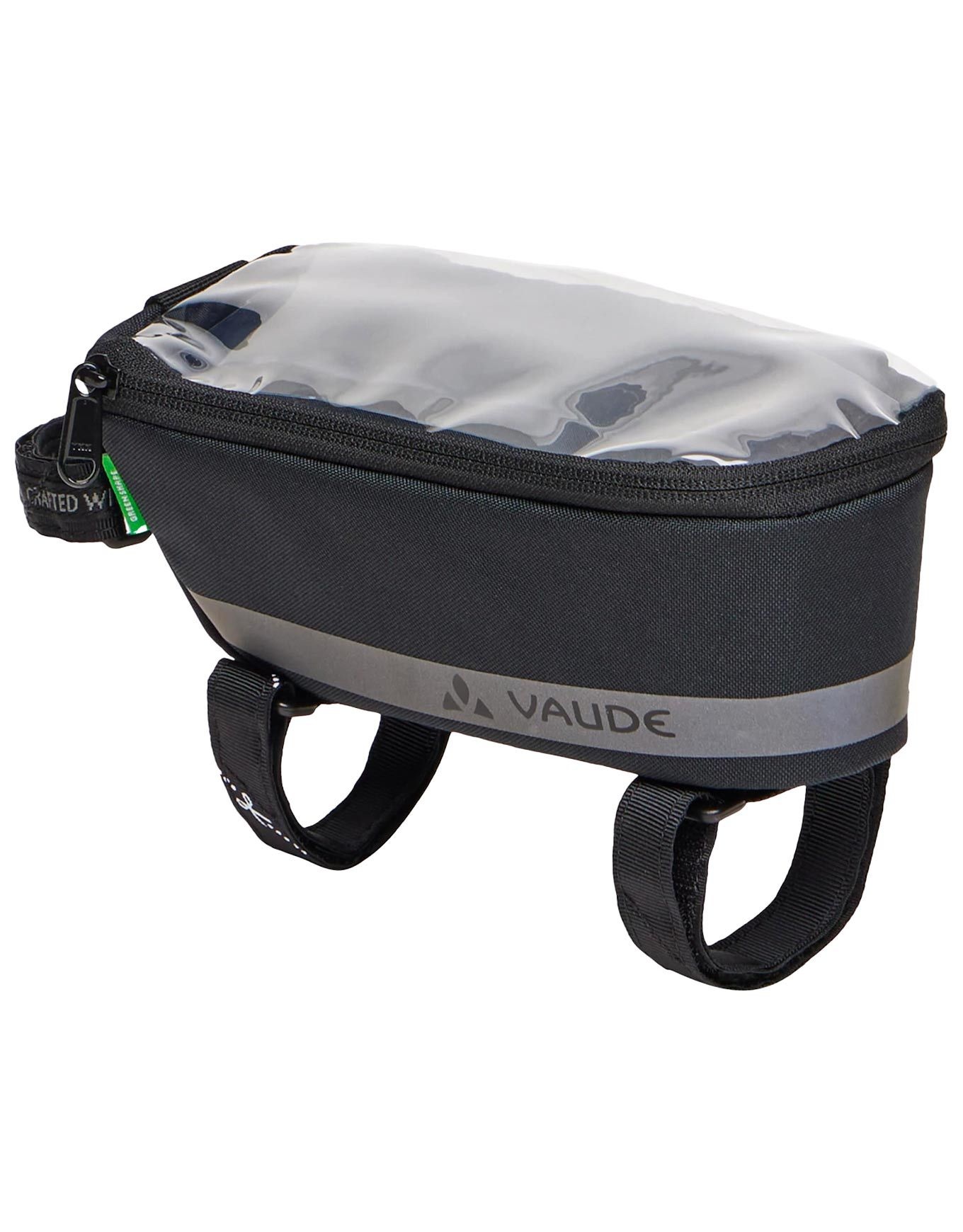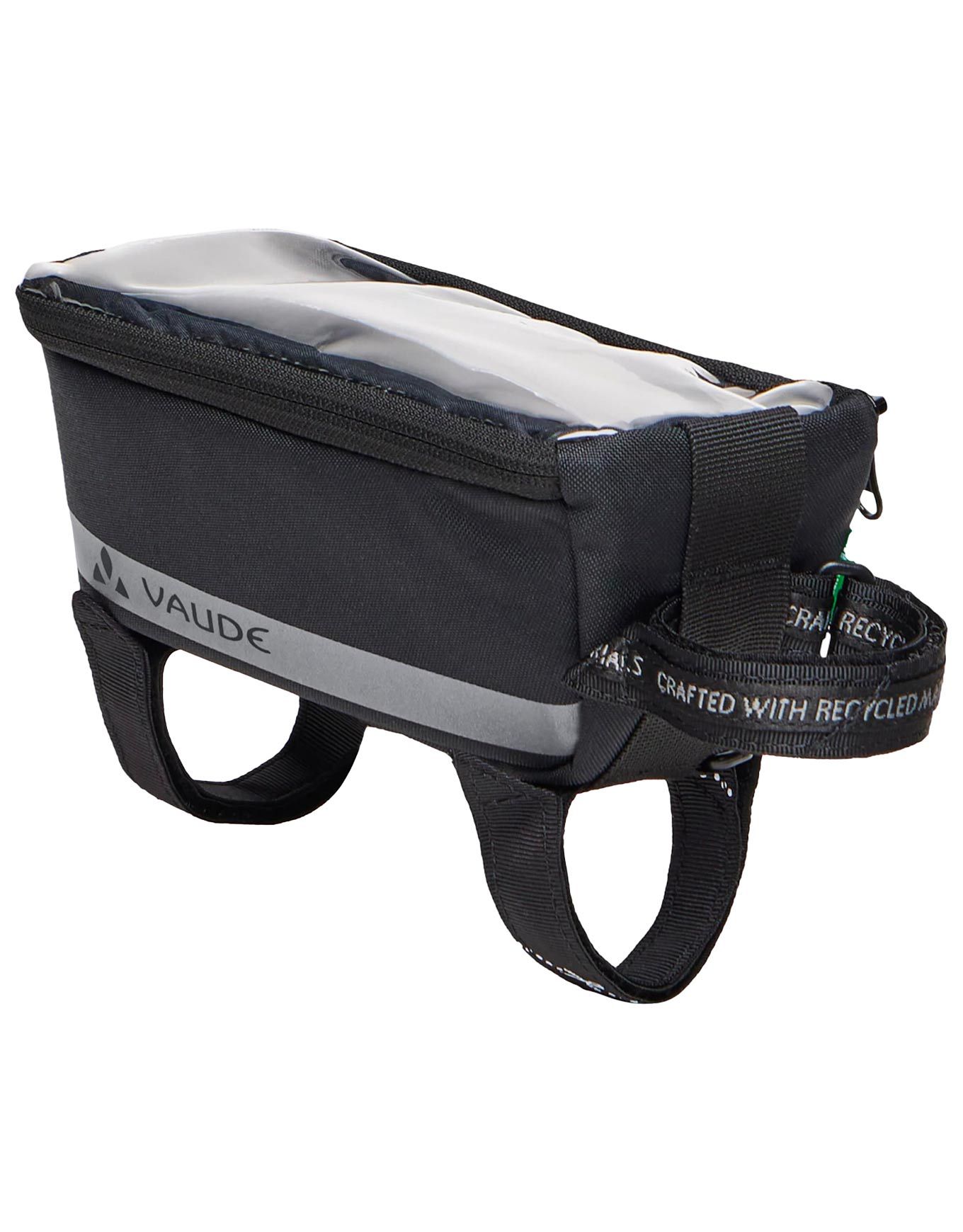 Sacoche de cadre Vaude Top Tube Phone Bag Black, 1 L, fixée par velcro sur le tube supérieur, poche smartphone transparente étanche, réfléchissants latéraux, revêtement Eco Finish déperlant écologique.