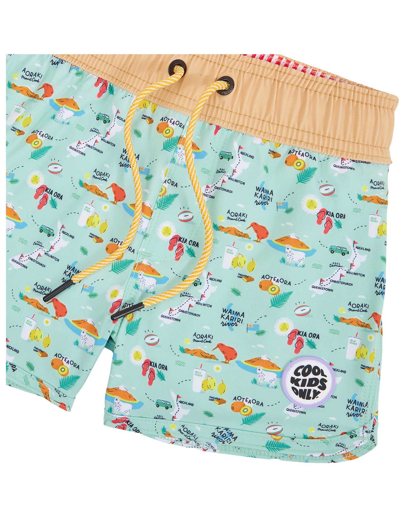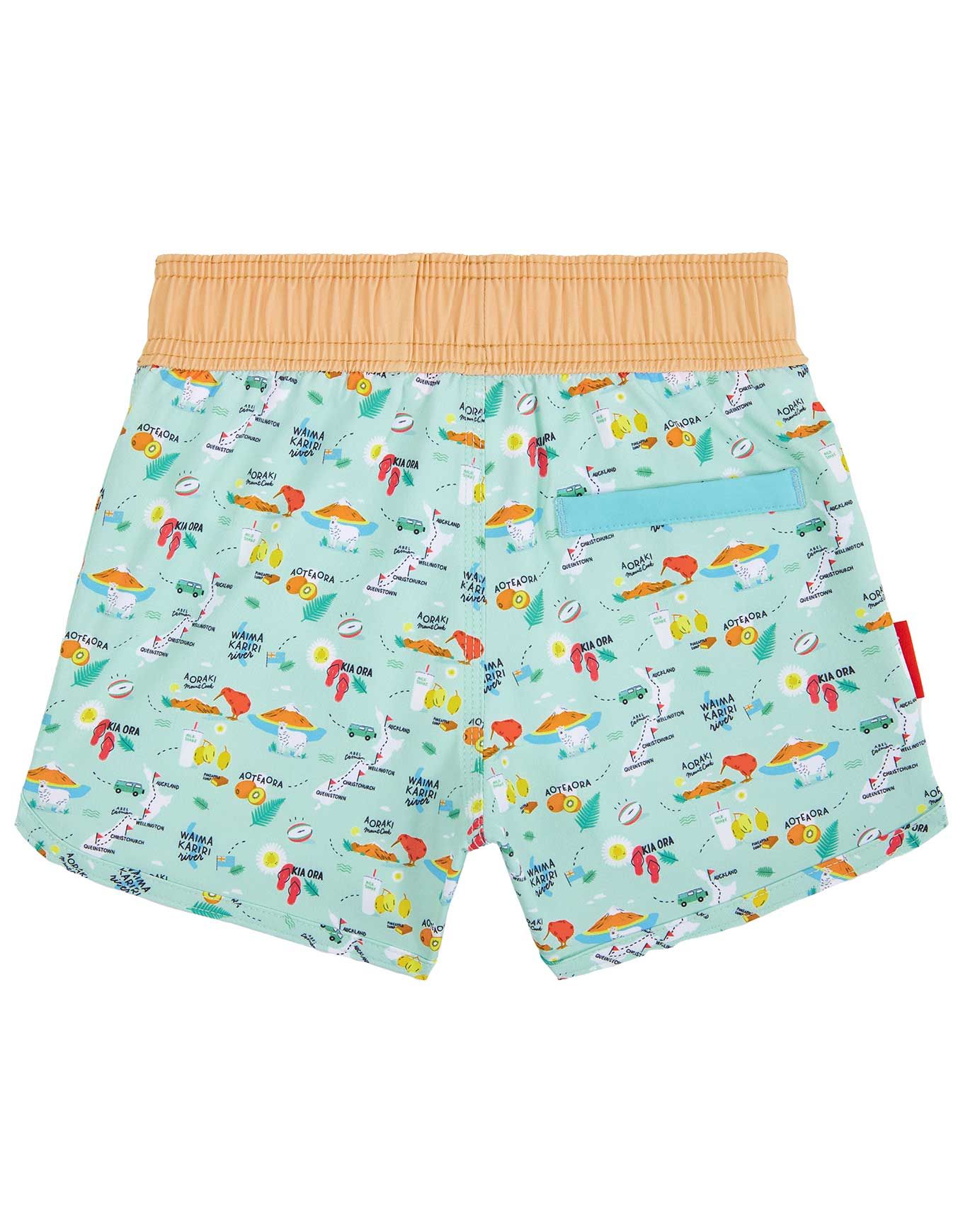 Le short de bain Hello Hossy New Zealand garçon allie look trendy et imprimé fun, avec taille élastiquée, filet intérieur et protection solaire UPF 50+ pour un confort optimal à chaque baignade.