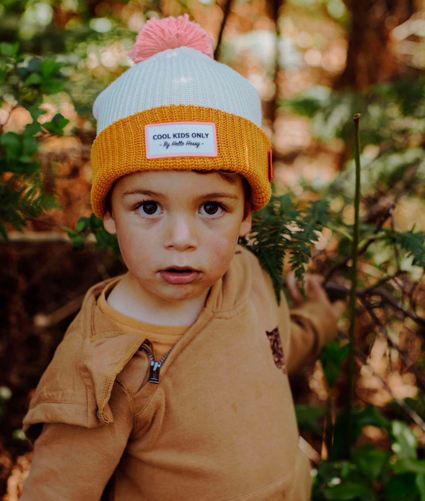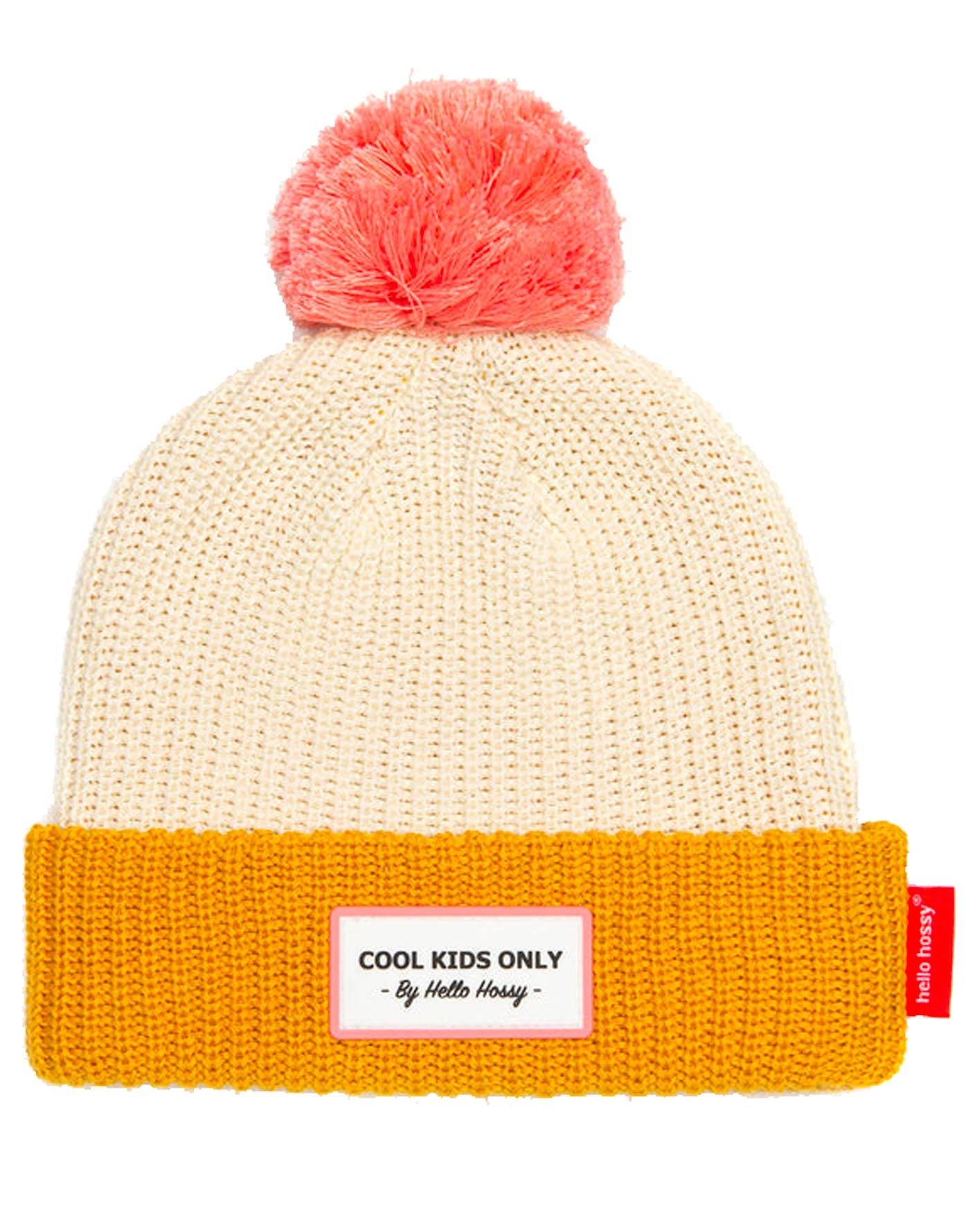 Bonnet Color Block Camel Hello Hossy enfant, doublure polaire pour une protection bien au chaud, coloris pétillants qui dynamisent l’hiver.